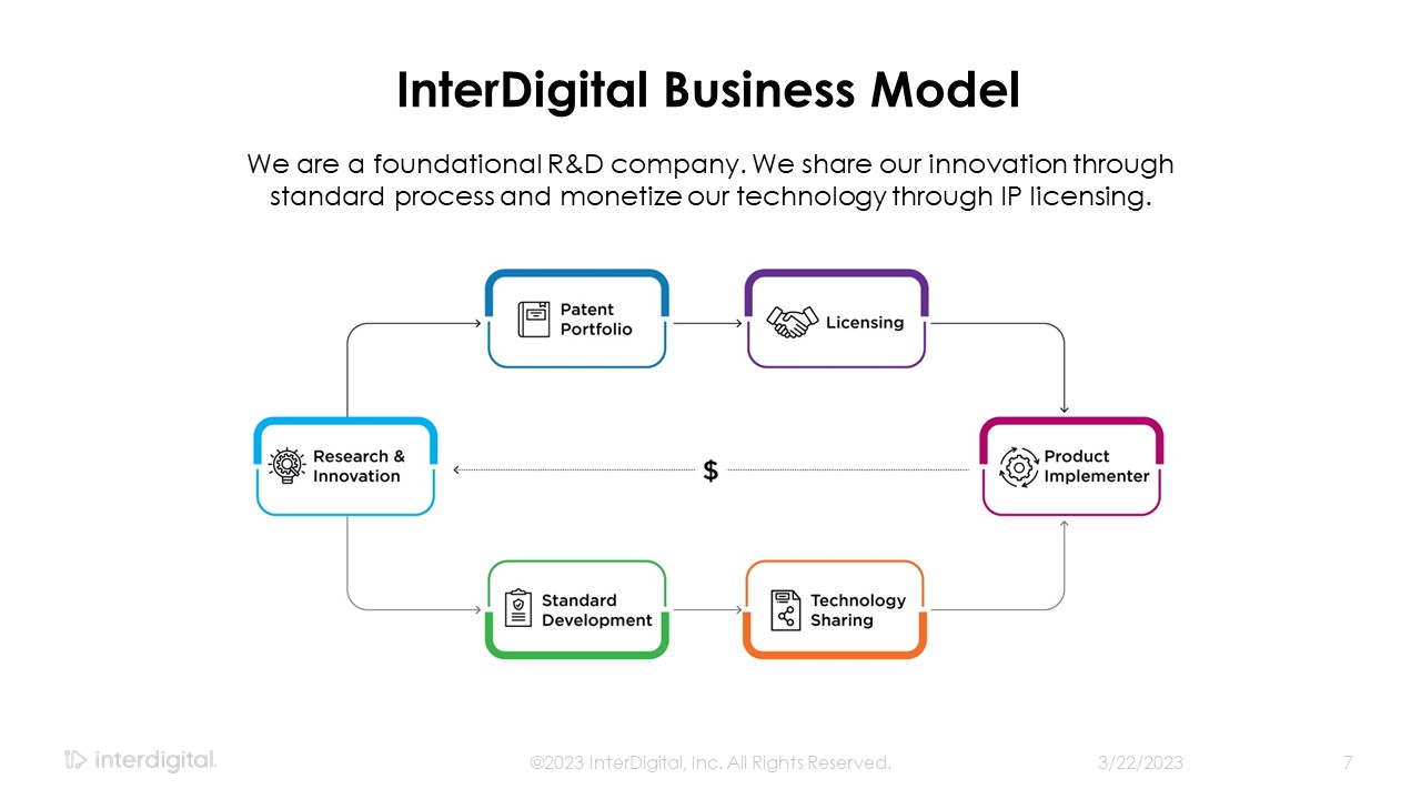 InterDigital Business Model  We are a foundational R&D company. We share our innovation through standard process and monetize our technology through IP licensing.  3/21/2023  ©2023 InterDigital, Inc. All Rights Reserved.  7