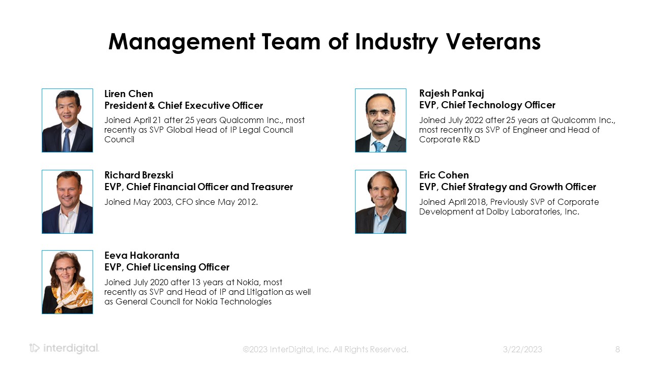 Management Team of Industry Veterans   3/21/2023  ©2023 InterDigital, Inc. All Rights Reserved.  8  Joined April 21 after 25 years Qualcomm Inc., most recently as SVP Global Head of IP Legal Council   Council   Joined May 2003, CFO since May 2012.   Joined July 2022 after 25 years at Qualcomm Inc., most recently as SVP of Engineer and Head of Corporate R&D   Joined April 2018, Previously SVP of Corporate Development at Dolby Laboratories, Inc.   Liren Chen  President & Chief Executive Officer   Richard Brezski   EVP, Chief Financial Officer and Treasurer   Joined July 2020 after 13 years at Nokia, most recently as SVP and Head of IP and Litigation as well as General Council for Nokia Technologies  Eeva Hakoranta  EVP, Chief Licensing Officer  Rajesh Pankaj  EVP, Chief Technology Officer   Eric Cohen  EVP, Chief Strategy and Growth Officer