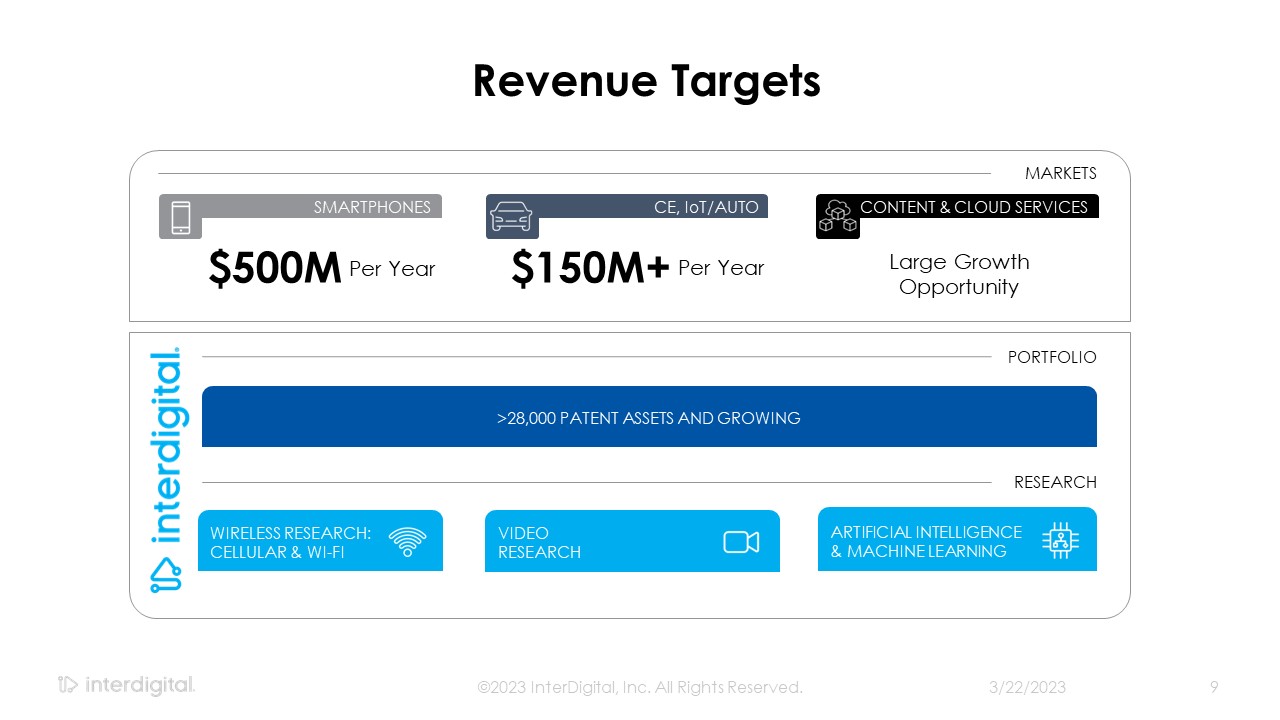 3/21/2023  ©2023 InterDigital, Inc. All Rights Reserved.  9  Revenue Targets  $500M  Per Year  $150M+  Per Year  Large Growth Opportunity  SMARTPHONES  CE, IoT/AUTO  CONTENT & CLOUD SERVICES  PORTFOLIO  RESEARCH  >28,000 PATENT ASSETS AND GROWING   MARKETS  WIRELESS RESEARCH: CELLULAR & WI-FI  VIDEO   RESEARCH  ARTIFICIAL INTELLIGENCE & MACHINE LEARNING