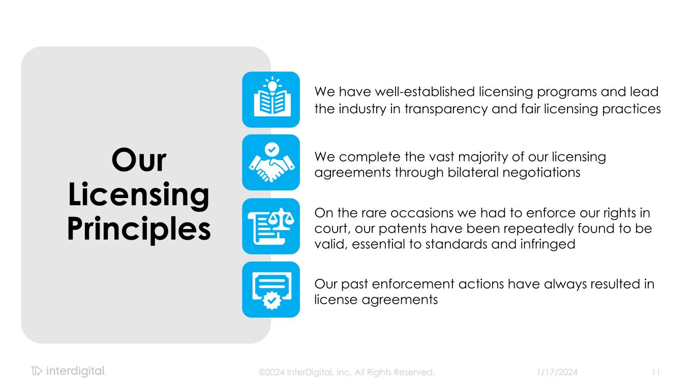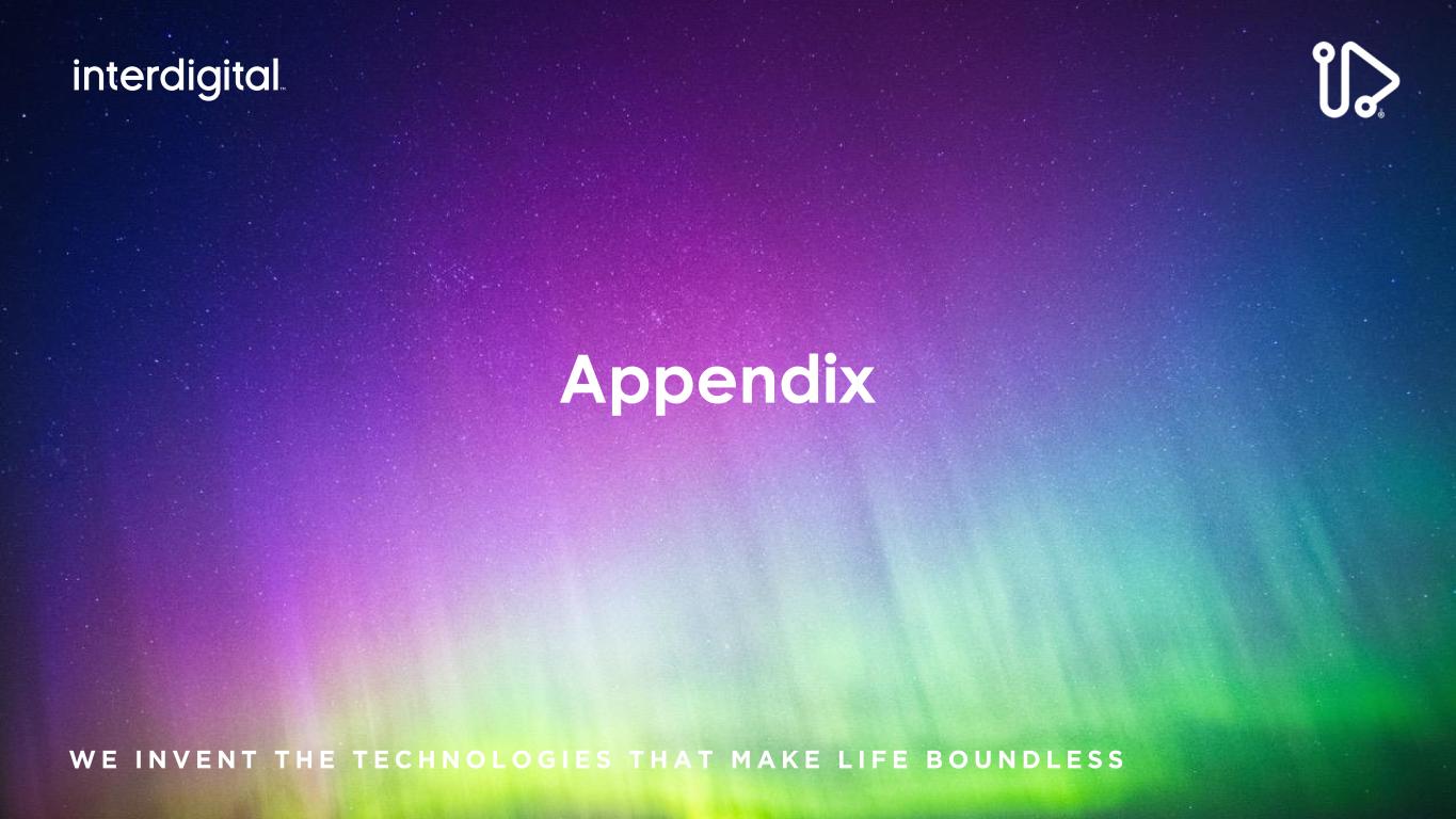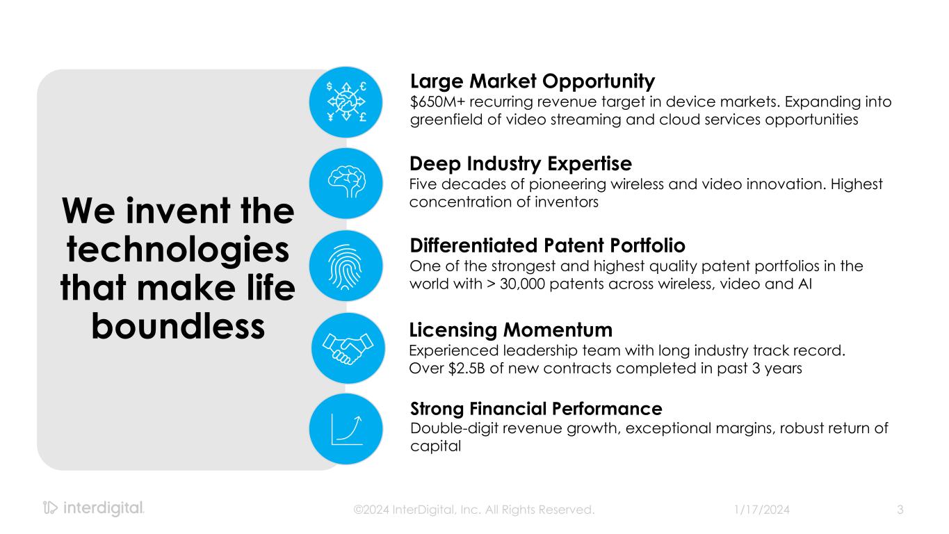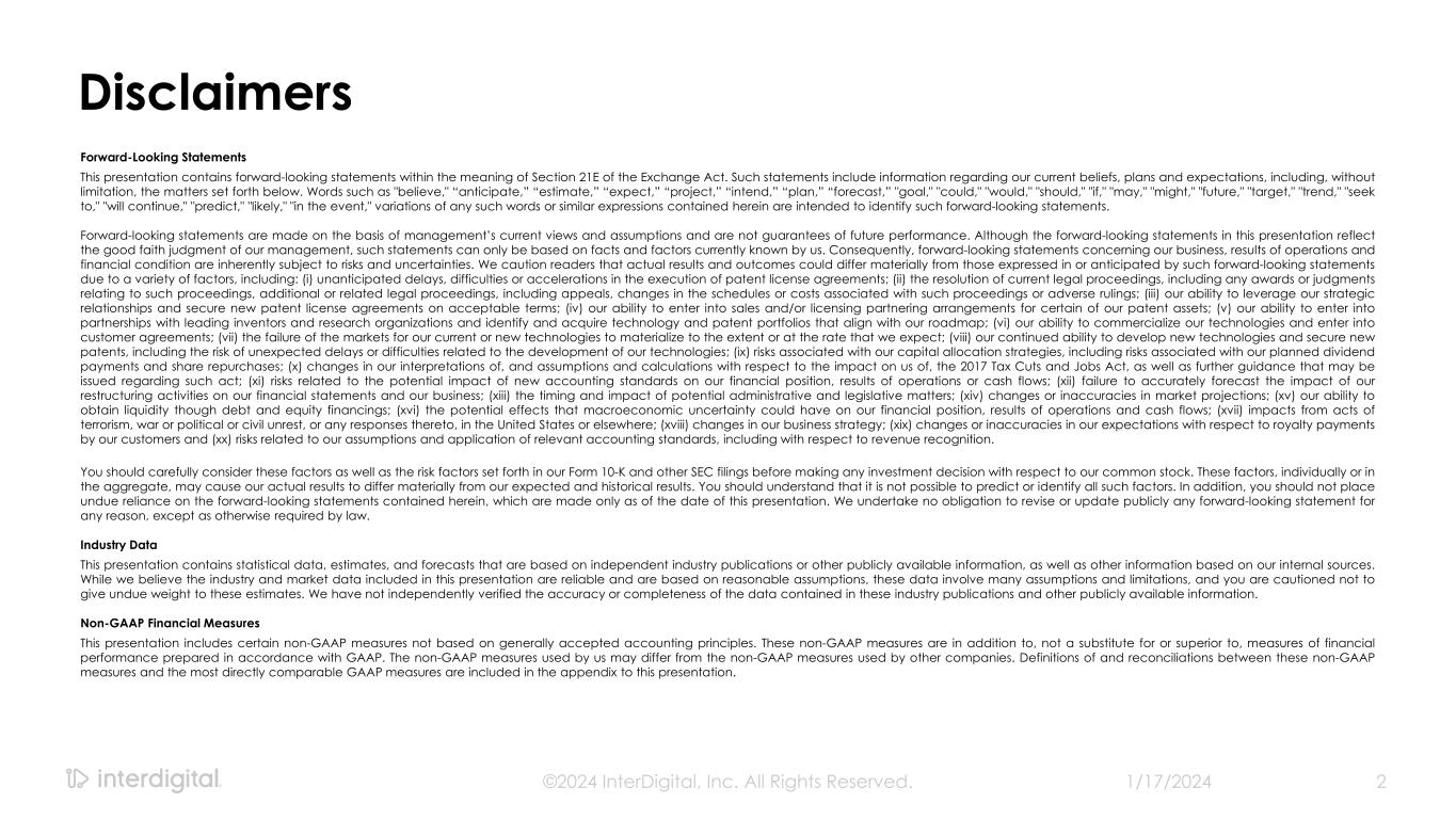 1/17/2024©2024 InterDigital, Inc. All Rights Reserved. 2 Disclaimers Forward-Looking Statements This presentation contains forward-looking statements within the meaning of Section 21E of the Exchange Act. Such statements include information regarding our current beliefs, plans and expectations, including, without limitation, the matters set forth below. Words such as "believe," “anticipate,” “estimate,” “expect,” “project,” “intend,” “plan,” “forecast,” "goal," "could," "would," "should," "if," "may," "might," "future," "target," "trend," "seek to," "will continue," "predict," "likely," "in the event," variations of any such words or similar expressions contained herein are intended to identify such forward-looking statements. Forward-looking statements are made on the basis of management’s current views and assumptions and are not guarantees of future performance. Although the forward-looking statements in this presentation reflect the good faith judgment of our management, such statements can only be based on facts and factors currently known by us. Consequently, forward-looking statements concerning our business, results of operations and financial condition are inherently subject to risks and uncertainties. We caution readers that actual results and outcomes could differ materially from those expressed in or anticipated by such forward-looking statements due to a variety of factors, including: (i) unanticipated delays, difficulties or accelerations in the execution of patent license agreements; (ii) the resolution of current legal proceedings, including any awards or judgments relating to such proceedings, additional or related legal proceedings, including appeals, changes in the schedules or costs associated with such proceedings or adverse rulings; (iii) our ability to leverage our strategic relationships and secure new patent license agreements on acceptable terms; (iv) our ability to enter into sales and/or licensing partnering arrangements for certain of our patent assets; (v) our ability to enter into partnerships with leading inventors and research organizations and identify and acquire technology and patent portfolios that align with our roadmap; (vi) our ability to commercialize our technologies and enter into customer agreements; (vii) the failure of the markets for our current or new technologies to materialize to the extent or at the rate that we expect; (viii) our continued ability to develop new technologies and secure new patents, including the risk of unexpected delays or difficulties related to the development of our technologies; (ix) risks associated with our capital allocation strategies, including risks associated with our planned dividend payments and share repurchases; (x) changes in our interpretations of, and assumptions and calculations with respect to the impact on us of, the 2017 Tax Cuts and Jobs Act, as well as further guidance that may be issued regarding such act; (xi) risks related to the potential impact of new accounting standards on our financial position, results of operations or cash flows; (xii) failure to accurately forecast the impact of our restructuring activities on our financial statements and our business; (xiii) the timing and impact of potential administrative and legislative matters; (xiv) changes or inaccuracies in market projections; (xv) our ability to obtain liquidity though debt and equity financings; (xvi) the potential effects that macroeconomic uncertainty could have on our financial position, results of operations and cash flows; (xvii) impacts from acts of terrorism, war or political or civil unrest, or any responses thereto, in the United States or elsewhere; (xviii) changes in our business strategy; (xix) changes or inaccuracies in our expectations with respect to royalty payments by our customers and (xx) risks related to our assumptions and application of relevant accounting standards, including with respect to revenue recognition. You should carefully consider these factors as well as the risk factors set forth in our Form 10-K and other SEC filings before making any investment decision with respect to our common stock. These factors, individually or in the aggregate, may cause our actual results to differ materially from our expected and historical results. You should understand that it is not possible to predict or identify all such factors. In addition, you should not place undue reliance on the forward-looking statements contained herein, which are made only as of the date of this presentation. We undertake no obligation to revise or update publicly any forward-looking statement for any reason, except as otherwise required by law. Industry Data This presentation contains statistical data, estimates, and forecasts that are based on independent industry publications or other publicly available information, as well as other information based on our internal sources. While we believe the industry and market data included in this presentation are reliable and are based on reasonable assumptions, these data involve many assumptions and limitations, and you are cautioned not to give undue weight to these estimates. We have not independently verified the accuracy or completeness of the data contained in these industry publications and other publicly available information. Non-GAAP Financial Measures This presentation includes certain non-GAAP measures not based on generally accepted accounting principles. These non-GAAP measures are in addition to, not a substitute for or superior to, measures of financial performance prepared in accordance with GAAP. The non-GAAP measures used by us may differ from the non-GAAP measures used by other companies. Definitions of and reconciliations between these non-GAAP measures and the most directly comparable GAAP measures are included in the appendix to this presentation.
