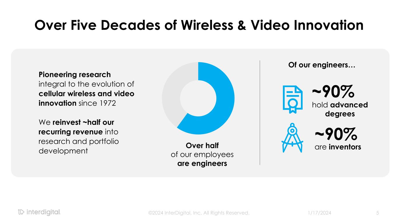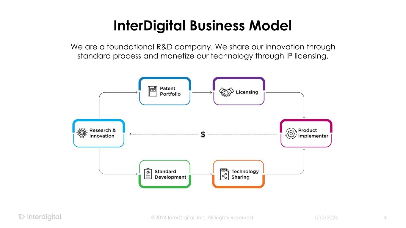 InterDigital Business Model We are a foundational R&D company. We share our innovation through standard process and monetize our technology through IP licensing. 1/17/2024©2024 InterDigital, Inc. All Rights Reserved. 4