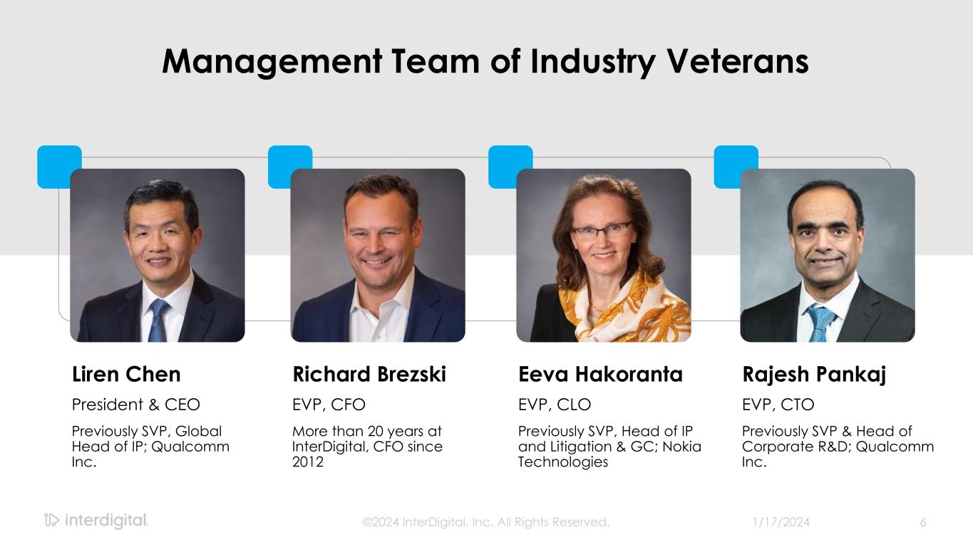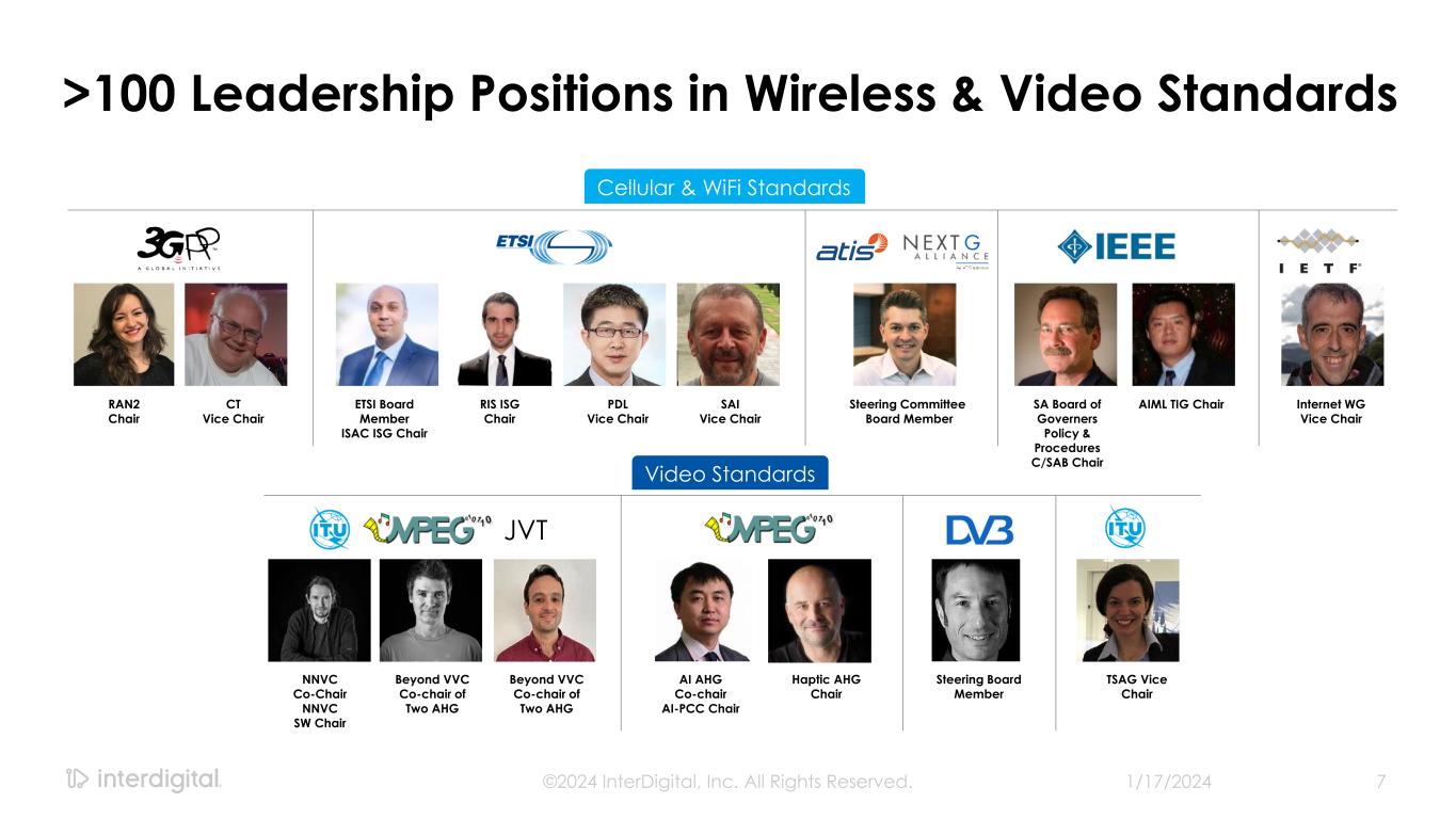 Management Team of Industry Veterans Liren Chen President & CEO Previously SVP, Global Head of IP; Qualcomm Inc. Richard Brezski EVP, CFO More than 20 years at InterDigital, CFO since 2012 Eeva Hakoranta EVP, CLO Previously SVP, Head of IP and Litigation & GC; Nokia Technologies Rajesh Pankaj EVP, CTO Previously SVP & Head of Corporate R&D; Qualcomm Inc. 1/17/2024©2024 InterDigital, Inc. All Rights Reserved. 6