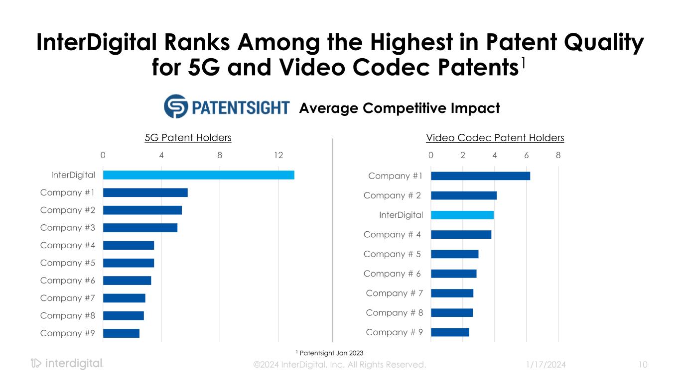 Average Competitive Impact InterDigital Ranks Among the Highest in Patent Quality for 5G and Video Codec Patents1 1/17/2024©2024 InterDigital, Inc. All Rights Reserved. 10 0 4 8 12 InterDigital Company #1 Company #2 Company #3 Company #4 Company #5 Company #6 Company #7 Company #8 Company #9 0 2 4 6 8 Company # 9 Company # 8 Company # 7 Company # 6 Company # 5 Company # 4 InterDigital Company # 2 Company #1 Video Codec Patent Holders 5G Patent Holders 1 Patentsight Jan 2023