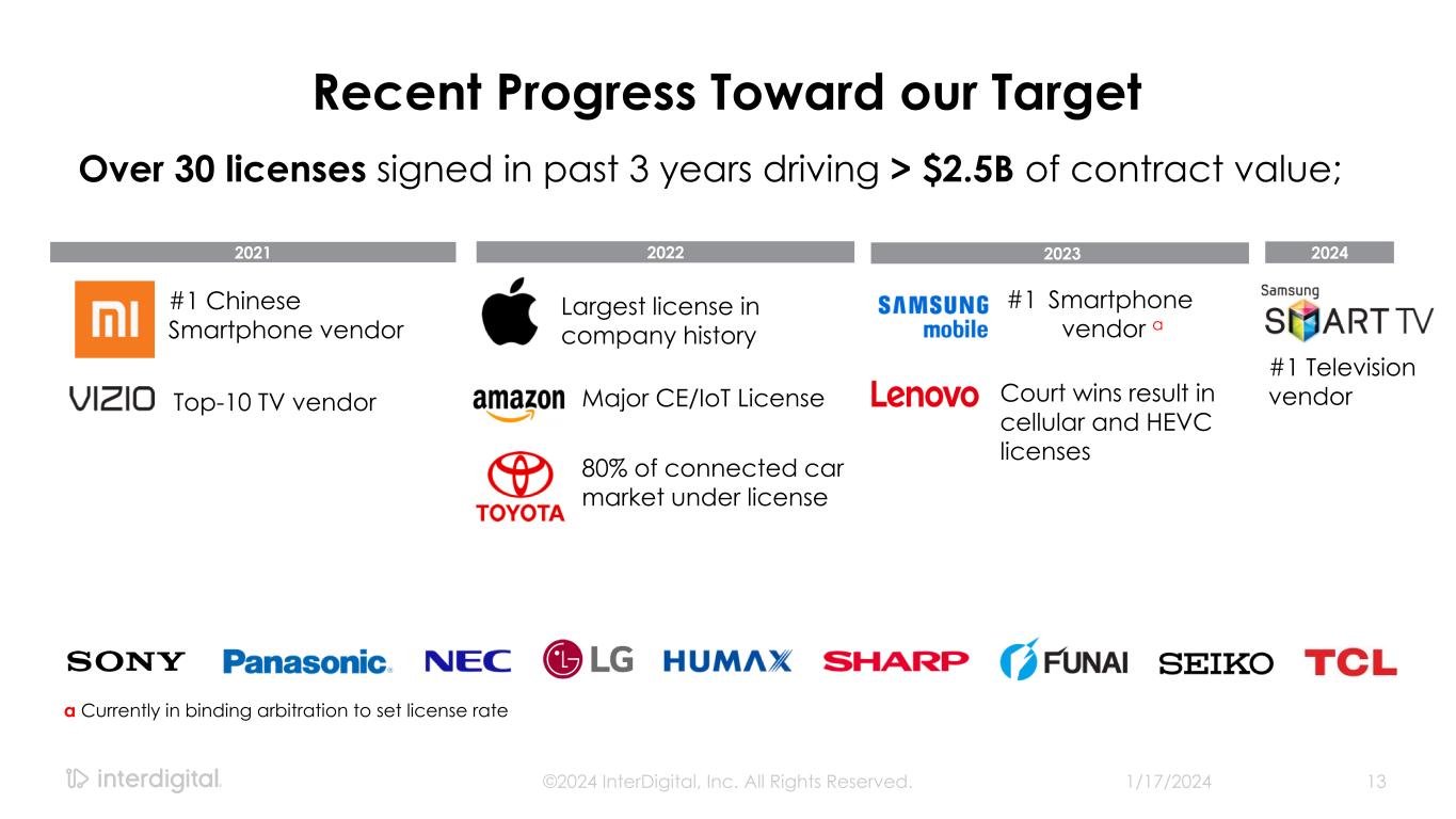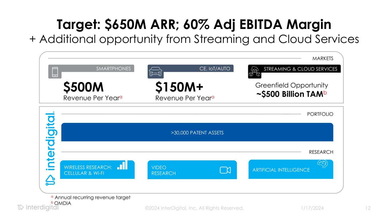 1/17/2024©2024 InterDigital, Inc. All Rights Reserved. 12 Target: $650M ARR; 60% Adj EBITDA Margin + Additional opportunity from Streaming and Cloud Services $500M Revenue Per Yeara $150M+ Greenfield Opportunity ~$500 Billion TAMb SMARTPHONES CE, IoT/AUTO STREAMING & CLOUD SERVICES PORTFOLIO RESEARCH >30,000 PATENT ASSETS MARKETS WIRELESS RESEARCH: CELLULAR & WI-FI VIDEO RESEARCH ARTIFICIAL INTELLIGENCE Revenue Per Yeara a Annual recurring revenue target b OMDIA