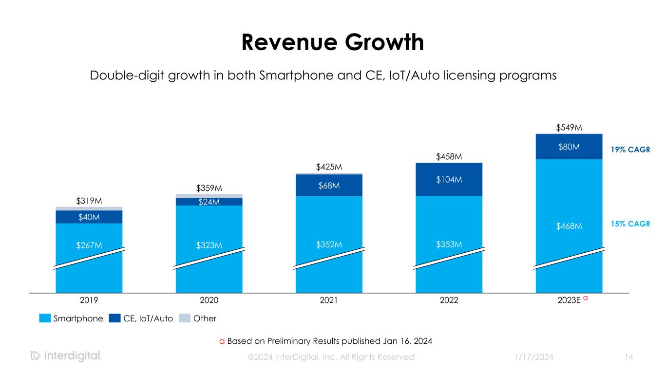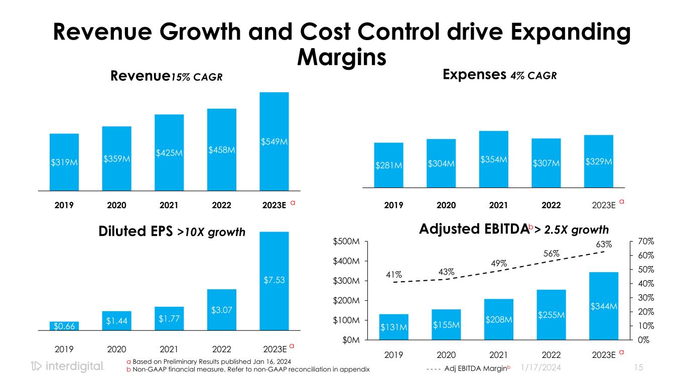 Revenue Growth Double-digit growth in both Smartphone and CE, IoT/Auto licensing programs $40M $24M $68M $104M $80M $267M 2019 $323M 2020 $352M 2021 $353M 2022 $468M 2023E $319M $359M $425M $458M $549M Smartphone CE, IoT/Auto Other 1/17/2024©2024 InterDigital, Inc. All Rights Reserved. 14 19% CAGR 15% CAGR a a Based on Preliminary Results published Jan 16, 2024