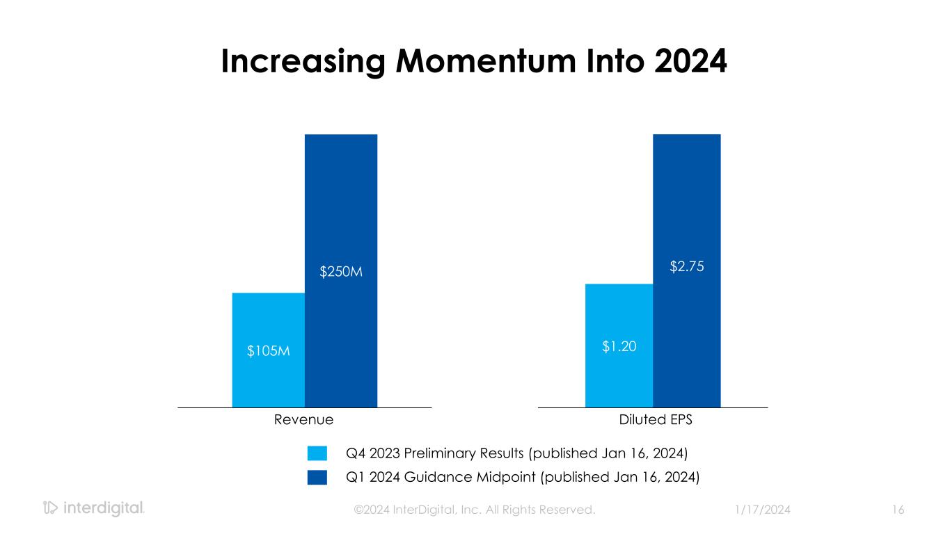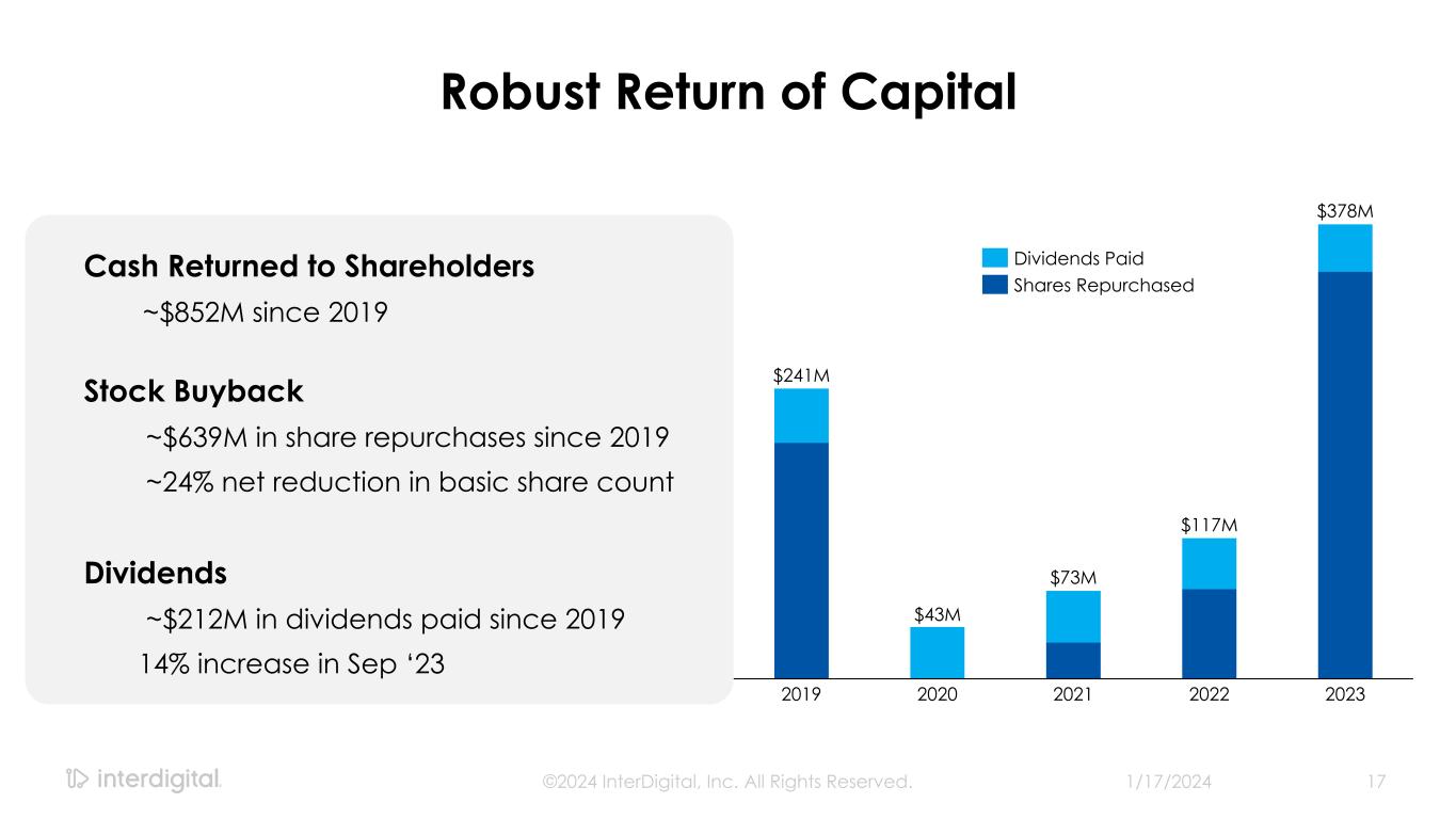 1/17/2024©2024 InterDigital, Inc. All Rights Reserved. 16 Increasing Momentum Into 2024 $105M $250M Revenue Q4 2023 Preliminary Results (published Jan 16, 2024) Q1 2024 Guidance Midpoint (published Jan 16, 2024) $1.20 $2.75 Diluted EPS