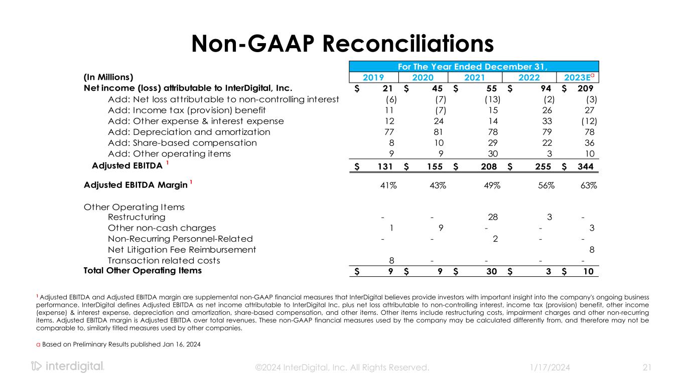 1/17/2024 21 Non-GAAP Reconciliations 1 Adjusted EBITDA and Adjusted EBITDA margin are supplemental non-GAAP financial measures that InterDigital believes provide investors with important insight into the company's ongoing business performance. InterDigital defines Adjusted EBITDA as net income attributable to InterDigital Inc. plus net loss attributable to non-controlling interest, income tax (provision) benefit, other income (expense) & interest expense, depreciation and amortization, share-based compensation, and other items. Other items include restructuring costs, impairment charges and other non-recurring items. Adjusted EBITDA margin is Adjusted EBITDA over total revenues. These non-GAAP financial measures used by the company may be calculated differently from, and therefore may not be comparable to, similarly titled measures used by other companies. a a Based on Preliminary Results published Jan 16, 2024 ©2024 InterDigital, Inc. All Rights Reserved. (In Millions) 2019 2020 2021 2022 2023E Net income (loss) attributable to InterDigital, Inc. 21$ 45$ 55$ 94$ 209$ Add: Net loss attributable to non-controlling interest (6) (7) (13) (2) (3) Add: Income tax (provision) benefit 11 (7) 15 26 27 Add: Other expense & interest expense 12 24 14 33 (12) Add: Depreciation and amortization 77 81 78 79 78 Add: Share-based compensation 8 10 29 22 36 Add: Other operating items 9 9 30 3 10 Adjusted EBITDA 1 131$ 155$ 208$ 255$ 344$ Adjusted EBITDA Margin 1 41% 43% 49% 56% 63% Other Operating Items Restructuring - - 28 3 - Other non-cash charges 1 9 - - 3 Non-Recurring Personnel-Related - - 2 - - Net Litigation Fee Reimbursement 8 Transaction related costs 8 - - - - Total Other Operating Items 9$ 9$ 30$ 3$ 10$ For The Year Ended December 31, a