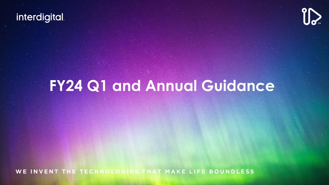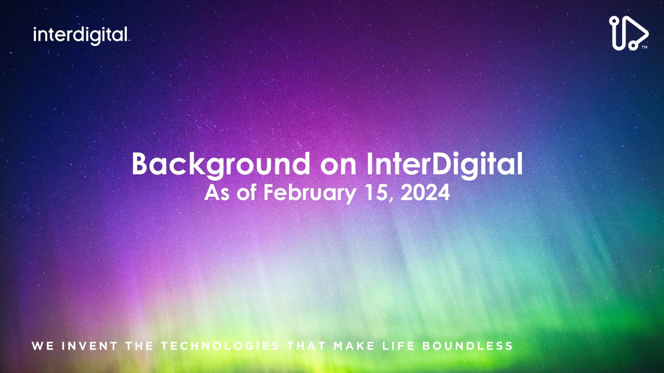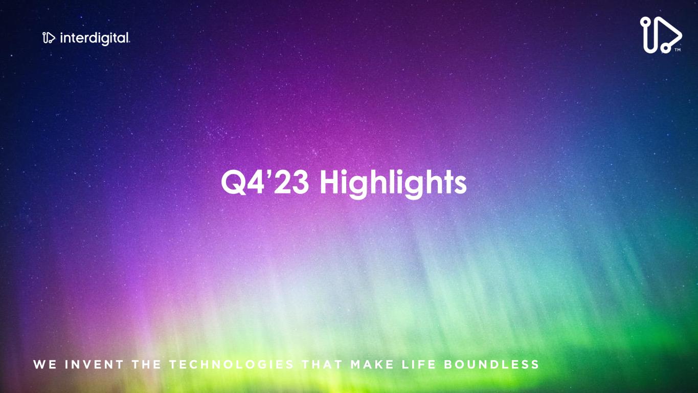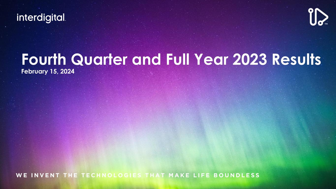 2/15/2024©2024 InterDigital, Inc. All Rights Reserved. 2 Disclaimers Forward-Looking Statements This presentation contains forward-looking statements within the meaning of Section 21E of the Exchange Act. Such statements include information regarding our current beliefs, plans and expectations, including, without limitation, the matters set forth below. Words such as "believe," “anticipate,” “estimate,” “expect,” “project,” “intend,” “plan,” “forecast,” "goal," "could," "would," "should," "if," "may," "might," "future," "target," "trend," "seek to," "will continue," "predict," "likely," "in the event," variations of any such words or similar expressions contained herein are intended to identify such forward-looking statements. Forward-looking statements are made on the basis of management’s current views and assumptions and are not guarantees of future performance. Although the forward-looking statements in this presentation reflect the good faith judgment of our management, such statements can only be based on facts and factors currently known by us. Consequently, forward-looking statements concerning our business, results of operations and financial condition are inherently subject to risks and uncertainties. We caution readers that actual results and outcomes could differ materially from those expressed in or anticipated by such forward-looking statements due to a variety of factors, including: (i) unanticipated delays, difficulties or accelerations in the execution of patent license agreements; (ii) the resolution of current legal proceedings, including any awards or judgments relating to such proceedings, additional or related legal proceedings, including appeals, changes in the schedules or costs associated with such proceedings or adverse rulings; (iii) our ability to leverage our strategic relationships and secure new patent license agreements on acceptable terms; (iv) our ability to enter into sales and/or licensing partnering arrangements for certain of our patent assets; (v) our ability to expand our revenue opportunities by entering into licensing arrangements with video streaming and other cloud-based service providers; (vi) our ability to enter into partnerships with leading inventors and research organizations and identify and acquire technology and patent portfolios that align with our roadmap; (vii) our ability to commercialize our technologies and enter into customer agreements; (viii) the failure of the markets for our current or new technologies to materialize to the extent or at the rate that we expect; (ix) our continued ability to develop new technologies and secure new patents, including the risk of unexpected delays or difficulties related to the development of our technologies; (x) risks associated with our capital allocation strategies, including risks associated with our planned dividend payments and share repurchases; (xi) changes in our interpretations of, and assumptions and calculations with respect to the impact on us of, the 2017 Tax Cuts and Jobs Act, as well as further guidance that may be issued regarding such act; (xii) risks related to the potential impact of new accounting standards on our financial position, results of operations or cash flows; (xiii) failure to accurately forecast the impact of our restructuring activities on our financial statements and our business; (xiv) the timing and impact of potential administrative and legislative matters; (xv) changes or inaccuracies in market projections; (xvi) our ability to obtain liquidity though debt and equity financings; (xvii) the potential effects that macroeconomic uncertainty could have on our financial position, results of operations and cash flows; (xviii) impacts from acts of terrorism, war or political or civil unrest, or any responses thereto, in the United States or elsewhere; (xix) changes in our business strategy; (xx) changes or inaccuracies in our expectations with respect to royalty payments by our customers and (xxi) risks related to our assumptions and application of relevant accounting standards, including with respect to revenue recognition. You should carefully consider these factors as well as the risks and uncertainties outlined in greater detail in Part I, Item 1A, of our Form 10-K before making any investment decision with respect to our common stock. These factors, individually or in the aggregate, may cause our actual results to differ materially from our expected and historical results. You should understand that it is not possible to predict or identify all such factors. In addition, you should not place undue reliance on the forward-looking statements contained herein, which are made only as of the date of this presentation. We undertake no obligation to revise or update publicly any forward-looking statement for any reason, except as otherwise required by law. Industry Data This presentation contains statistical data, estimates, and forecasts that are based on independent industry publications or other publicly available information, as well as other information based on our internal sources. While we believe the industry and market data included in this presentation are reliable and are based on reasonable assumptions, these data involve many assumptions and limitations, and you are cautioned not to give undue weight to these estimates. We have not independently verified the accuracy or completeness of the data contained in these industry publications and other publicly available information. Non-GAAP Financial Measures This presentation includes certain non-GAAP measures not based on generally accepted accounting principles. These non-GAAP measures are in addition to, not a substitute for or superior to, measures of financial performance prepared in accordance with GAAP. The non-GAAP measures used by us may differ from the non-GAAP measures used by other companies. For more information and for reconciliations between GAAP and these non
