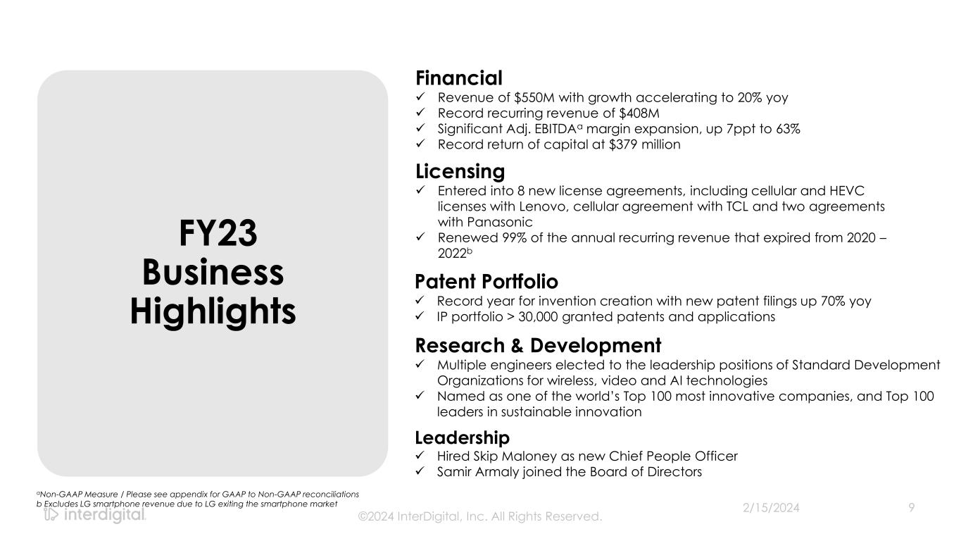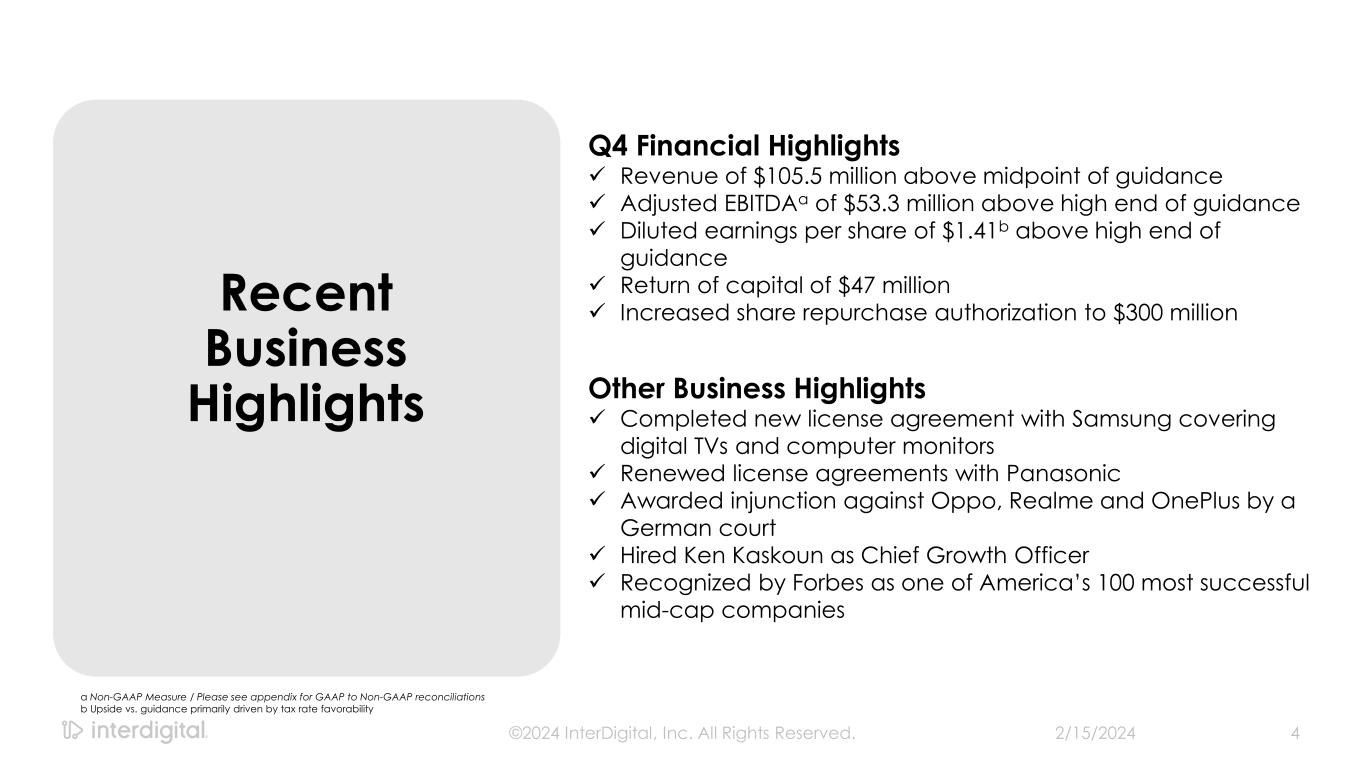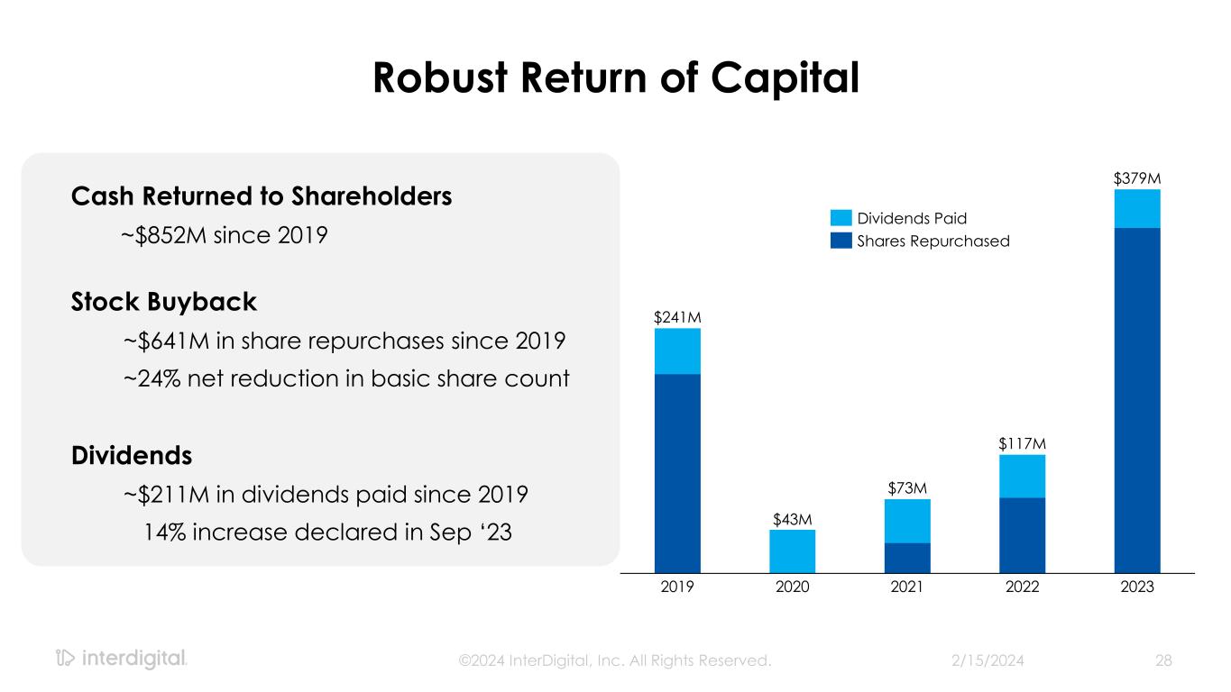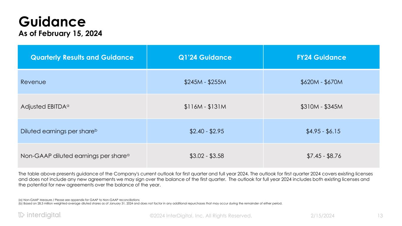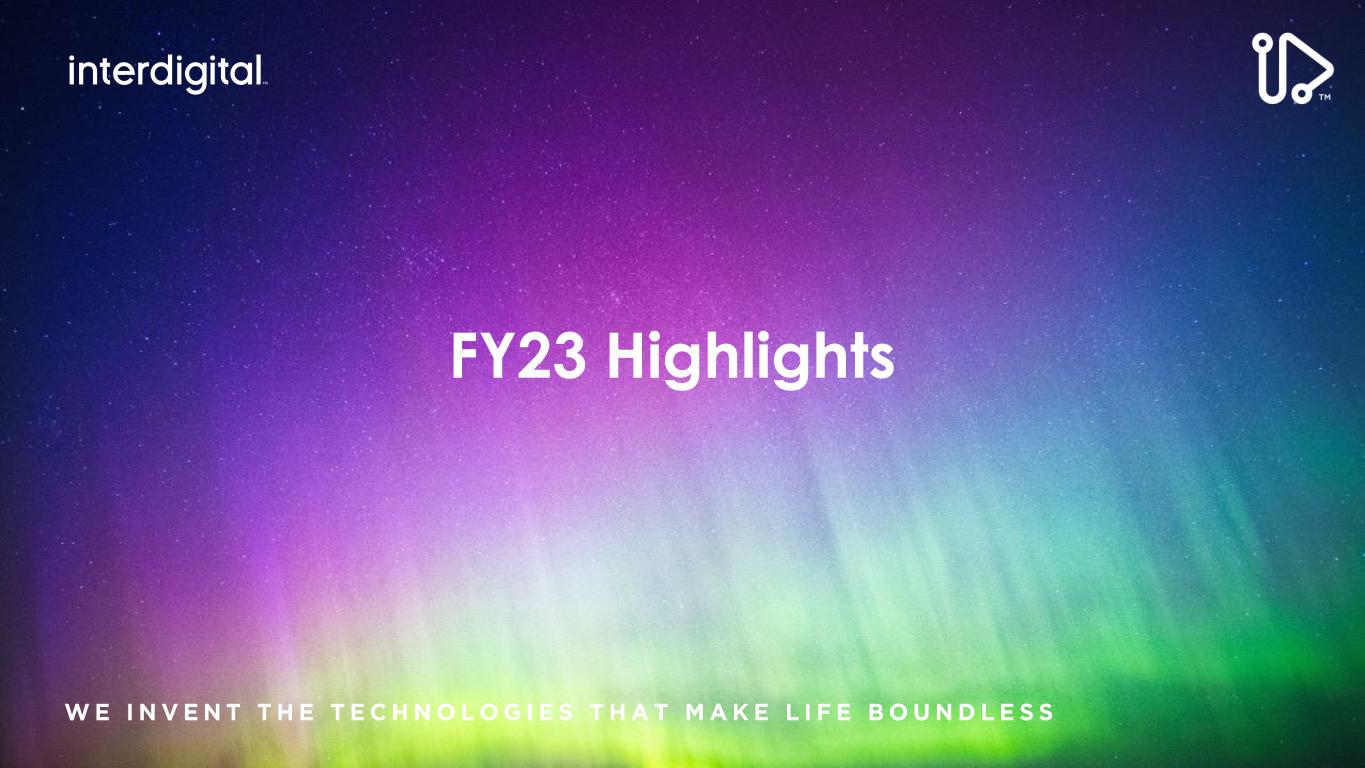 2/15/2024©2024 InterDigital, Inc. All Rights Reserved. 2 Disclaimers Forward-Looking Statements This presentation contains forward-looking statements within the meaning of Section 21E of the Exchange Act. Such statements include information regarding our current beliefs, plans and expectations, including, without limitation, the matters set forth below. Words such as "believe," “anticipate,” “estimate,” “expect,” “project,” “intend,” “plan,” “forecast,” "goal," "could," "would," "should," "if," "may," "might," "future," "target," "trend," "seek to," "will continue," "predict," "likely," "in the event," variations of any such words or similar expressions contained herein are intended to identify such forward-looking statements. Forward-looking statements are made on the basis of management’s current views and assumptions and are not guarantees of future performance. Although the forward-looking statements in this presentation reflect the good faith judgment of our management, such statements can only be based on facts and factors currently known by us. Consequently, forward-looking statements concerning our business, results of operations and financial condition are inherently subject to risks and uncertainties. We caution readers that actual results and outcomes could differ materially from those expressed in or anticipated by such forward-looking statements due to a variety of factors, including: (i) unanticipated delays, difficulties or accelerations in the execution of patent license agreements; (ii) the resolution of current legal proceedings, including any awards or judgments relating to such proceedings, additional or related legal proceedings, including appeals, changes in the schedules or costs associated with such proceedings or adverse rulings; (iii) our ability to leverage our strategic relationships and secure new patent license agreements on acceptable terms; (iv) our ability to enter into sales and/or licensing partnering arrangements for certain of our patent assets; (v) our ability to expand our revenue opportunities by entering into licensing arrangements with video streaming and other cloud-based service providers; (vi) our ability to enter into partnerships with leading inventors and research organizations and identify and acquire technology and patent portfolios that align with our roadmap; (vii) our ability to commercialize our technologies and enter into customer agreements; (viii) the failure of the markets for our current or new technologies to materialize to the extent or at the rate that we expect; (ix) our continued ability to develop new technologies and secure new patents, including the risk of unexpected delays or difficulties related to the development of our technologies; (x) risks associated with our capital allocation strategies, including risks associated with our planned dividend payments and share repurchases; (xi) changes in our interpretations of, and assumptions and calculations with respect to the impact on us of, the 2017 Tax Cuts and Jobs Act, as well as further guidance that may be issued regarding such act; (xii) risks related to the potential impact of new accounting standards on our financial position, results of operations or cash flows; (xiii) failure to accurately forecast the impact of our restructuring activities on our financial statements and our business; (xiv) the timing and impact of potential administrative and legislative matters; (xv) changes or inaccuracies in market projections; (xvi) our ability to obtain liquidity though debt and equity financings; (xvii) the potential effects that macroeconomic uncertainty could have on our financial position, results of operations and cash flows; (xviii) impacts from acts of terrorism, war or political or civil unrest, or any responses thereto, in the United States or elsewhere; (xix) changes in our business strategy; (xx) changes or inaccuracies in our expectations with respect to royalty payments by our customers and (xxi) risks related to our assumptions and application of relevant accounting standards, including with respect to revenue recognition. You should carefully consider these factors as well as the risks and uncertainties outlined in greater detail in Part I, Item 1A, of our Form 10-K before making any investment decision with respect to our common stock. These factors, individually or in the aggregate, may cause our actual results to differ materially from our expected and historical results. You should understand that it is not possible to predict or identify all such factors. In addition, you should not place undue reliance on the forward-looking statements contained herein, which are made only as of the date of this presentation. We undertake no obligation to revise or update publicly any forward-looking statement for any reason, except as otherwise required by law. Industry Data This presentation contains statistical data, estimates, and forecasts that are based on independent industry publications or other publicly available information, as well as other information based on our internal sources. While we believe the industry and market data included in this presentation are reliable and are based on reasonable assumptions, these data involve many assumptions and limitations, and you are cautioned not to give undue weight to these estimates. We have not independently verified the accuracy or completeness of the data contained in these industry publications and other publicly available information. Non-GAAP Financial Measures This presentation includes certain non-GAAP measures not based on generally accepted accounting principles. These non-GAAP measures are in addition to, not a substitute for or superior to, measures of financial performance prepared in accordance with GAAP. The non-GAAP measures used by us may differ from the non-GAAP measures used by other companies. For more information and for reconciliations between GAAP and these non