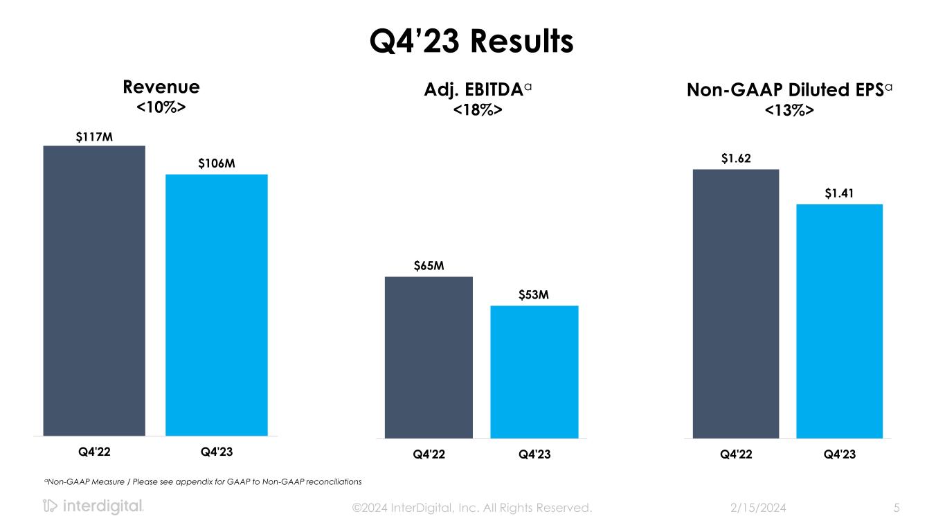 Recent Business Highlights Other Business Highlights ✓ Completed new license agreement with Samsung covering digital TVs and computer monitors ✓ Renewed license agreements with Panasonic ✓ Awarded injunction against Oppo, Realme and OnePlus by a German court ✓ Hired Ken Kaskoun as Chief Growth Officer ✓ Recognized by Forbes as one of America’s 100 most successful mid-cap companies 2/15/2024©2024 InterDigital, Inc. All Rights Reserved. 4 a Non-GAAP Measure / Please see appendix for GAAP to Non-GAAP reconciliations b Upside vs. guidance primarily driven by tax rate favorability Q4 Financial Highlights ✓ Revenue of $105.5 million above midpoint of guidance ✓ Adjusted EBITDAa of $53.3 million above high end of guidance ✓ Diluted earnings per share of $1.41b above high end of guidance ✓ Return of capital of $47 million ✓ Increased share repurchase authorization to $300 million