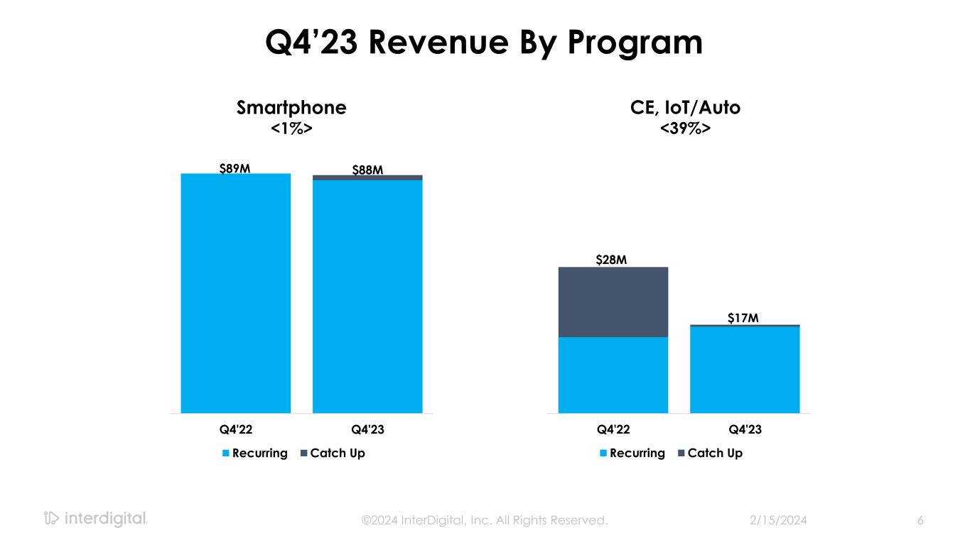 2/15/2024©2024 InterDigital, Inc. All Rights Reserved. 5 Q4’23 Results aNon-GAAP Measure / Please see appendix for GAAP to Non-GAAP reconciliations $117M $106M Q4'22 Q4'23 $65M $53M 0 20 40 60 80 100 120 Q4'22 Q4'23 Revenue <10%> Adj. EBITDAa <18%> Non-GAAP Diluted EPSa <13%> $1.62 $1.41 $0.00 $0.20 $0.40 $0.60 $0.80 $1.00 $1.20 $1.40 $1.60 $1.80 Q4'22 Q4'23