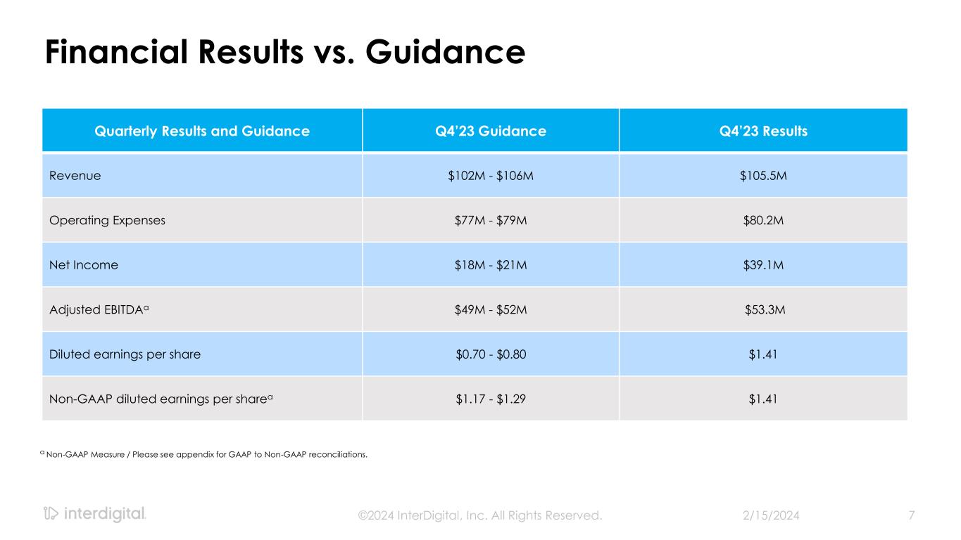 2/15/2024©2024 InterDigital, Inc. All Rights Reserved. 6 Q4’23 Revenue By Program $89M $88M 0 10 20 30 40 50 60 70 80 90 Q4'22 Q4'23 Recurring Catch Up $28M $17M 0 5 10 15 20 25 30 35 40 45 50 Q4'22 Q4'23 Recurring Catch Up Smartphone <1%> CE, IoT/Auto <39%>
