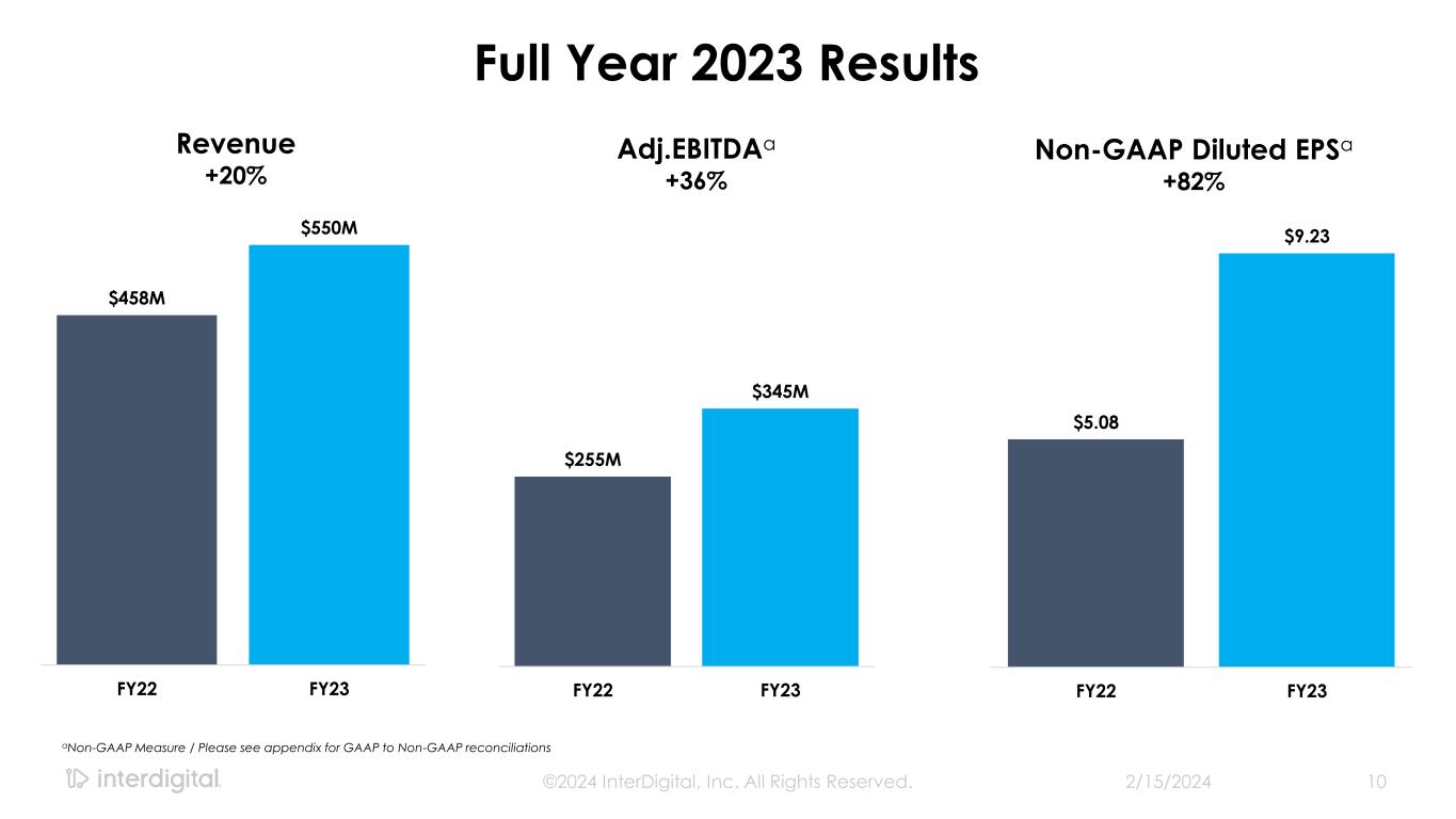FY23 Business Highlights Leadership ✓ Hired Skip Maloney as new Chief People Officer ✓ Samir Armaly joined the Board of Directors Licensing ✓ Entered into 8 new license agreements, including cellular and HEVC licenses with Lenovo, cellular agreement with TCL and two agreements with Panasonic ✓ Renewed 99% of the annual recurring revenue that expired from 2020 – 2022b Research & Development ✓ Multiple engineers elected to the leadership positions of Standard Development Organizations for wireless, video and AI technologies ✓ Named as one of the world’s Top 100 most innovative companies, and Top 100 leaders in sustainable innovation Patent Portfolio ✓ Record year for invention creation with new patent filings up 70% yoy ✓ IP portfolio > 30,000 granted patents and applications 2/15/2024 ©2024 InterDigital, Inc. All Rights Reserved. 9 Financial ✓ Revenue of $550M with growth accelerating to 20% yoy ✓ Record recurring revenue of $408M ✓ Significant Adj. EBITDAa margin expansion, up 7ppt to 63% ✓ Record return of capital at $379 million aNon-GAAP Measure / Please see appendix for GAAP to Non-GAAP reconciliations b Excludes LG smartphone revenue due to LG exiting the smartphone market