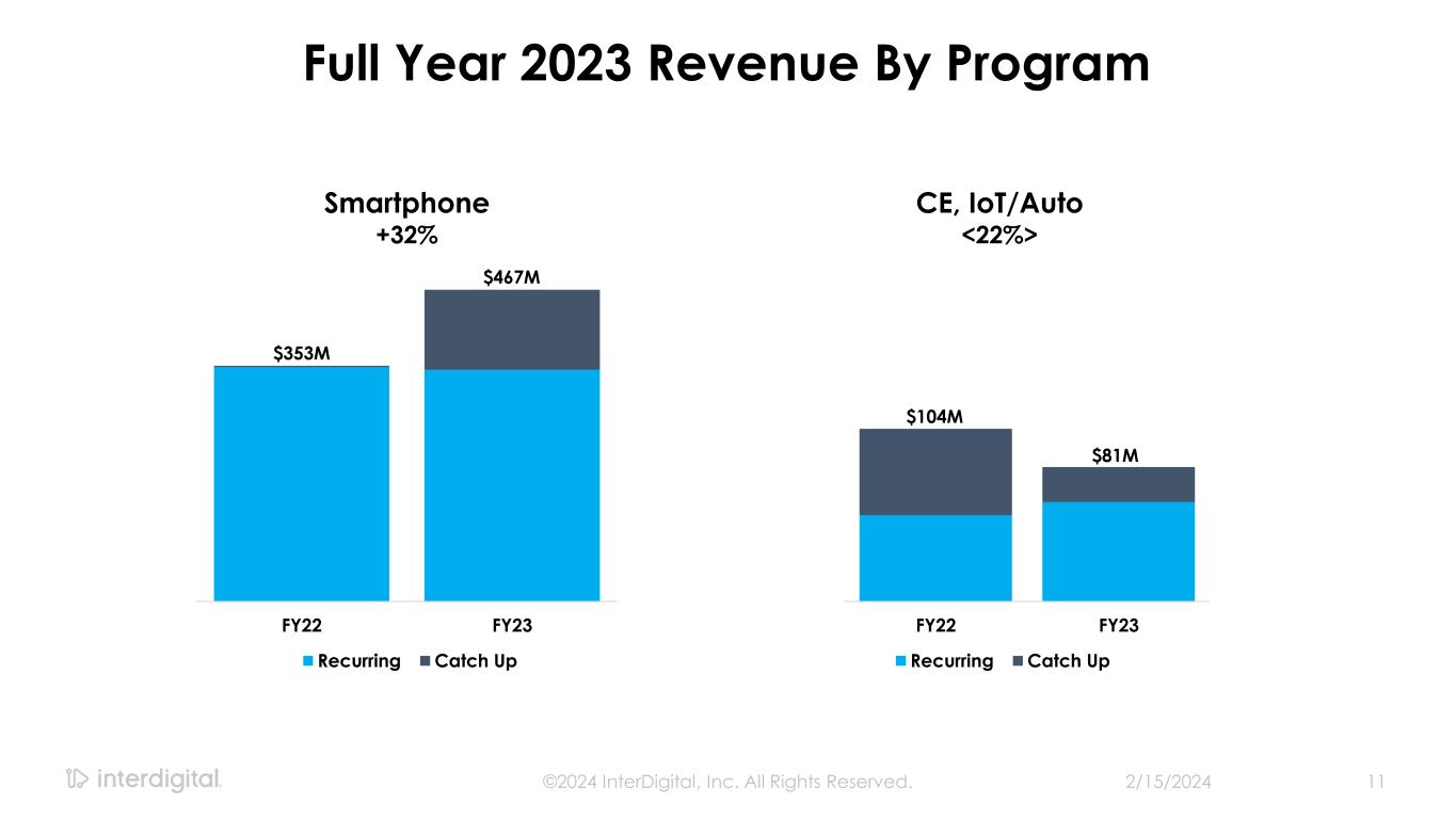 2/15/2024©2024 InterDigital, Inc. All Rights Reserved. 10 $458M $550M FY22 FY23 Revenue +20% Full Year 2023 Results $255M $345M FY22 FY23 Adj.EBITDAa +36% aNon-GAAP Measure / Please see appendix for GAAP to Non-GAAP reconciliations $5.08 $9.23 FY22 FY23 Non-GAAP Diluted EPSa +82%