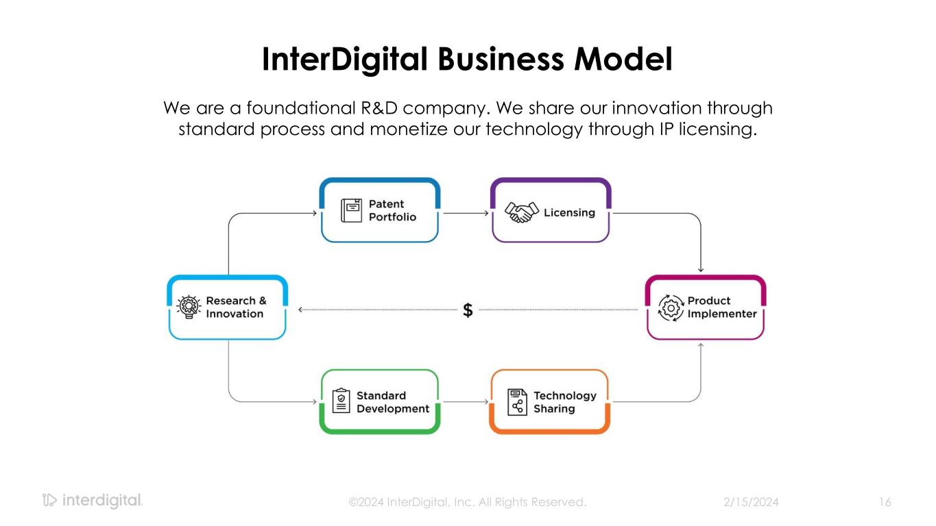 Why IDCC? Strong Financial Performance Double-digit revenue growth, exceptional margins, robust return of capital Large Market Opportunity $650M+ recurring revenue target in device markets. Expanding into greenfield of video streaming and cloud services opportunities Licensing Momentum Experienced leadership team with long industry track record. Over $2.5B of new contracts completed in past 3 years Differentiated Patent Portfolio One of the strongest and highest quality patent portfolios in the world with > 30,000 patents across wireless, video and AI Deep Industry Expertise Five decades of pioneering wireless and video innovation. Highest concentration of inventors 2/15/2024©2024 InterDigital, Inc. All Rights Reserved. 15