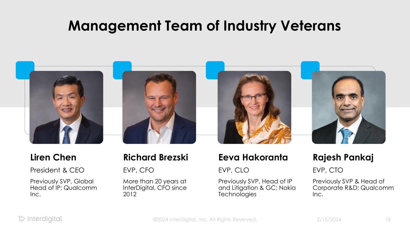 Pioneering research integral to the evolution of cellular wireless and video innovation since 1972 We reinvest ~half our recurring revenue into research and portfolio development Over Five Decades of Wireless & Video Innovation 2/15/2024©2024 InterDigital, Inc. All Rights Reserved. 17 Over half of our employees are engineers hold advanced degrees are inventors Of our engineers… ~90% ~90%