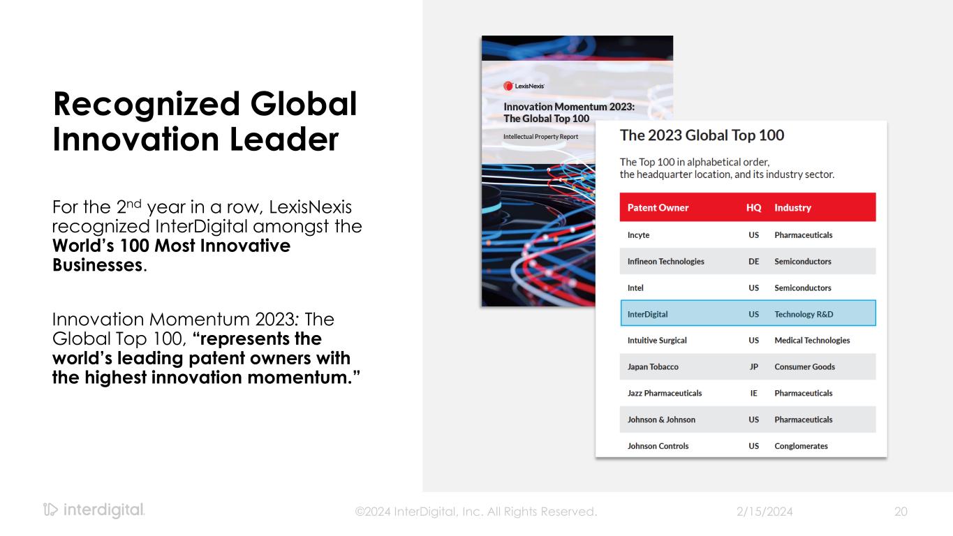 2/15/2024©2024 InterDigital, Inc. All Rights Reserved. 20 Recognized Global Innovation Leader For the 2nd year in a row, LexisNexis recognized InterDigital amongst the World’s 100 Most Innovative Businesses. Innovation Momentum 2023: The Global Top 100, “represents the world’s leading patent owners with the highest innovation momentum.”