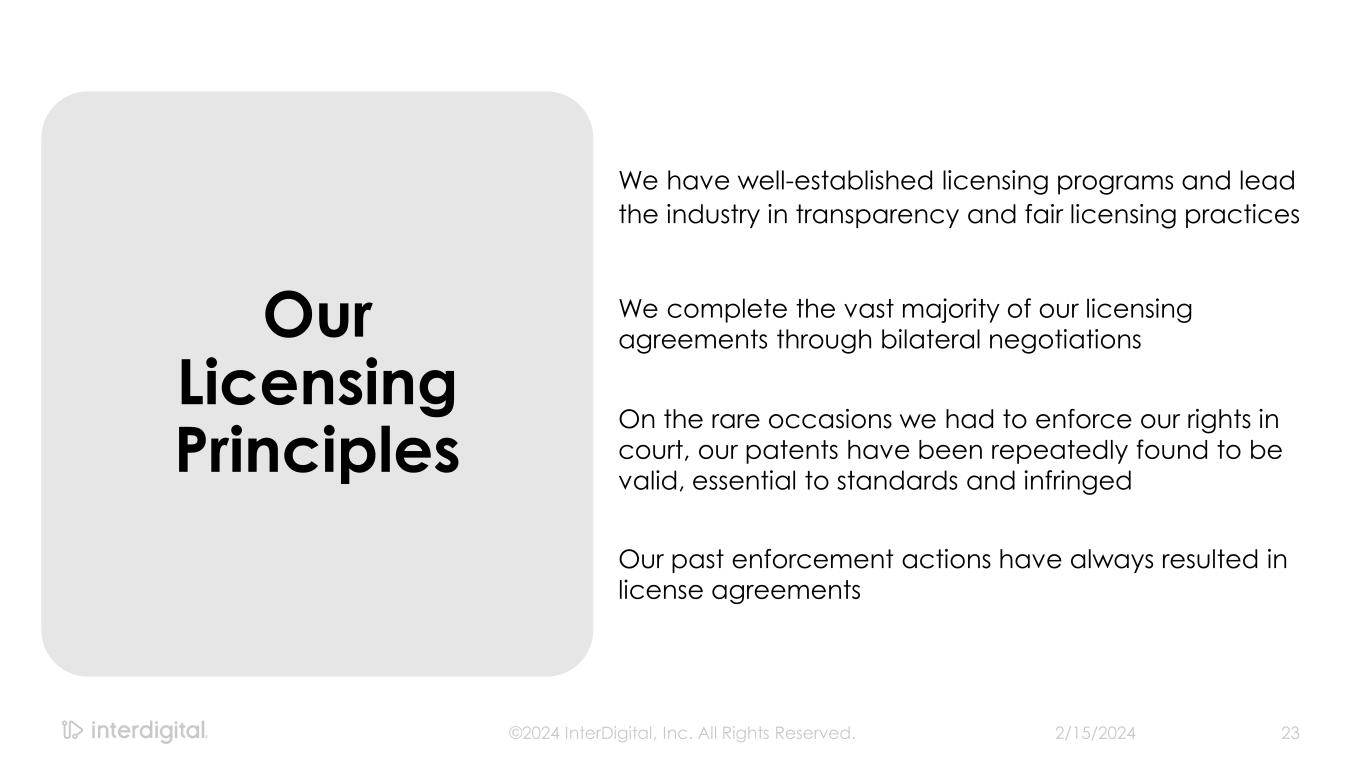 We have well-established licensing programs and lead the industry in transparency and fair licensing practices Our Licensing Principles We complete the vast majority of our licensing agreements through bilateral negotiations On the rare occasions we had to enforce our rights in court, our patents have been repeatedly found to be valid, essential to standards and infringed Our past enforcement actions have always resulted in license agreements 2/15/2024©2024 InterDigital, Inc. All Rights Reserved. 23