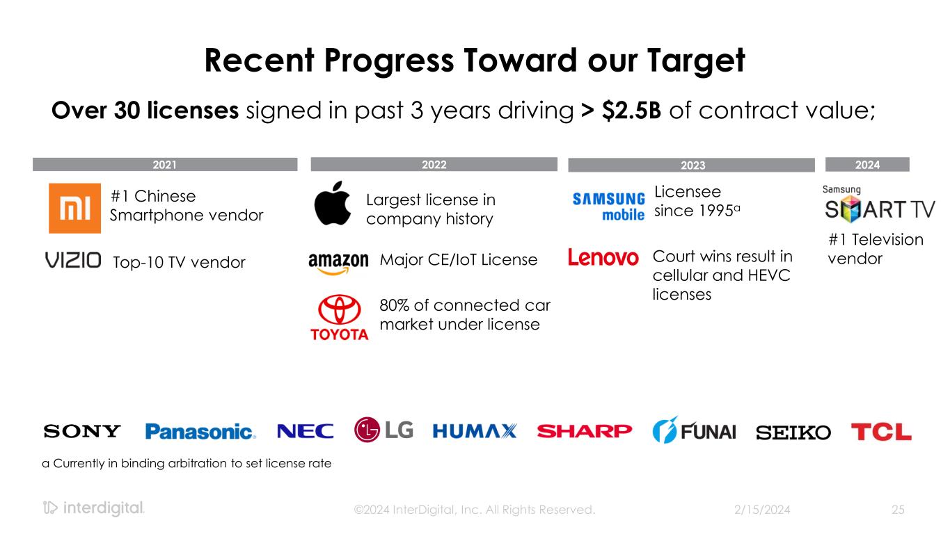 2/15/2024©2024 InterDigital, Inc. All Rights Reserved. 24 Target: $650M ARR; 60% Adj EBITDA Margin + Additional opportunity from Streaming and Cloud Services ARTIFICIAL INTELLIGENCE $500M Revenue Per Yeara $150M+ Greenfield Opportunity ~$500 Billion TAMb SMARTPHONES CE, IoT/AUTO STREAMING & CLOUD SERVICES PORTFOLIO RESEARCH >30,000 PATENT ASSETS MARKETS WIRELESS RESEARCH: CELLULAR & WI-FI VIDEO RESEARCH Revenue Per Yeara a Annual recurring revenue target b OMDIA