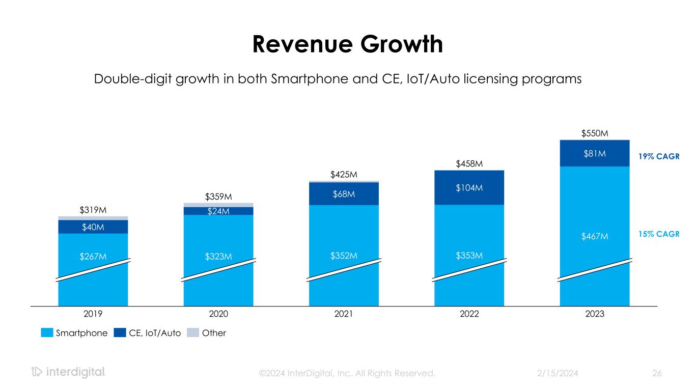 Recent Progress Toward our Target Over 30 licenses signed in past 3 years driving > $2.5B of contract value; 2/15/2024©2024 InterDigital, Inc. All Rights Reserved. 25 2021 a Currently in binding arbitration to set license rate 2024 #1 Chinese Smartphone vendor 2022 2023 Top-10 TV vendor Largest license in company history Major CE/IoT License 80% of connected car market under license Court wins result in cellular and HEVC licenses #1 Television vendor Licensee since 1995a