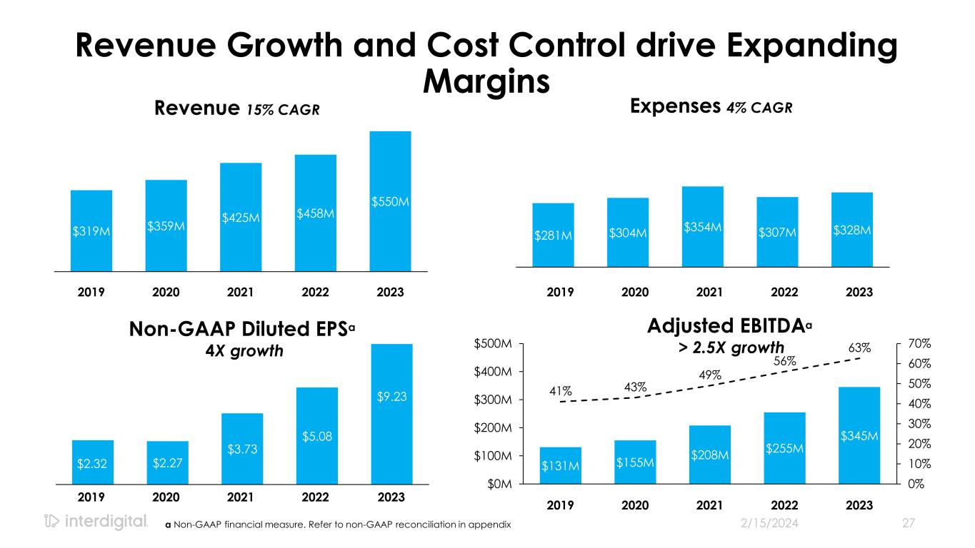 Revenue Growth Double-digit growth in both Smartphone and CE, IoT/Auto licensing programs $40M $24M $68M $104M $81M $267M 2019 $323M 2020 $352M 2021 $353M 2022 $467M 2023 $319M $359M $425M $458M $550M Smartphone CE, IoT/Auto Other 2/15/2024©2024 InterDigital, Inc. All Rights Reserved. 26 19% CAGR 15% CAGR