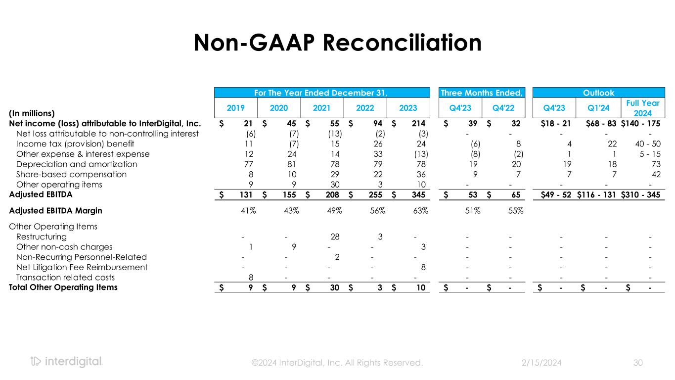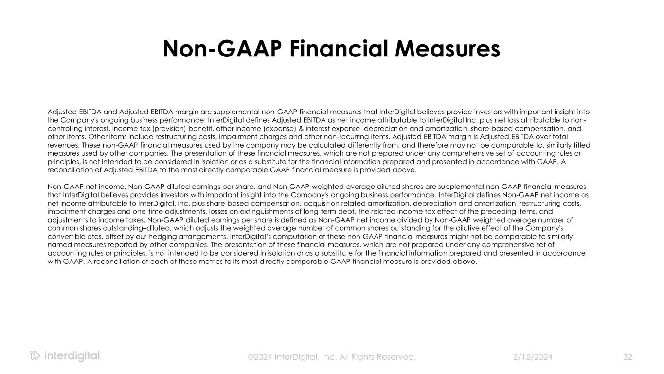 2/15/2024©2024 InterDigital, Inc. All Rights Reserved. 31 Non-GAAP Reconciliation (In millions, except per share data) 2019 2020 2021 2022 2023 Q4'23 Q4'22 Q4'23 Q1'24 Full Year 2024 Net income (loss) attributable to InterDigital, Inc. 21$ 45$ 55$ 94$ 214$ 39$ 32$ $18 - 21 $68 - 83 $140 - 175 Share-based compensation 8 10 29 22 36 9 7 7 7 42 Acquisition related amortization 41 44 42 42 41 10 11 10 8 33 Other operating items 9 9 30 3 10 - - - - - Other non-operating items 3 (4) (11) 13 (14) (5) 3 - - - Related income tax and noncontrolling interest effect of above items (13) (12) (26) (17) (17) (3) (4) (4) (3) (16) Adjustments to income taxes 4 (21) (2) (2) (16) (13) - - - - Non-GAAP net income 74$ 70$ 117$ 155$ 254$ 37$ 49$ $31 - 34 $80 - 95 $199 - 234 Weighted average dilutive shares - GAAP 31.8 31.1 31.3 30.5 28.1 27.6 30.0 26.5 28.3 28.3 Less: Dilutive impact of the Convertible Notes - - - - 0.5 1.2 - 0.1 1.8 1.6 Weighted average dilutive shares - Non-GAAP 31.8 31.1 31.3 30.5 27.6 26.4 30.0 26.4 26.5 26.7 Non-GAAP diluted earnings per share 2.32$ 2.27$ 3.73$ 5.08$ 9.23$ 1.41$ 1.62$ $1.17 - 1.29 $3.02 - 3.58 $7.45 - 8.76 Other Operating Items Restructuring - - 28 3 - - - - - - Other non-cash charges 1 9 - - 3 - - - - - Non-Recurring Personnel-Related - - 2 - - - - - - - Net Litigation Fee Reimbursement - - - - 8 - - - - - Transaction related costs 8 - - - - - - - - - Total Other Operating Items 9$ 9$ 30$ 3$ 10$ -$ -$ -$ -$ -$ Other Non-operating Items Fair value changes 3 (4) (9) 2 (10) (1) 3 - - - Loss on extinguishment of debt - - - 11 - - - - - - Other non-cash charges - - (2) - (4) (4) - - - - Total Other Non-operating Items 3$ (4)$ (11)$ 13$ (14)$ (5)$ 3$ -$ -$ -$ Three months ended, OutlookFull Year