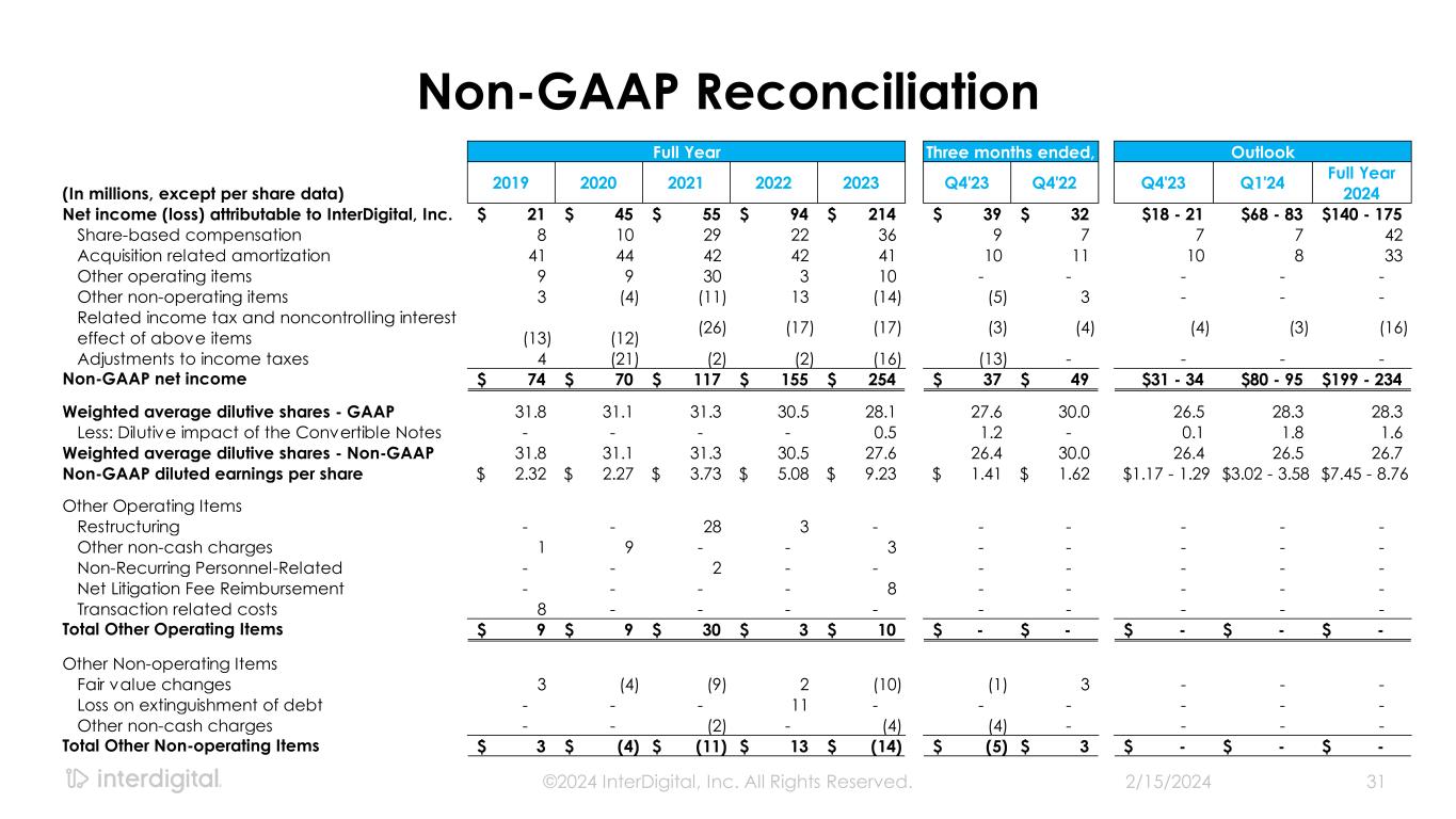 2/15/2024©2024 InterDigital, Inc. All Rights Reserved. 30 Non-GAAP Reconciliation (In millions) 2019 2020 2021 2022 2023 Q4'23 Q4'22 Q4'23 Q1'24 Full Year 2024 Net income (loss) attributable to InterDigital, Inc. 21$ 45$ 55$ 94$ 214$ 39$ 32$ $18 - 21 $68 - 83 $140 - 175 Net loss attributable to non-controlling interest (6) (7) (13) (2) (3) - - - - - Income tax (provision) benefit 11 (7) 15 26 24 (6) 8 4 22 40 - 50 Other expense & interest expense 12 24 14 33 (13) (8) (2) 1 1 5 - 15 Depreciation and amortization 77 81 78 79 78 19 20 19 18 73 Share-based compensation 8 10 29 22 36 9 7 7 7 42 Other operating items 9 9 30 3 10 - - - - - Adjusted EBITDA 131$ 155$ 208$ 255$ 345$ 53$ 65$ $49 - 52 $116 - 131 $310 - 345 Adjusted EBITDA Margin 41% 43% 49% 56% 63% 51% 55% Other Operating Items Restructuring - - 28 3 - - - - - - Other non-cash charges 1 9 - - 3 - - - - - Non-Recurring Personnel-Related - - 2 - - - - - - - Net Litigation Fee Reimbursement - - - - 8 - - - - - Transaction related costs 8 - - - - - - - - - Total Other Operating Items 9$ 9$ 30$ 3$ 10$ -$ -$ -$ -$ -$ For The Year Ended December 31, OutlookThree Months Ended,