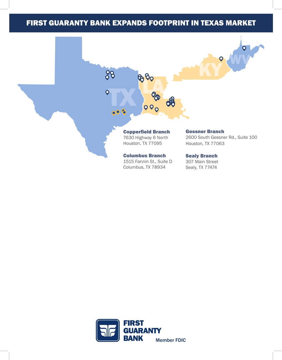 FIRST GUARANTY BANK EXPANDS FOOTPRINT IN TEXAS MARKET Copperfield Branch 7630 Highway 6 North Houston, TX 77095 Columbus Branch 1515 Fannin St., Suite D Columbus, TX 78934 Gessner Branch 2600 South Gessner Rd., Suite 100 Houston, TX 77063 Sealy Branch 307 Main Street Sealy, TX 77474