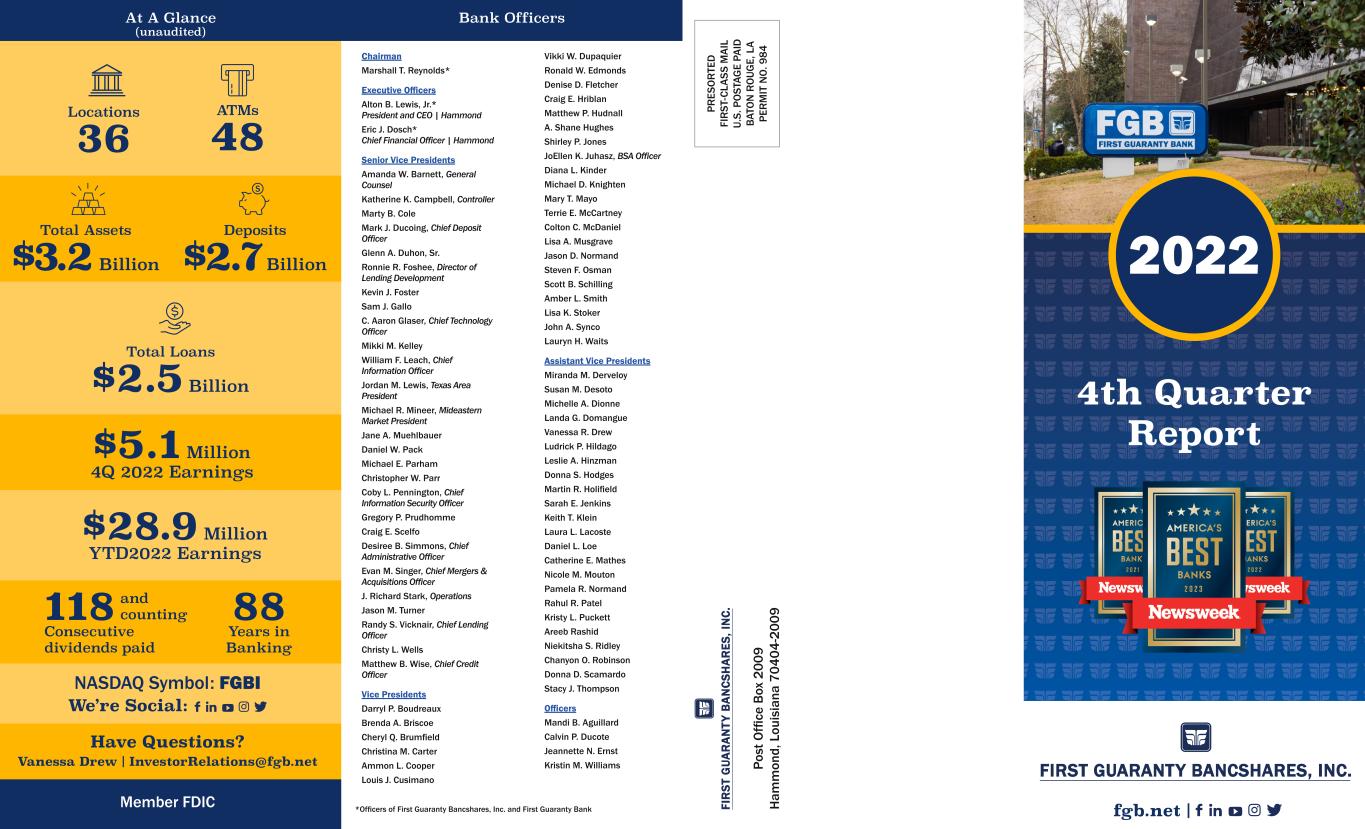 FIRST GUARANTY BANCSHARES, INC. FI R ST G UA R A N TY B A N CS H A R ES , I N C. FI R ST G UA R A N TY B A N CS H A R ES , I N C. Po st O ffi ce B ox 2 00 9 H am m on d, L ou is ia na 7 04 04 -2 00 9 PR ES O R TE D FI R ST -C LA SS M A IL U. S. P O ST AG E PA ID B AT O N R O UG E, L A PE R M IT N O . 9 84 At A Glance (unaudited) Bank Officers Total Assets $3.2 Billion Deposits $2.7 Billion *Officers of First Guaranty Bancshares, Inc. and First Guaranty Bank 2022 4th Quarter Report fgb.net | Locations 36 ATMs 48 $5.1 Million 4Q 2022 Earnings $28.9 Million YTD2022 Earnings 118 Consecutive dividends paid and counting 88 Years in Banking Total Loans $2.5 Billion Member FDIC NASDAQ Symbol: FGBI Have Questions? Vanessa Drew | InvestorRelations@fgb.net We’re Social: Chairman Marshall T. Reynolds* Executive Officers Alton B. Lewis, Jr.* President and CEO | Hammond Eric J. Dosch* Chief Financial Officer | Hammond Senior Vice Presidents Amanda W. Barnett, General Counsel Katherine K. Campbell, Controller Marty B. Cole Mark J. Ducoing, Chief Deposit Officer Glenn A. Duhon, Sr. Ronnie R. Foshee, Director of Lending Development Kevin J. Foster Sam J. Gallo C. Aaron Glaser, Chief Technology Officer Mikki M. Kelley William F. Leach, Chief Information Officer Jordan M. Lewis, Texas Area President Michael R. Mineer, Mideastern Market President Jane A. Muehlbauer Daniel W. Pack Michael E. Parham Christopher W. Parr Coby L. Pennington, Chief Information Security Officer Gregory P. Prudhomme Craig E. Scelfo Desiree B. Simmons, Chief Administrative Officer Evan M. Singer, Chief Mergers & Acquisitions Officer J. Richard Stark, Operations Jason M. Turner Randy S. Vicknair, Chief Lending Officer Christy L. Wells Matthew B. Wise, Chief Credit Officer Vice Presidents Darryl P. Boudreaux Brenda A. Briscoe Cheryl Q. Brumfield Christina M. Carter Ammon L. Cooper Louis J. Cusimano Vikki W. Dupaquier Ronald W. Edmonds Denise D. Fletcher Craig E. Hriblan Matthew P. Hudnall A. Shane Hughes Shirley P. Jones JoEllen K. Juhasz, BSA Officer Diana L. Kinder Michael D. Knighten Mary T. Mayo Terrie E. McCartney Colton C. McDaniel Lisa A. Musgrave Jason D. Normand Steven F. Osman Scott B. Schilling Amber L. Smith Lisa K. Stoker John A. Synco Lauryn H. Waits Assistant Vice Presidents Miranda M. Derveloy Susan M. Desoto Michelle A. Dionne Landa G. Domangue Vanessa R. Drew Ludrick P. Hildago Leslie A. Hinzman Donna S. Hodges Martin R. Holifield Sarah E. Jenkins Keith T. Klein Laura L. Lacoste Daniel L. Loe Catherine E. Mathes Nicole M. Mouton Pamela R. Normand Rahul R. Patel Kristy L. Puckett Areeb Rashid Niekitsha S. Ridley Chanyon O. Robinson Donna D. Scamardo Stacy J. Thompson Officers Mandi B. Aguillard Calvin P. Ducote Jeannette N. Ernst Kristin M. Williams