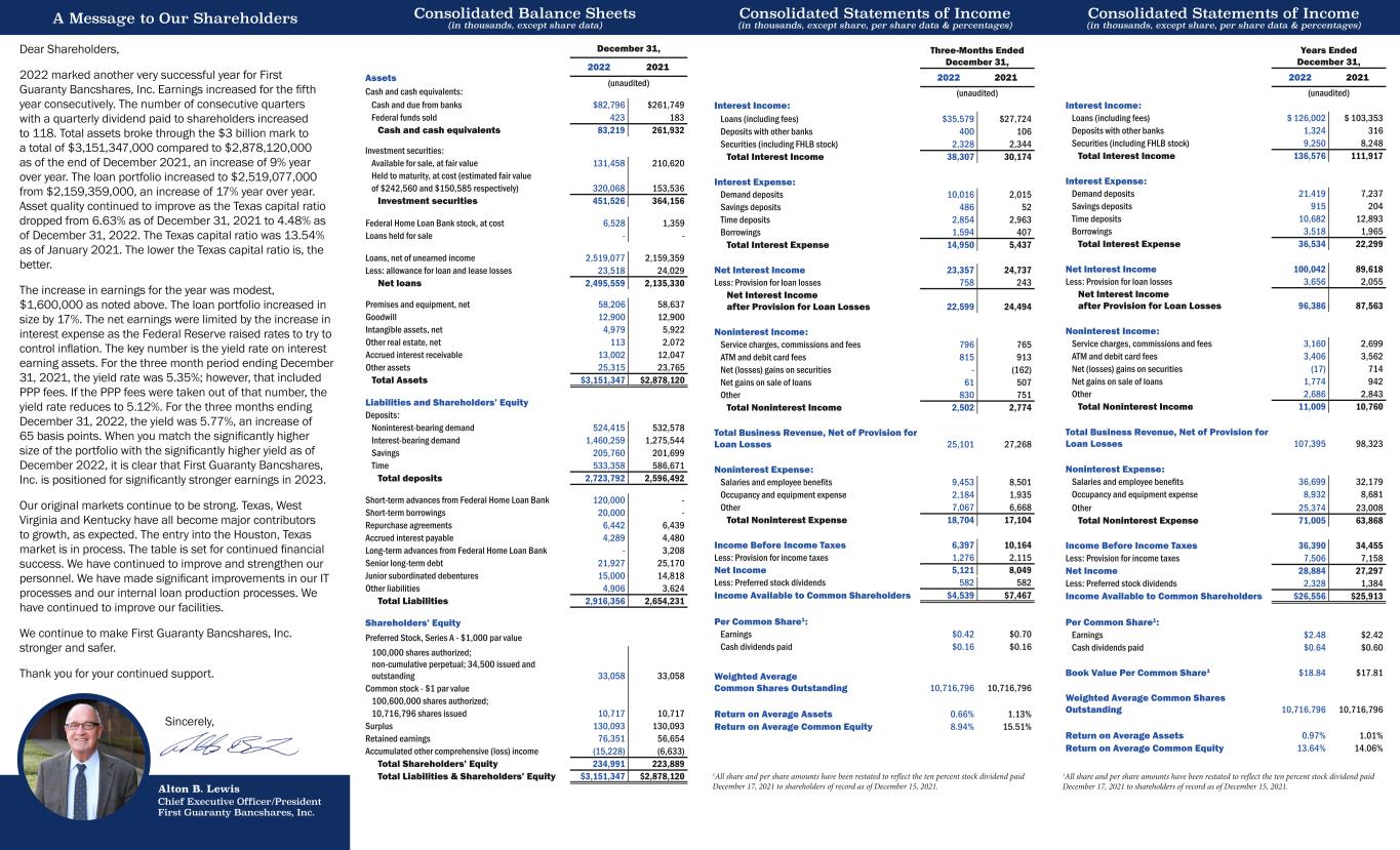 A Message to Our Shareholders Consolidated Balance Sheets (in thousands, except share data) Consolidated Statements of Income (in thousands, except share, per share data & percentages) Consolidated Statements of Income (in thousands, except share, per share data & percentages) Years Ended December 31, 2022 2021 (unaudited) Interest Income: Loans (including fees) $ 126,002 $ 103,353 Deposits with other banks 1,324 316 Securities (including FHLB stock) 9,250 8,248 Total Interest Income 136,576 111,917 Interest Expense: Demand deposits 21,419 7,237 Savings deposits 915 204 Time deposits 10,682 12,893 Borrowings 3,518 1,965 Total Interest Expense 36,534 22,299 Net Interest Income 100,042 89,618 Less: Provision for loan losses 3,656 2,055 Net Interest Income after Provision for Loan Losses 96,386 87,563 Noninterest Income: Service charges, commissions and fees 3,160 2,699 ATM and debit card fees 3,406 3,562 Net (losses) gains on securities (17) 714 Net gains on sale of loans 1,774 942 Other 2,686 2,843 Total Noninterest Income 11,009 10,760 Total Business Revenue, Net of Provision for Loan Losses 107,395 98,323 Noninterest Expense: Salaries and employee benefits 36,699 32,179 Occupancy and equipment expense 8,932 8,681 Other 25,374 23,008 Total Noninterest Expense 71,005 63,868 Income Before Income Taxes 36,390 34,455 Less: Provision for income taxes 7,506 7,158 Net Income 28,884 27,297 Less: Preferred stock dividends 2,328 1,384 Income Available to Common Shareholders $26,556 $25,913 Per Common Share1: Earnings $2.48 $2.42 Cash dividends paid $0.64 $0.60 Book Value Per Common Share1 $18.84 $17.81 Weighted Average Common Shares Outstanding 10,716,796 10,716,796 Return on Average Assets 0.97% 1.01% Return on Average Common Equity 13.64% 14.06% Dear Shareholders, 2022 marked another very successful year for First Guaranty Bancshares, Inc. Earnings increased for the fifth year consecutively. The number of consecutive quarters with a quarterly dividend paid to shareholders increased to 118. Total assets broke through the $3 billion mark to a total of $3,151,347,000 compared to $2,878,120,000 as of the end of December 2021, an increase of 9% year over year. The loan portfolio increased to $2,519,077,000 from $2,159,359,000, an increase of 17% year over year. Asset quality continued to improve as the Texas capital ratio dropped from 6.63% as of December 31, 2021 to 4.48% as of December 31, 2022. The Texas capital ratio was 13.54% as of January 2021. The lower the Texas capital ratio is, the better. The increase in earnings for the year was modest, $1,600,000 as noted above. The loan portfolio increased in size by 17%. The net earnings were limited by the increase in interest expense as the Federal Reserve raised rates to try to control inflation. The key number is the yield rate on interest earning assets. For the three month period ending December 31, 2021, the yield rate was 5.35%; however, that included PPP fees. If the PPP fees were taken out of that number, the yield rate reduces to 5.12%. For the three months ending December 31, 2022, the yield was 5.77%, an increase of 65 basis points. When you match the significantly higher size of the portfolio with the significantly higher yield as of December 2022, it is clear that First Guaranty Bancshares, Inc. is positioned for significantly stronger earnings in 2023. Our original markets continue to be strong. Texas, West Virginia and Kentucky have all become major contributors to growth, as expected. The entry into the Houston, Texas market is in process. The table is set for continued financial success. We have continued to improve and strengthen our personnel. We have made significant improvements in our IT processes and our internal loan production processes. We have continued to improve our facilities. We continue to make First Guaranty Bancshares, Inc. stronger and safer. Thank you for your continued support. Alton B. Lewis Chief Executive Officer/President First Guaranty Bancshares, Inc. December 31, 2022 2021 (unaudited) Three-Months Ended December 31, 2022 2021 (unaudited) Interest Income: Loans (including fees) $35,579 $27,724 Deposits with other banks 400 106 Securities (including FHLB stock) 2,328 2,344 Total Interest Income 38,307 30,174 Interest Expense: Demand deposits 10,016 2,015 Savings deposits 486 52 Time deposits 2,854 2,963 Borrowings 1,594 407 Total Interest Expense 14,950 5,437 Net Interest Income 23,357 24,737 Less: Provision for loan losses 758 243 Net Interest Income after Provision for Loan Losses 22,599 24,494 Noninterest Income: Service charges, commissions and fees 796 765 ATM and debit card fees 815 913 Net (losses) gains on securities - (162) Net gains on sale of loans 61 507 Other 830 751 Total Noninterest Income 2,502 2,774 Total Business Revenue, Net of Provision for Loan Losses 25,101 27,268 Noninterest Expense: Salaries and employee benefits 9,453 8,501 Occupancy and equipment expense 2,184 1,935 Other 7,067 6,668 Total Noninterest Expense 18,704 17,104 Income Before Income Taxes 6,397 10,164 Less: Provision for income taxes 1,276 2,115 Net Income 5,121 8,049 Less: Preferred stock dividends 582 582 Income Available to Common Shareholders $4,539 $7,467 Per Common Share1: Earnings $0.42 $0.70 Cash dividends paid $0.16 $0.16 Weighted Average Common Shares Outstanding 10,716,796 10,716,796 Return on Average Assets 0.66% 1.13% Return on Average Common Equity 8.94% 15.51% 1All share and per share amounts have been restated to reflect the ten percent stock dividend paid December 17, 2021 to shareholders of record as of December 15, 2021. 1All share and per share amounts have been restated to reflect the ten percent stock dividend paid December 17, 2021 to shareholders of record as of December 15, 2021. Sincerely, Assets Cash and cash equivalents: Cash and due from banks $82,796 $261,749 Federal funds sold 423 183 Cash and cash equivalents 83,219 261,932 Investment securities: Available for sale, at fair value 131,458 21