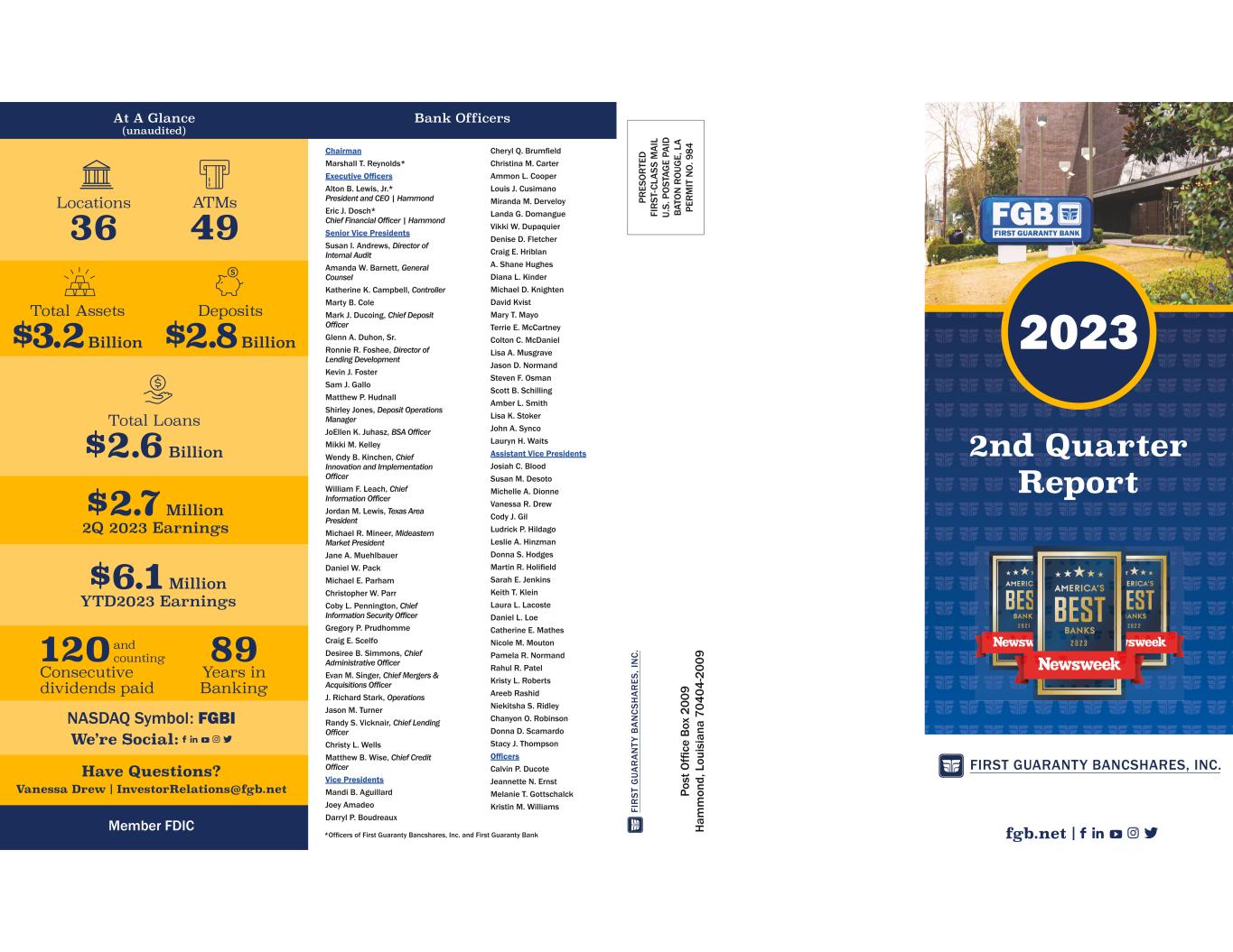 FIRST GUARANTY BANCSHARES, INC. FI R S T G U A R A N TY B A N C S H A R E S , IN C . P o s t O ffi c e B o x 2 0 0 9 H a m m o n d , L o u is ia n a 7 0 4 0 4 -2 0 0 9 P R E S O R T E D F IR S T -C L A S S M A IL U .S . P O S TA G E P A ID B A T O N R O U G E , L A P E R M IT N O . 9 8 4 At A Glance (unaudited) Bank Officers Total Assets $3.2Billion Deposits $2.8Billion 2023 2nd Quarter Report fgb.net | Locations 36 ATMs 49 $2.7 Million 2Q 2023 Earnings $6.1 Million YTD2023 Earnings 120 Consecutive dividends paid and counting 89 Years in Banking Total Loans $2.6 Billion Member FDIC NASDAQ Symbol: FGBI Have Questions? Vanessa Drew | InvestorRelations@fgb.net We’re Social: *Officers of First Guaranty Bancshares, Inc. and First Guaranty Bank Chairman Marshall T. Reynolds* Executive Officers Alton B. Lewis, Jr.* President and CEO | Hammond Eric J. Dosch* Senior Vice Presidents Susan I. Andrews, Director of Internal Audit Amanda W. Barnett, General Counsel Katherine K. Campbell, Controller Marty B. Cole Mark J. Ducoing, Chief Deposit Glenn A. Duhon, Sr. Ronnie R. Foshee, Director of Lending Development Kevin J. Foster Sam J. Gallo Matthew P. Hudnall Shirley Jones, Deposit Operations Manager JoEllen K. Juhasz, Mikki M. Kelley Wendy B. Kinchen, Chief Innovation and Implementation William F. Leach, Chief Jordan M. Lewis, Texas Area President Michael R. Mineer, Mideastern Market President Jane A. Muehlbauer Daniel W. Pack Michael E. Parham Christopher W. Parr Coby L. Pennington, Chief Gregory P. Prudhomme Craig E. Scelfo Desiree B. Simmons, Chief Evan M. Singer, Chief Mergers & J. Richard Stark, Operations Jason M. Turner Randy S. Vicknair, Chief Lending Christy L. Wells Matthew B. Wise, Chief Credit Vice Presidents Mandi B. Aguillard Joey Amadeo Darryl P. Boudreaux Cheryl Q. Brumfield Christina M. Carter Ammon L. Cooper Louis J. Cusimano Miranda M. Derveloy Landa G. Domangue Vikki W. Dupaquier Denise D. Fletcher Craig E. Hriblan A. Shane Hughes Diana L. Kinder Michael D. Knighten David Kvist Mary T. Mayo Terrie E. McCartney Colton C. McDaniel Lisa A. Musgrave Jason D. Normand Steven F. Osman Scott B. Schilling Amber L. Smith Lisa K. Stoker John A. Synco Lauryn H. Waits Assistant Vice Presidents Josiah C. Blood Susan M. Desoto Michelle A. Dionne Vanessa R. Drew Cody J. Gil Ludrick P. Hildago Leslie A. Hinzman Donna S. Hodges Martin R. Holifield Sarah E. Jenkins Keith T. Klein Laura L. Lacoste Daniel L. Loe Catherine E. Mathes Nicole M. Mouton Pamela R. Normand Rahul R. Patel Kristy L. Roberts Areeb Rashid Niekitsha S. Ridley Chanyon O. Robinson Donna D. Scamardo Stacy J. Thompson Officers Calvin P. Ducote Jeannette N. Ernst Melanie T. Gottschalck Kristin M. Williams