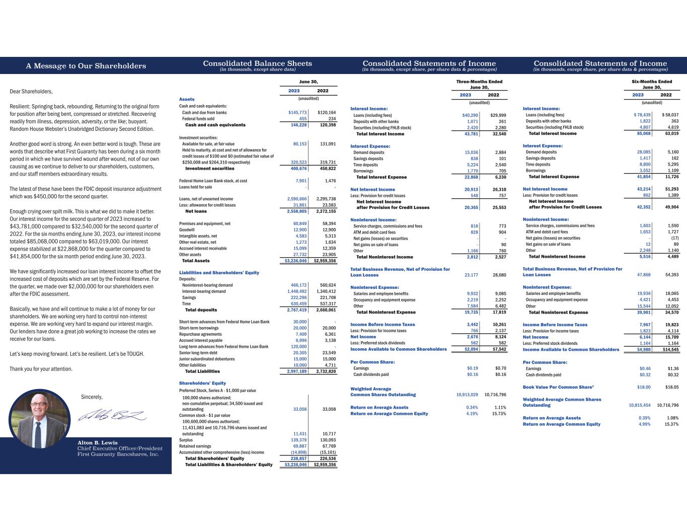 A Message to Our Shareholders Consolidated Balance Sheets (in thousands, except share data) Consolidated Statements of Income (in thousands, except share, per share data & percentages) Consolidated Statements of Income (in thousands, except share, per share data & percentages) Six-Months Ended June 30, 2023 2022 (unaudited) Interest Income: Loans (including fees) $ 78,439 $ 58,037 Deposits with other banks 1,822 363 Securities (including FHLB stock) 4,807 4,619 Total Interest Income 85,068 63,019 Interest Expense: Demand deposits 28,085 5,160 Savings deposits 1,417 162 Time deposits 8,800 5,295 Borrowings 3,552 1,109 Total Interest Expense 41,854 11,726 Net Interest Income 43,214 51,293 Less: Provision for credit losses 862 1,389 Net Interest Income after Provision for Credit Losses 42,352 49,904 Noninterest Income: Service charges, commissions and fees 1,603 1,550 ATM and debit card fees 1,653 1,727 Net gains (losses) on securities - (17) Net gains on sale of loans 12 89 Other 2,248 1,140 Total Noninterest Income 5,516 4,489 Total Business Revenue, Net of Provision for Loan Losses 47,868 54,393 Noninterest Expense: Salaries and employee benefits 19,936 18,065 Occupancy and equipment expense 4,421 4,453 Other 15,544 12,052 Total Noninterest Expense 39,901 34,570 Income Before Income Taxes 7,967 19,823 Less: Provision for income taxes 1,823 4,114 Net Income 6,144 15,709 Less: Preferred stock dividends 1,164 1,164 Income Available to Common Shareholders $4,980 $14,545 Per Common Share: Earnings $0.46 $1.36 Cash dividends paid $0.32 $0.32 Book Value Per Common Share1 $18.00 $18.05 Weighted Average Common Shares Outstanding 10,815,454 10,716,796 Return on Average Assets 0.39% 1.08% Return on Average Common Equity 4.99% 15.37% Dear Shareholders, Resilient: Springing back, rebounding. Returning to the original form for position after being bent, compressed or stretched. Recovering readily from illness, depression, adversity, or the like; buoyant. Random House Webster’s Unabridged Dictionary Second Edition. Another good word is strong. An even better word is tough. These are words that describe what First Guaranty has been during a six month period in which we have survived wound after wound, not of our own causing as we continue to deliver to our shareholders, customers, and our staff members extraordinary results. The latest of these have been the FDIC deposit insurance adjustment which was $450,000 for the second quarter. Enough crying over spilt milk. This is what we did to make it better. Our interest income for the second quarter of 2023 increased to $43,781,000 compared to $32,540,000 for the second quarter of 2022. For the six months ending June 30, 2023, our interest income totaled $85,068,000 compared to $63,019,000. Our interest expense stabilized at $22,868,000 for the quarter compared to $41,854,000 for the six month period ending June 30, 2023. We have significantly increased our loan interest income to offset the increased cost of deposits which are set by the Federal Reserve. For the quarter, we made over $2,000,000 for our shareholders even after the FDIC assessment. Basically, we have and will continue to make a lot of money for our shareholders. We are working very hard to control non-interest expense. We are working very hard to expand our interest margin. Our lenders have done a great job working to increase the rates we receive for our loans. Let’s keep moving forward. Let’s be resilient. Let’s be TOUGH. Thank you for your attention. Alton B. Lewis Chief Executive Officer/President First Guaranty Bancshares, Inc. Assets Cash and cash equivalents: Cash and due from banks $145,773 $120,164 Federal funds sold 455 234 Cash and cash equivalents 146,228 120,398 Investment securities: Available for sale, at fair value 80,153 131,091 Held to maturity, at cost and net of allowance for credit losses of $100 and $0 (estimated fair value of $250,008 and $264,310 respectively) 320,523 319,731 Investment securities 400,676 450,822 Federal Home Loan Bank stock, at cost 7,901 1,476 Loans held for sale - - Loans, net of unearned income 2,590,666 2,295,738 Less: allowance for credit losses 31,861 23,583 Net loans 2,558,805 2,272,155 Premises and equipment, net 60,849 58,394 Goodwill 12,900 12,900 Intangible assets, net 4,583 5,313 Other real estate, net 1,273 1,634 Accrued interest receivable 15,099 12,359 Other assets 27,732 23,905 Total Assets $3,236,046 $2,959,356 Liabilities and Shareholders’ Equity Deposits: Noninterest-bearing demand 466,172 560,624 Interest-bearing demand 1,448,492 1,340,412 Savings 222,296 221,708 Time 630,459 537,317 Total deposits 2,767,419 2,660,061 Short-term advances from Federal Home Loan Bank 30,000 - Short-term borrowings 20,000 20,000 Repurchase agreements 7,409 6,361 Accrued interest payable 6,996 3,138 Long-term advances from Federal Home Loan Bank 120,000 - Senior long-term debt 20,305 23,549 Junior subordinated debentures 15,000 15,000 Other liabilities 10,060 4,711 Total Liabilities 2,997,189 2,732,820 Shareholders’ Equity Preferred Stock, Series A - $1,000 par value 100,000 shares authorized; non-cumulative perpetual; 34,500 issued and outstanding 33,058 33,058 Common stock - $1 par value 100,600,000 shares authorized; 11,431,083 and 10,716,796 shares issued and outstanding 11,431 10,717 Surplus 139,379 130,093 Retained earnings 69,887 67,769 Accumulated other comprehensive (loss) income (14,898) (15,101) Total Shareholders’ Equity 238,857 226,536 Total Liabilities & Shareholders’ Equity $3,236,046 $2,959,356 Three-Months Ended June 30, 2023 2022 (unaudited) Interest Income: Loans (including fees) $40,290 $29,999 Deposits with other banks 1,071 261 Securities (including FHLB stock) 2,420 2,280 Total Interest Income 43,781 32,540 Interest Expense: Demand deposits 15,036 2,884 Savings deposits 838 101 Time deposits 5,224 2,540 Borrowings 1,770 705 Total Interest Expense 22,868 6,230 Net Interest Income 20,913 26,310 Less: Provision for c