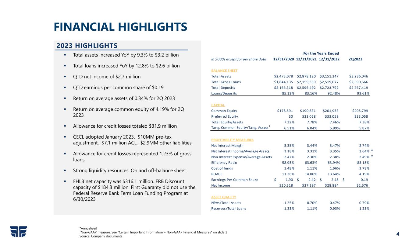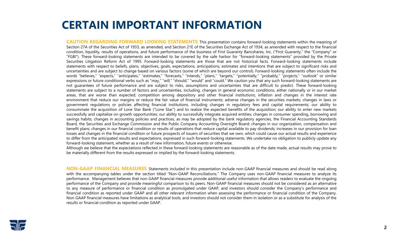 2 CERTAIN IMPORTANT INFORMATION CAUTION REGARDING FORWARD LOOKING STATEMENTS This presentation contains forward-looking statements within the meaning of Section 27A of the Securities Act of 1933, as amended, and Section 21E of the Securities Exchange Act of 1934, as amended with respect to the financial condition, liquidity, results of operations, and future performance of the business of First Guaranty Bancshares, Inc. (“First Guaranty,” the “Company” or “FGBI”). These forward-looking statements are intended to be covered by the safe harbor for “forward-looking statements” provided by the Private Securities Litigation Reform Act of 1995. Forward-looking statements are those that are not historical facts. Forward-looking statements include statements with respect to beliefs, plans, objectives, goals, expectations, anticipations, estimates and intentions that are subject to significant risks and uncertainties and are subject to change based on various factors (some of which are beyond our control). Forward-looking statements often include the words “believes,” “expects,” “anticipates,” “estimates,” “forecasts,” “intends,” “plans,” “targets,” “potentially,” “probably,” “projects,” “outlook” or similar expressions or future conditional verbs such as “may,” “will,” “should,” “would” and “could.” We caution you that any such forward-looking statements are not guarantees of future performance and are subject to risks, assumptions and uncertainties that are difficult to predict. These forward-looking statements are subject to a number of factors and uncertainties, including, changes in general economic conditions, either nationally or in our market areas, that are worse than expected; competition among depository and other financial institutions; inflation and changes in the interest rate environment that reduce our margins or reduce the fair value of financial instruments; adverse changes in the securities markets; changes in laws or government regulations or policies affecting financial institutions, including changes in regulatory fees and capital requirements; our ability to consummate the acquisition of Lone Star Bank (“Lone Star”) and to realize the expected benefits of the acquisition; our ability to enter new markets successfully and capitalize on growth opportunities; our ability to successfully integrate acquired entities; changes in consumer spending, borrowing and savings habits; changes in accounting policies and practices, as may be adopted by the bank regulatory agencies, the Financial Accounting Standards Board, the Securities and Exchange Commission and the Public Company Accounting Oversight Board; changes in our organization, compensation and benefit plans; changes in our financial condition or results of operations that reduce capital available to pay dividends; increases in our provision for loan losses and changes in the financial condition or future prospects of issuers of securities that we own, which could cause our actual results and experience to differ from the anticipated results and expectations, expressed in such forward-looking statements. We undertake no obligation to publicly update any forward-looking statement, whether as a result of new information, future events or otherwise. Although we believe that the expectations reflected in these forward-looking statements are reasonable as of the date made, actual results may prove to be materially different from the results expressed or implied by the forward-looking statements. NON-GAAP FINANCIAL MEASURES Statements included in this presentation include non-GAAP financial measures and should be read along with the accompanying tables under the section titled “Non-GAAP Reconciliations.” The Company uses non-GAAP financial measures to analyze its performance. Management believes that non-GAAP financial measures provide additional useful information that allows readers to evaluate the ongoing performance of the Company and provide meaningful comparison to its peers. Non-GAAP financial measures should not be considered as an alternative to any measure of performance or financial condition as promulgated under GAAP, and investors should consider the Company’s performance and financial condition as reported under GAAP and all other relevant information when assessing the performance or financial condition of the Company. Non-GAAP financial measures have limitations as analytical tools, and investors should not consider them in isolation or as a substitute for analysis of the results or financial condition as reported under GAAP.