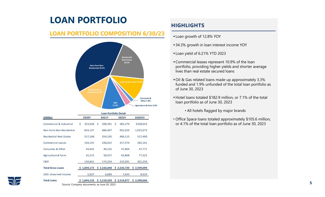 4 FINANCIAL HIGHLIGHTS  Total assets increased YoY by 9.3% to $3.2 billion  Total loans increased YoY by 12.8% to $2.6 billion  QTD net income of $2.7 million  QTD earnings per common share of $0.19  Return on average assets of 0.34% for 2Q 2023  Return on average common equity of 4.19% for 2Q 2023  Allowance for credit losses totaled $31.9 million  CECL adopted January 2023. $10MM pre-tax adjustment. $7.1 million ACL. $2.9MM other liabilities  Allowance for credit losses represented 1.23% of gross loans  Strong liquidity resources. On and off-balance sheet  FHLB net capacity was $316.1 million. FRB Discount capacity of $184.3 million. First Guaranty did not use the Federal Reserve Bank Term Loan Funding Program at 6/30/2023 2023 HIGHLIGHTS *Annualized ¹Non-GAAP measure. See “Certain Important Information – Non-GAAP Financial Measures” on slide 2 Source: Company documents In $000s except for per share data 12/31/2020 12/31/2021 12/31/2022 2Q2023 BALANCE SHEET Total  Assets $2,473,078 $2,878,120 $3,151,347 $3,236,046 Total  Gross  Loans $1,844,135 $2,159,359 $2,519,077 $2,590,666 Total  Deposits $2,166,318 $2,596,492 $2,723,792 $2,767,419 Loans/Deposits 85.13% 83.16% 92.48% 93.61% CAPITAL Common Equity $178,591 $190,831 $201,933 $205,799 Preferred Equity $0 $33,058 $33,058 $33,058 Total  Equity/Assets 7.22% 7.78% 7.46% 7.38% Tang. Common Equity/Tang. Assets1 6.51% 6.04% 5.89% 5.87% PROFITABILITY MEASURES Net Interest Margin 3.35% 3.44% 3.47% 2.74% Net Interest Income/Average Assets 3.18% 3.31% 3.35% 2.64% * Non Interest Expense/Average Assets 2.47% 2.36% 2.38% 2.49% * Efficiency Ratio 58.95% 63.63% 63.94% 83.18% Cost of funds 1.48% 1.11% 1.66% 3.78% ROACE 11.36% 14.06% 13.64% 4.19% Earnings  Per Common Share 1.90$            2.42$            2.48$            0.19$                   Net Income $20,318 $27,297 $28,884 $2,676 ASSET QUALITY NPAs/Total  Assets 1.25% 0.70% 0.47% 0.79% Reserves/Total  Loans 1.33% 1.11% 0.93% 1.23% For the Years Ended