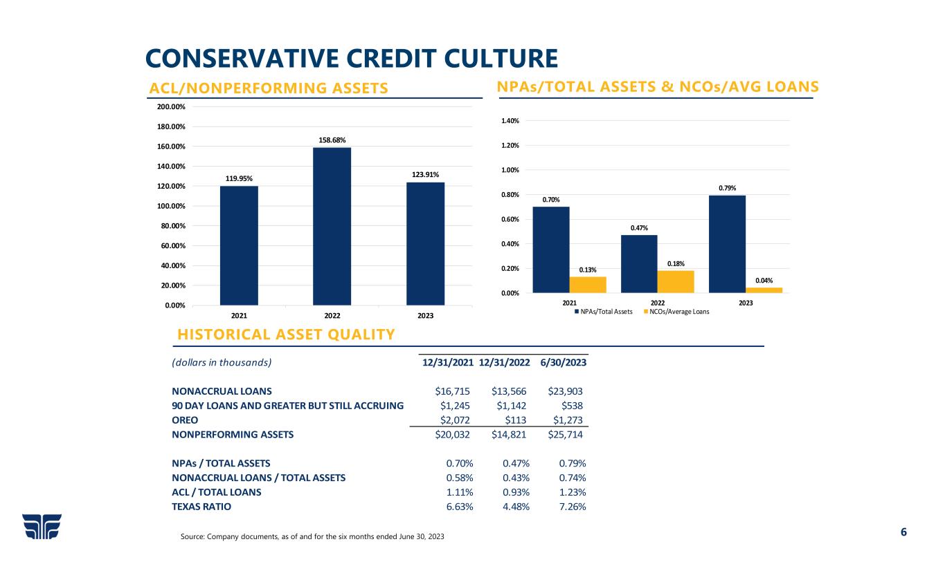 5 LOAN PORTFOLIO Source: Company documents, as June 30, 2023  Loan growth of 12.8% YOY 34.3% growth in loan interest income YOY  Loan yield of 6.21% YTD 2023 Commercial leases represent 10.9% of the loan portfolio, providing higher yields and shorter average lives than real estate secured loans Oil & Gas related loans made up approximately 3.3% funded and 1.9% unfunded of the total loan portfolio as of June 30, 2023 Hotel loans totaled $182.9 million, or 7.1% of the total loan portfolio as of June 30, 2023 • All hotels flagged by major brands • Office Space loans totaled approximately $105.6 million, or 4.1% of the total loan portfolio as of June 30, 2023 HIGHLIGHTS Commercial &  Industrial13.0% Non‐Farm Non‐ Residential 39.5% Residential  Real Estate 20.3% Commercial Leases 10.9% Consumer &  Other 1.8% Agriculture & Farm 2.9% C&D 11.6% LOAN PORTFOLIO COMPOSITION 6/30/23 ($000s) 2020Y 2021Y 2022Y 2Q2023 Commercial  & Industrial 353,028$       398,391$       385,279$       $338,023 Non‐Farm Non‐Residential 824,137         886,407         992,929         1,025,073      Residential  Real  Estate 317,168         354,195         486,115         527,490         Commercial  Leases 104,141         246,022         317,574         282,161         Consumer & Other 44,642            48,142            47,864            47,771            Agriculture & Farm 55,215            58,557            63,868            77,322            C&D 150,841         174,334         233,091         301,259         Total Gross Loans 1,849,172$    2,166,048$    2,526,720$    2,599,099$    LESS: Unearned Income 5,037              6,689              7,643              8,433              Total Loans 1,844,135$    2,159,359$    2,519,077$    2,590,666$    Loan Portfolio Detail