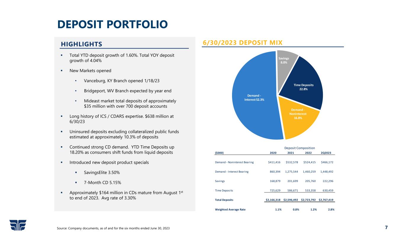 7 Demand ‐ Noninterest 16.8% Demand ‐ Interest52.3% Savings 8.0% Time Deposits 22.8% HIGHLIGHTS  Total YTD deposit growth of 1.60%. Total YOY deposit growth of 4.04%  New Markets opened • Vanceburg, KY Branch opened 1/18/23 • Bridgeport, WV Branch expected by year end • Mideast market total deposits of approximately $35 million with over 700 deposit accounts  Long history of ICS / CDARS expertise. $638 million at 6/30/23  Uninsured deposits excluding collateralized public funds estimated at approximately 10.3% of deposits  Continued strong CD demand. YTD Time Deposits up 18.20% as consumers shift funds from liquid deposits  Introduced new deposit product specials  SavingsElite 3.50%  7-Month CD 5.15%  Approximately $164 million in CDs mature from August 1st to end of 2023. Avg rate of 3.30% DEPOSIT PORTFOLIO Source: Company documents, as of and for the six months ended June 30, 2023 6/30/2023 DEPOSIT MIX ($000) 2020 2021 2022 2Q2023 Demand ‐ Noninterest Bearing $411,416 $532,578 $524,415 $466,172 Demand ‐ Interest Bearing 860,394 1,275,544 1,460,259 1,448,492 Savings 168,879 201,699 205,760 222,296 Time Deposits 725,629 586,671 533,358 630,459 Total Deposits $2,166,318 $2,596,492 $2,723,792 $2,767,419 Weighted Average Rate 1.1% 0.8% 1.2% 2.8% Deposit Composition