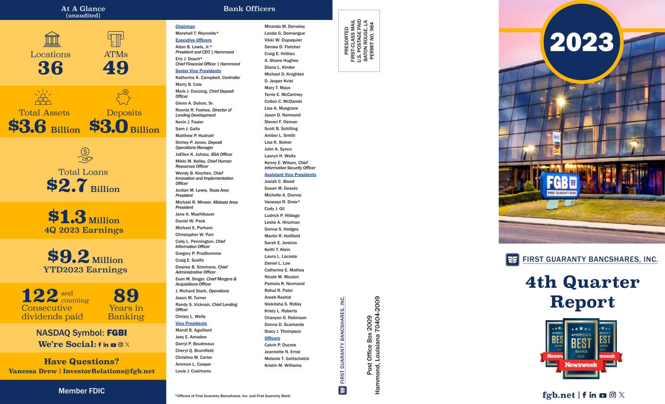 FIRST GUARANTY BANCSHARES, INC. FI R ST G UA R A N TY B A N CS H A R ES , I N C. Po st O ffi ce B ox 2 00 9 H am m on d, L ou is ia na 7 04 04 -2 00 9 PR ES O R TE D FI R ST -C LA SS M A IL U. S. P O ST AG E PA ID B AT O N R O UG E, L A PE R M IT N O . 9 84 At A Glance (unaudited) Bank Officers Total Assets $3.6 Billion Deposits $3.0 Billion 4th Quarter Report fgb.net | Locations 36 ATMs 49 $1.3 Million 4Q 2023 Earnings $9.2 Million YTD2023 Earnings 122 Consecutive dividends paid and counting 89 Years in Banking Total Loans $2.7 Billion Member FDIC NASDAQ Symbol: FGBI Have Questions? Vanessa Drew | InvestorRelations@fgb.net We’re Social: *Officers of First Guaranty Bancshares, Inc. and First Guaranty Bank Chairman Marshall T. Reynolds* Executive Officers Alton B. Lewis, Jr.* President and CEO | Hammond Eric J. Dosch* Chief Financial Officer | Hammond Senior Vice Presidents Katherine K. Campbell, Controller Marty B. Cole Mark J. Ducoing, Chief Deposit Officer Glenn A. Duhon, Sr. Ronnie R. Foshee, Director of Lending Development Kevin J. Foster Sam J. Gallo Matthew P. Hudnall Shirley P. Jones, Deposit Operations Manager JoEllen K. Juhasz, BSA Officer Mikki M. Kelley, Chief Human Resources Officer Wendy B. Kinchen, Chief Innovation and Implementation Officer Jordan M. Lewis, Texas Area President Michael R. Mineer, Mideast Area President Jane A. Muehlbauer Daniel W. Pack Michael E. Parham Christopher W. Parr Coby L. Pennington, Chief Information Officer Gregory P. Prudhomme Craig E. Scelfo Desiree B. Simmons, Chief Administrative Officer Evan M. Singer, Chief Mergers & Acquisitions Officer J. Richard Stark, Operations Jason M. Turner Randy S. Vicknair, Chief Lending Officer Christy L. Wells Vice Presidents Mandi B. Aguillard Joey E. Amadeo Darryl P. Boudreaux Cheryl Q. Brumfield Christina M. Carter Ammon L. Cooper Louis J. Cusimano Miranda M. Derveloy Landa G. Domangue Vikki W. Dupaquier Denise D. Fletcher Craig E. Hriblan A. Shane Hughes Diana L. Kinder Michael D. Knighten D. Jesper Kvist Mary T. Mayo Terrie E. McCartney Colton C. McDaniel Lisa A. Musgrave Jason D. Normand Steven F. Osman Scott B. Schilling Amber L. Smith Lisa K. Stoker John A. Synco Lauryn H. Waits Kenny E. Wilson, Chief Information Security Officer Assistant Vice Presidents Josiah C. Blood Susan M. Desoto Michelle A. Dionne Vanessa R. Drew* Cody J. Gil Ludrick P. Hildago Leslie A. Hinzman Donna S. Hodges Martin R. Holifield Sarah E. Jenkins Keith T. Klein Laura L. Lacoste Daniel L. Loe Catherine E. Mathes Nicole M. Mouton Pamela R. Normand Rahul R. Patel Areeb Rashid Niekitsha S. Ridley Kristy L. Roberts Chanyon O. Robinson Donna D. Scamardo Stacy J. Thompson Officers Calvin P. Ducote Jeannette N. Ernst Melanie T. Gottschalck Kristin M. Williams 2023