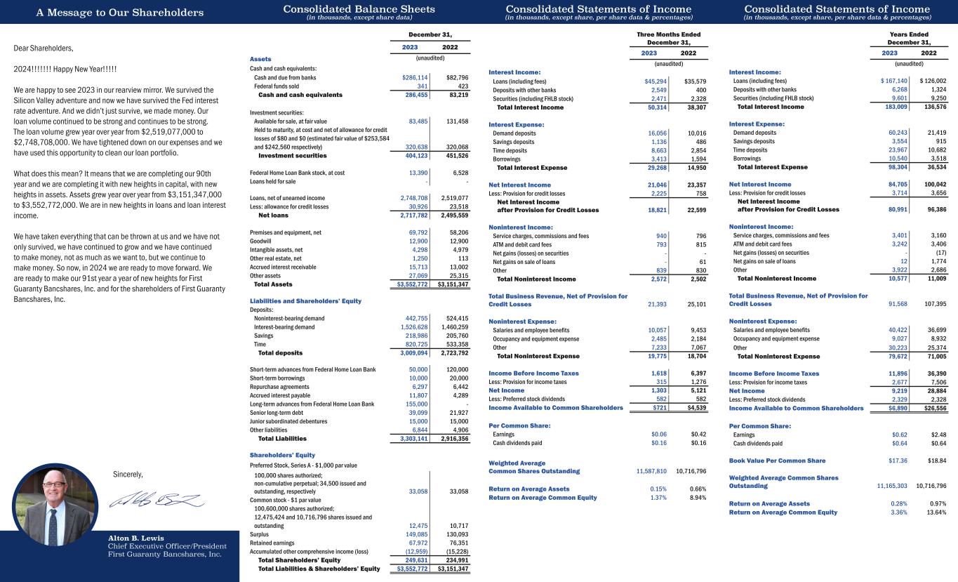A Message to Our Shareholders Consolidated Balance Sheets (in thousands, except share data) Consolidated Statements of Income (in thousands, except share, per share data & percentages) Consolidated Statements of Income (in thousands, except share, per share data & percentages) Years Ended December 31, 2023 2022 (unaudited) Interest Income: Loans (including fees) $ 167,140 $ 126,002 Deposits with other banks 6,268 1,324 Securities (including FHLB stock) 9,601 9,250 Total Interest Income 183,009 136,576 Interest Expense: Demand deposits 60,243 21,419 Savings deposits 3,554 915 Time deposits 23,967 10,682 Borrowings 10,540 3,518 Total Interest Expense 98,304 36,534 Net Interest Income 84,705 100,042 Less: Provision for credit losses 3,714 3,656 Net Interest Income after Provision for Credit Losses 80,991 96,386 Noninterest Income: Service charges, commissions and fees 3,401 3,160 ATM and debit card fees 3,242 3,406 Net gains (losses) on securities - (17) Net gains on sale of loans 12 1,774 Other 3,922 2,686 Total Noninterest Income 10,577 11,009 Total Business Revenue, Net of Provision for Credit Losses 91,568 107,395 Noninterest Expense: Salaries and employee benefits 40,422 36,699 Occupancy and equipment expense 9,027 8,932 Other 30,223 25,374 Total Noninterest Expense 79,672 71,005 Income Before Income Taxes 11,896 36,390 Less: Provision for income taxes 2,677 7,506 Net Income 9,219 28,884 Less: Preferred stock dividends 2,329 2,328 Income Available to Common Shareholders $6,890 $26,556 Per Common Share: Earnings $0.62 $2.48 Cash dividends paid $0.64 $0.64 Book Value Per Common Share $17.36 $18.84 Weighted Average Common Shares Outstanding 11,165,303 10,716,796 Return on Average Assets 0.28% 0.97% Return on Average Common Equity 3.36% 13.64% Dear Shareholders, 2024!!!!!!! Happy New Year!!!!! We are happy to see 2023 in our rearview mirror. We survived the Silicon Valley adventure and now we have survived the Fed interest rate adventure. And we didn’t just survive, we made money. Our loan volume continued to be strong and continues to be strong. The loan volume grew year over year from $2,519,077,000 to $2,748,708,000. We have tightened down on our expenses and we have used this opportunity to clean our loan portfolio. What does this mean? It means that we are completing our 90th year and we are completing it with new heights in capital, with new heights in assets. Assets grew year over year from $3,151,347,000 to $3,552,772,000. We are in new heights in loans and loan interest income. We have taken everything that can be thrown at us and we have not only survived, we have continued to grow and we have continued to make money, not as much as we want to, but we continue to make money. So now, in 2024 we are ready to move forward. We are ready to make our 91st year a year of new heights for First Guaranty Bancshares, Inc. and for the shareholders of First Guaranty Bancshares, Inc. Alton B. Lewis Chief Executive Officer/President First Guaranty Bancshares, Inc. Assets Cash and cash equivalents: Cash and due from banks $286,114 $82,796 Federal funds sold 341 423 Cash and cash equivalents 286,455 83,219 Investment securities: Available for sale, at fair value 83,485 131,458 Held to maturity, at cost and net of allowance for credit losses of $80 and $0 (estimated fair value of $253,584 and $242,560 respectively) 320,638 320,068 Investment securities 404,123 451,526 Federal Home Loan Bank stock, at cost 13,390 6,528 Loans held for sale - - Loans, net of unearned income 2,748,708 2,519,077 Less: allowance for credit losses 30,926 23,518 Net loans 2,717,782 2,495,559 Premises and equipment, net 69,792 58,206 Goodwill 12,900 12,900 Intangible assets, net 4,298 4,979 Other real estate, net 1,250 113 Accrued interest receivable 15,713 13,002 Other assets 27,069 25,315 Total Assets $3,552,772 $3,151,347 Liabilities and Shareholders’ Equity Deposits: Noninterest-bearing demand 442,755 524,415 Interest-bearing demand 1,526,628 1,460,259 Savings 218,986 205,760 Time 820,725 533,358 Total deposits 3,009,094 2,723,792 Short-term advances from Federal Home Loan Bank 50,000 120,000 Short-term borrowings 10,000 20,000 Repurchase agreements 6,297 6,442 Accrued interest payable 11,807 4,289 Long-term advances from Federal Home Loan Bank 155,000 - Senior long-term debt 39,099 21,927 Junior subordinated debentures 15,000 15,000 Other liabilities 6,844 4,906 Total Liabilities 3,303,141 2,916,356 Shareholders’ Equity Preferred Stock, Series A - $1,000 par value 100,000 shares authorized; non-cumulative perpetual; 34,500 issued and outstanding, respectively 33,058 33,058 Common stock - $1 par value 100,600,000 shares authorized; 12,475,424 and 10,716,796 shares issued and outstanding 12,475 10,717 Surplus 149,085 130,093 Retained earnings 67,972 76,351 Accumulated other comprehensive income (loss) (12,959) (15,228) Total Shareholders’ Equity 249,631 234,991 Total Liabilities & Shareholders’ Equity $3,552,772 $3,151,347 Three Months Ended December 31, 2023 2022 (unaudited) Interest Income: Loans (including fees) $45,294 $35,579 Deposits with other banks 2,549 400 Securities (including FHLB stock) 2,471 2,328 Total Interest Income 50,314 38,307 Interest Expense: Demand deposits 16,056 10,016 Savings deposits 1,136 486 Time deposits 8,663 2,854 Borrowings 3,413 1,594 Total Interest Expense 29,268 14,950 Net Interest Income 21,046 23,357 Less: Provision for credit losses 2,225 758 Net Interest Income after Provision for Credit Losses 18,821 22,599 Noninterest Income: Service charges, commissions and fees 940 796 ATM and debit card fees 793 815 Net gains (losses) on securities - - Net gains on sale of loans - 61 Other 839 830 Total Noninterest Income 2,572 2,502 Total Business Revenue, Net of Provision for Credit Losses 21,393 25,101 Noninterest Expense: Salaries and employee benefits 10,057 9,453 Occupancy and equipment expense 2,485 2,184 Other 7,233 7,067 Total Noninterest Expense 19,775 18,704 Income Before