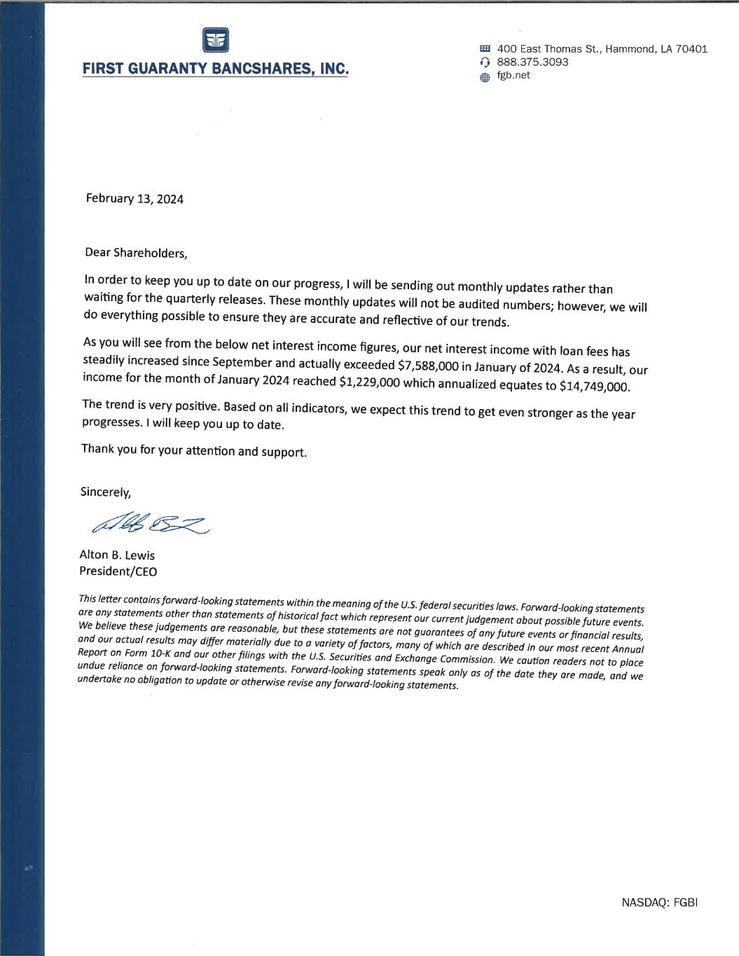 EX-99.1 2 fgbi-ex991januarylettert.htm EX-99.1 LETTER TO SHAREHOLDERS fgbi-ex991januarylettert