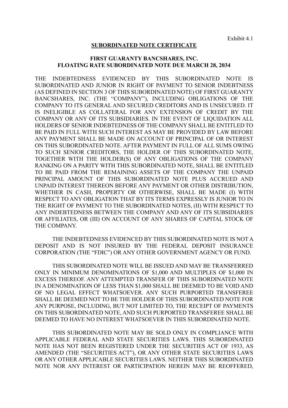 Exhibit 4.1 SUBORDINATED NOTE CERTIFICATE FIRST GUARANTY BANCSHARES, INC. FLOATING RATE SUBORDINATED NOTE DUE MARCH 28, 2034 THE INDEBTEDNESS EVIDENCED BY THIS SUBORDINATED NOTE IS SUBORDINATED AND JUNIOR IN RIGHT OF PAYMENT TO SENIOR INDEBTNESS (AS DEFINED IN SECTION 3 OF THIS SUBORDINATED NOTE) OF FIRST GUARANTY BANCSHARES, INC. (THE “COMPANY”), INCLUDING OBLIGATIONS OF THE COMPANY TO ITS GENERAL AND SECURED CREDITORS AND IS UNSECURED. IT IS INELIGIBLE AS COLLATERAL FOR ANY EXTENSION OF CREDIT BY THE COMPANY OR ANY OF ITS SUBSIDIARIES. IN THE EVENT OF LIQUIDATION ALL HOLDERS OF SENIOR INDEBTEDNESS OF THE COMPANY SHALL BE ENTITLED TO BE PAID IN FULL WITH SUCH INTEREST AS MAY BE PROVIDED BY LAW BEFORE ANY PAYMENT SHALL BE MADE ON ACCOUNT OF PRINCIPAL OF OR INTEREST ON THIS SUBORDINATED NOTE. AFTER PAYMENT IN FULL OF ALL SUMS OWING TO SUCH SENIOR CREDITORS, THE HOLDER OF THIS SUBORDINATED NOTE, TOGETHER WITH THE HOLDER(S) OF ANY OBLIGATIONS OF THE COMPANY RANKING ON A PARITY WITH THIS SUBORDINATED NOTE, SHALL BE ENTITLED TO BE PAID FROM THE REMAINING ASSETS OF THE COMPANY THE UNPAID PRINCIPAL AMOUNT OF THIS SUBORDINATED NOTE PLUS ACCRUED AND UNPAID INTEREST THEREON BEFORE ANY PAYMENT OR OTHER DISTRIBUTION, WHETHER IN CASH, PROPERTY OR OTHERWISE, SHALL BE MADE (I) WITH RESPECT TO ANY OBLIGATION THAT BY ITS TERMS EXPRESSLY IS JUNIOR TO IN THE RIGHT OF PAYMENT TO THE SUBORDINATED NOTES, (II) WITH RESPECT TO ANY INDEBTEDNESS BETWEEN THE COMPANY AND ANY OF ITS SUBSIDIARIES OR AFFILIATES, OR (III) ON ACCOUNT OF ANY SHARES OF CAPITAL STOCK OF THE COMPANY. THE INDEBTEDNESS EVIDENCED BY THIS SUBORDINATED NOTE IS NOT A DEPOSIT AND IS NOT INSURED BY THE FEDERAL DEPOSIT INSURANCE CORPORATION (THE “FDIC”) OR ANY OTHER GOVERNMENT AGENCY OR FUND. THIS SUBORDINATED NOTE WILL BE ISSUED AND MAY BE TRANSFERRED ONLY IN MINIMUM DENOMINATIONS OF $1,000 AND MULTIPLES OF $1,000 IN EXCESS THEREOF. ANY ATTEMPTED TRANSFER OF THIS SUBORDINATED NOTE IN A DENOMINATION OF LESS THAN $1,000 SHALL BE DEEMED TO BE VOID AND OF NO LEGAL EFFECT WHATSOEVER. ANY SUCH PURPORTED TRANSFEREE SHALL BE DEEMED NOT TO BE THE HOLDER OF THIS SUBORDINATED NOTE FOR ANY PURPOSE, INCLUDING, BUT NOT LIMITED TO, THE RECEIPT OF PAYMENTS ON THIS SUBORDINATED NOTE, AND SUCH PURPORTED TRANSFEREE SHALL BE DEEMED TO HAVE NO INTEREST WHATSOEVER IN THIS SUBORDINATED NOTE. THIS SUBORDINATED NOTE MAY BE SOLD ONLY IN COMPLIANCE WITH APPLICABLE FEDERAL AND STATE SECURITIES LAWS. THIS SUBORDINATED NOTE HAS NOT BEEN REGISTERED UNDER THE SECURITIES ACT OF 1933, AS AMENDED (THE “SECURITIES ACT”), OR ANY OTHER STATE SECURITIES LAWS OR ANY OTHER APPLICABLE SECURITIES LAWS. NEITHER THIS SUBORDINATED NOTE NOR ANY INTEREST OR PARTICIPATION HEREIN MAY BE REOFFERED,