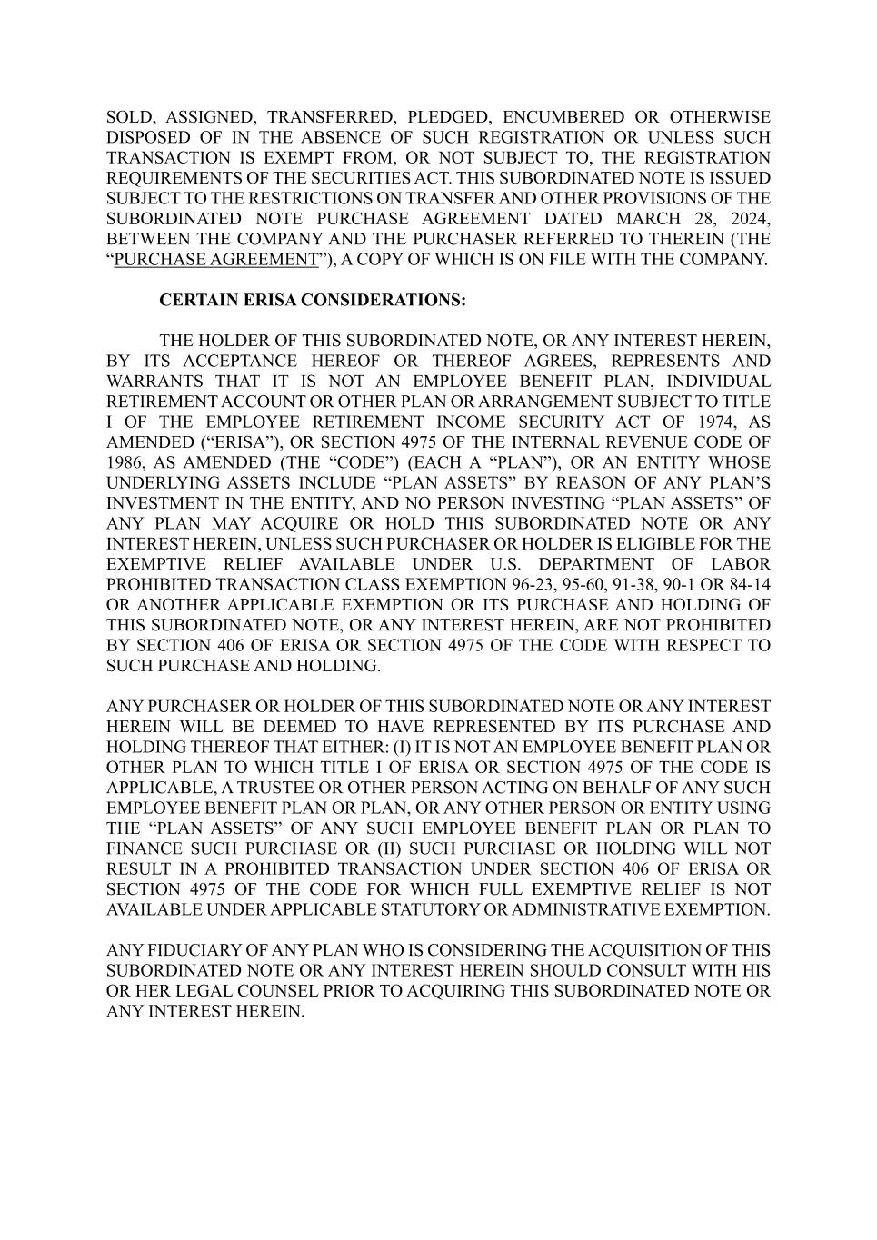 SOLD, ASSIGNED, TRANSFERRED, PLEDGED, ENCUMBERED OR OTHERWISE DISPOSED OF IN THE ABSENCE OF SUCH REGISTRATION OR UNLESS SUCH TRANSACTION IS EXEMPT FROM, OR NOT SUBJECT TO, THE REGISTRATION REQUIREMENTS OF THE SECURITIES ACT. THIS SUBORDINATED NOTE IS ISSUED SUBJECT TO THE RESTRICTIONS ON TRANSFER AND OTHER PROVISIONS OF THE SUBORDINATED NOTE PURCHASE AGREEMENT DATED MARCH 28, 2024, BETWEEN THE COMPANY AND THE PURCHASER REFERRED TO THEREIN (THE “PURCHASE AGREEMENT”), A COPY OF WHICH IS ON FILE WITH THE COMPANY. CERTAIN ERISA CONSIDERATIONS: THE HOLDER OF THIS SUBORDINATED NOTE, OR ANY INTEREST HEREIN, BY ITS ACCEPTANCE HEREOF OR THEREOF AGREES, REPRESENTS AND WARRANTS THAT IT IS NOT AN EMPLOYEE BENEFIT PLAN, INDIVIDUAL RETIREMENT ACCOUNT OR OTHER PLAN OR ARRANGEMENT SUBJECT TO TITLE I OF THE EMPLOYEE RETIREMENT INCOME SECURITY ACT OF 1974, AS AMENDED (“ERISA”), OR SECTION 4975 OF THE INTERNAL REVENUE CODE OF 1986, AS AMENDED (THE “CODE”) (EACH A “PLAN”), OR AN ENTITY WHOSE UNDERLYING ASSETS INCLUDE “PLAN ASSETS” BY REASON OF ANY PLAN’S INVESTMENT IN THE ENTITY, AND NO PERSON INVESTING “PLAN ASSETS” OF ANY PLAN MAY ACQUIRE OR HOLD THIS SUBORDINATED NOTE OR ANY INTEREST HEREIN, UNLESS SUCH PURCHASER OR HOLDER IS ELIGIBLE FOR THE EXEMPTIVE RELIEF AVAILABLE UNDER U.S. DEPARTMENT OF LABOR PROHIBITED TRANSACTION CLASS EXEMPTION 96-23, 95-60, 91-38, 90-1 OR 84-14 OR ANOTHER APPLICABLE EXEMPTION OR ITS PURCHASE AND HOLDING OF THIS SUBORDINATED NOTE, OR ANY INTEREST HEREIN, ARE NOT PROHIBITED BY SECTION 406 OF ERISA OR SECTION 4975 OF THE CODE WITH RESPECT TO SUCH PURCHASE AND HOLDING. ANY PURCHASER OR HOLDER OF THIS SUBORDINATED NOTE OR ANY INTEREST HEREIN WILL BE DEEMED TO HAVE REPRESENTED BY ITS PURCHASE AND HOLDING THEREOF THAT EITHER: (I) IT IS NOT AN EMPLOYEE BENEFIT PLAN OR OTHER PLAN TO WHICH TITLE I OF ERISA OR SECTION 4975 OF THE CODE IS APPLICABLE, A TRUSTEE OR OTHER PERSON ACTING ON BEHALF OF ANY SUCH EMPLOYEE BENEFIT PLAN OR PLAN, OR ANY OTHER PERSON OR ENTITY USING THE “PLAN ASSETS” OF ANY SUCH EMPLOYEE BENEFIT PLAN OR PLAN TO FINANCE SUCH PURCHASE OR (II) SUCH PURCHASE OR HOLDING WILL NOT RESULT IN A PROHIBITED TRANSACTION UNDER SECTION 406 OF ERISA OR SECTION 4975 OF THE CODE FOR WHICH FULL EXEMPTIVE RELIEF IS NOT AVAILABLE UNDER APPLICABLE STATUTORY OR ADMINISTRATIVE EXEMPTION. ANY FIDUCIARY OF ANY PLAN WHO IS CONSIDERING THE ACQUISITION OF THIS SUBORDINATED NOTE OR ANY INTEREST HEREIN SHOULD CONSULT WITH HIS OR HER LEGAL COUNSEL PRIOR TO ACQUIRING THIS SUBORDINATED NOTE OR ANY INTEREST HEREIN.