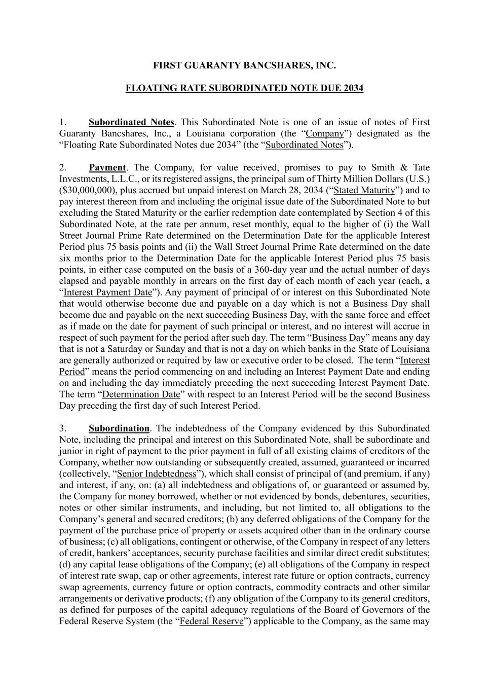 FIRST GUARANTY BANCSHARES, INC. FLOATING RATE SUBORDINATED NOTE DUE 2034 1. Subordinated Notes. This Subordinated Note is one of an issue of notes of First Guaranty Bancshares, Inc., a Louisiana corporation (the “Company”) designated as the “Floating Rate Subordinated Notes due 2034” (the “Subordinated Notes”). 2. Payment. The Company, for value received, promises to pay to Smith & Tate Investments, L.L.C., or its registered assigns, the principal sum of Thirty Million Dollars (U.S.) ($30,000,000), plus accrued but unpaid interest on March 28, 2034 (“Stated Maturity”) and to pay interest thereon from and including the original issue date of the Subordinated Note to but excluding the Stated Maturity or the earlier redemption date contemplated by Section 4 of this Subordinated Note, at the rate per annum, reset monthly, equal to the higher of (i) the Wall Street Journal Prime Rate determined on the Determination Date for the applicable Interest Period plus 75 basis points and (ii) the Wall Street Journal Prime Rate determined on the date six months prior to the Determination Date for the applicable Interest Period plus 75 basis points, in either case computed on the basis of a 360-day year and the actual number of days elapsed and payable monthly in arrears on the first day of each month of each year (each, a “Interest Payment Date”). Any payment of principal of or interest on this Subordinated Note that would otherwise become due and payable on a day which is not a Business Day shall become due and payable on the next succeeding Business Day, with the same force and effect as if made on the date for payment of such principal or interest, and no interest will accrue in respect of such payment for the period after such day. The term “Business Day” means any day that is not a Saturday or Sunday and that is not a day on which banks in the State of Louisiana are generally authorized or required by law or executive order to be closed. The term “Interest Period” means the period commencing on and including an Interest Payment Date and ending on and including the day immediately preceding the next succeeding Interest Payment Date. The term “Determination Date” with respect to an Interest Period will be the second Business Day preceding the first day of such Interest Period. 3. Subordination. The indebtedness of the Company evidenced by this Subordinated Note, including the principal and interest on this Subordinated Note, shall be subordinate and junior in right of payment to the prior payment in full of all existing claims of creditors of the Company, whether now outstanding or subsequently created, assumed, guaranteed or incurred (collectively, “Senior Indebtedness”), which shall consist of principal of (and premium, if any) and interest, if any, on: (a) all indebtedness and obligations of, or guaranteed or assumed by, the Company for money borrowed, whether or not evidenced by bonds, debentures, securities, notes or other similar instruments, and including, but not limited to, all obligations to the Company’s general and secured creditors; (b) any deferred obligations of the Company for the payment of the purchase price of property or assets acquired other than in the ordinary course of business; (c) all obligations, contingent or otherwise, of the Company in respect of any letters of credit, bankers’ acceptances, security purchase facilities and similar direct credit substitutes; (d) any capital lease obligations of the Company; (e) all obligations of the Company in respect of interest rate swap, cap or other agreements, interest rate future or option contracts, currency swap agreements, currency future or option contracts, commodity contracts and other similar arrangements or derivative products; (f) any obligation of the Company to its general creditors, as defined for purposes of the capital adequacy regulations of the Board of Governors of the Federal Reserve System (the “Federal Reserve”) applicable to the Company, as the same may