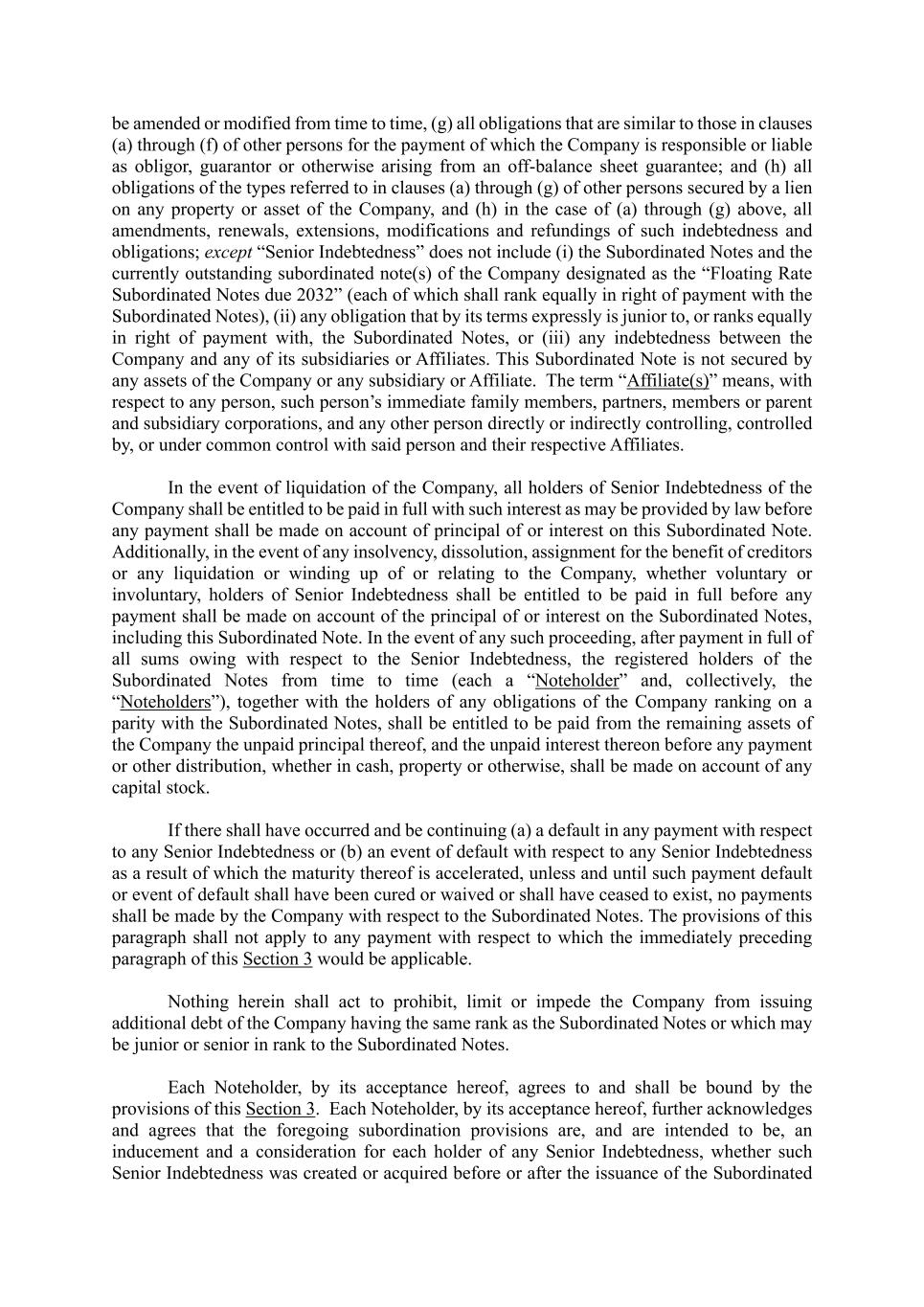 be amended or modified from time to time, (g) all obligations that are similar to those in clauses (a) through (f) of other persons for the payment of which the Company is responsible or liable as obligor, guarantor or otherwise arising from an off-balance sheet guarantee; and (h) all obligations of the types referred to in clauses (a) through (g) of other persons secured by a lien on any property or asset of the Company, and (h) in the case of (a) through (g) above, all amendments, renewals, extensions, modifications and refundings of such indebtedness and obligations; except “Senior Indebtedness” does not include (i) the Subordinated Notes and the currently outstanding subordinated note(s) of the Company designated as the “Floating Rate Subordinated Notes due 2032” (each of which shall rank equally in right of payment with the Subordinated Notes), (ii) any obligation that by its terms expressly is junior to, or ranks equally in right of payment with, the Subordinated Notes, or (iii) any indebtedness between the Company and any of its subsidiaries or Affiliates. This Subordinated Note is not secured by any assets of the Company or any subsidiary or Affiliate. The term “Affiliate(s)” means, with respect to any person, such person’s immediate family members, partners, members or parent and subsidiary corporations, and any other person directly or indirectly controlling, controlled by, or under common control with said person and their respective Affiliates. In the event of liquidation of the Company, all holders of Senior Indebtedness of the Company shall be entitled to be paid in full with such interest as may be provided by law before any payment shall be made on account of principal of or interest on this Subordinated Note. Additionally, in the event of any insolvency, dissolution, assignment for the benefit of creditors or any liquidation or winding up of or relating to the Company, whether voluntary or involuntary, holders of Senior Indebtedness shall be entitled to be paid in full before any payment shall be made on account of the principal of or interest on the Subordinated Notes, including this Subordinated Note. In the event of any such proceeding, after payment in full of all sums owing with respect to the Senior Indebtedness, the registered holders of the Subordinated Notes from time to time (each a “Noteholder” and, collectively, the “Noteholders”), together with the holders of any obligations of the Company ranking on a parity with the Subordinated Notes, shall be entitled to be paid from the remaining assets of the Company the unpaid principal thereof, and the unpaid interest thereon before any payment or other distribution, whether in cash, property or otherwise, shall be made on account of any capital stock. If there shall have occurred and be continuing (a) a default in any payment with respect to any Senior Indebtedness or (b) an event of default with respect to any Senior Indebtedness as a result of which the maturity thereof is accelerated, unless and until such payment default or event of default shall have been cured or waived or shall have ceased to exist, no payments shall be made by the Company with respect to the Subordinated Notes. The provisions of this paragraph shall not apply to any payment with respect to which the immediately preceding paragraph of this Section 3 would be applicable. Nothing herein shall act to prohibit, limit or impede the Company from issuing additional debt of the Company having the same rank as the Subordinated Notes or which may be junior or senior in rank to the Subordinated Notes. Each Noteholder, by its acceptance hereof, agrees to and shall be bound by the provisions of this Section 3. Each Noteholder, by its acceptance hereof, further acknowledges and agrees that the foregoing subordination provisions are, and are intended to be, an inducement and a consideration for each holder of any Senior Indebtedness, whether such Senior Indebtedness was created or acquired before or after the issuance of the Subordinated