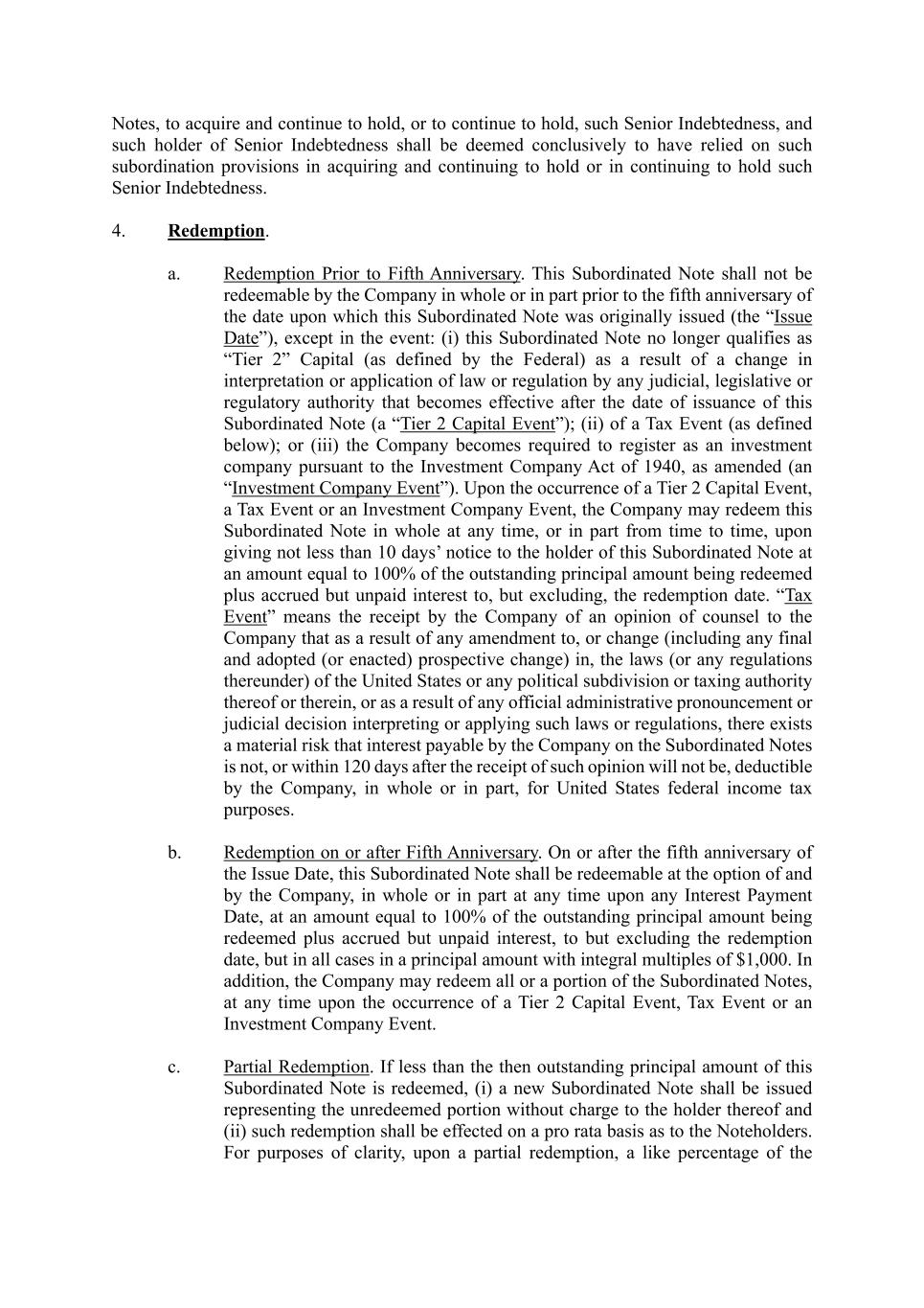Notes, to acquire and continue to hold, or to continue to hold, such Senior Indebtedness, and such holder of Senior Indebtedness shall be deemed conclusively to have relied on such subordination provisions in acquiring and continuing to hold or in continuing to hold such Senior Indebtedness. 4. Redemption. a. Redemption Prior to Fifth Anniversary. This Subordinated Note shall not be redeemable by the Company in whole or in part prior to the fifth anniversary of the date upon which this Subordinated Note was originally issued (the “Issue Date”), except in the event: (i) this Subordinated Note no longer qualifies as “Tier 2” Capital (as defined by the Federal) as a result of a change in interpretation or application of law or regulation by any judicial, legislative or regulatory authority that becomes effective after the date of issuance of this Subordinated Note (a “Tier 2 Capital Event”); (ii) of a Tax Event (as defined below); or (iii) the Company becomes required to register as an investment company pursuant to the Investment Company Act of 1940, as amended (an “Investment Company Event”). Upon the occurrence of a Tier 2 Capital Event, a Tax Event or an Investment Company Event, the Company may redeem this Subordinated Note in whole at any time, or in part from time to time, upon giving not less than 10 days’ notice to the holder of this Subordinated Note at an amount equal to 100% of the outstanding principal amount being redeemed plus accrued but unpaid interest to, but excluding, the redemption date. “Tax Event” means the receipt by the Company of an opinion of counsel to the Company that as a result of any amendment to, or change (including any final and adopted (or enacted) prospective change) in, the laws (or any regulations thereunder) of the United States or any political subdivision or taxing authority thereof or therein, or as a result of any official administrative pronouncement or judicial decision interpreting or applying such laws or regulations, there exists a material risk that interest payable by the Company on the Subordinated Notes is not, or within 120 days after the receipt of such opinion will not be, deductible by the Company, in whole or in part, for United States federal income tax purposes. b. Redemption on or after Fifth Anniversary. On or after the fifth anniversary of the Issue Date, this Subordinated Note shall be redeemable at the option of and by the Company, in whole or in part at any time upon any Interest Payment Date, at an amount equal to 100% of the outstanding principal amount being redeemed plus accrued but unpaid interest, to but excluding the redemption date, but in all cases in a principal amount with integral multiples of $1,000. In addition, the Company may redeem all or a portion of the Subordinated Notes, at any time upon the occurrence of a Tier 2 Capital Event, Tax Event or an Investment Company Event. c. Partial Redemption. If less than the then outstanding principal amount of this Subordinated Note is redeemed, (i) a new Subordinated Note shall be issued representing the unredeemed portion without charge to the holder thereof and (ii) such redemption shall be effected on a pro rata basis as to the Noteholders. For purposes of clarity, upon a partial redemption, a like percentage of the