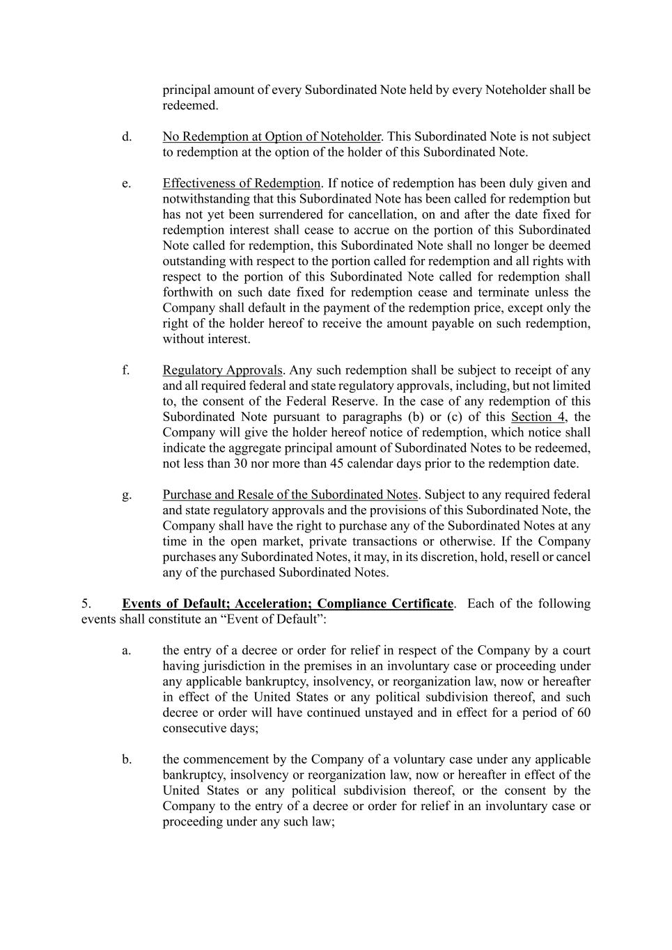 principal amount of every Subordinated Note held by every Noteholder shall be redeemed. d. No Redemption at Option of Noteholder. This Subordinated Note is not subject to redemption at the option of the holder of this Subordinated Note. e. Effectiveness of Redemption. If notice of redemption has been duly given and notwithstanding that this Subordinated Note has been called for redemption but has not yet been surrendered for cancellation, on and after the date fixed for redemption interest shall cease to accrue on the portion of this Subordinated Note called for redemption, this Subordinated Note shall no longer be deemed outstanding with respect to the portion called for redemption and all rights with respect to the portion of this Subordinated Note called for redemption shall forthwith on such date fixed for redemption cease and terminate unless the Company shall default in the payment of the redemption price, except only the right of the holder hereof to receive the amount payable on such redemption, without interest. f. Regulatory Approvals. Any such redemption shall be subject to receipt of any and all required federal and state regulatory approvals, including, but not limited to, the consent of the Federal Reserve. In the case of any redemption of this Subordinated Note pursuant to paragraphs (b) or (c) of this Section 4, the Company will give the holder hereof notice of redemption, which notice shall indicate the aggregate principal amount of Subordinated Notes to be redeemed, not less than 30 nor more than 45 calendar days prior to the redemption date. g. Purchase and Resale of the Subordinated Notes. Subject to any required federal and state regulatory approvals and the provisions of this Subordinated Note, the Company shall have the right to purchase any of the Subordinated Notes at any time in the open market, private transactions or otherwise. If the Company purchases any Subordinated Notes, it may, in its discretion, hold, resell or cancel any of the purchased Subordinated Notes. 5. Events of Default; Acceleration; Compliance Certificate. Each of the following events shall constitute an “Event of Default”: a. the entry of a decree or order for relief in respect of the Company by a court having jurisdiction in the premises in an involuntary case or proceeding under any applicable bankruptcy, insolvency, or reorganization law, now or hereafter in effect of the United States or any political subdivision thereof, and such decree or order will have continued unstayed and in effect for a period of 60 consecutive days; b. the commencement by the Company of a voluntary case under any applicable bankruptcy, insolvency or reorganization law, now or hereafter in effect of the United States or any political subdivision thereof, or the consent by the Company to the entry of a decree or order for relief in an involuntary case or proceeding under any such law;