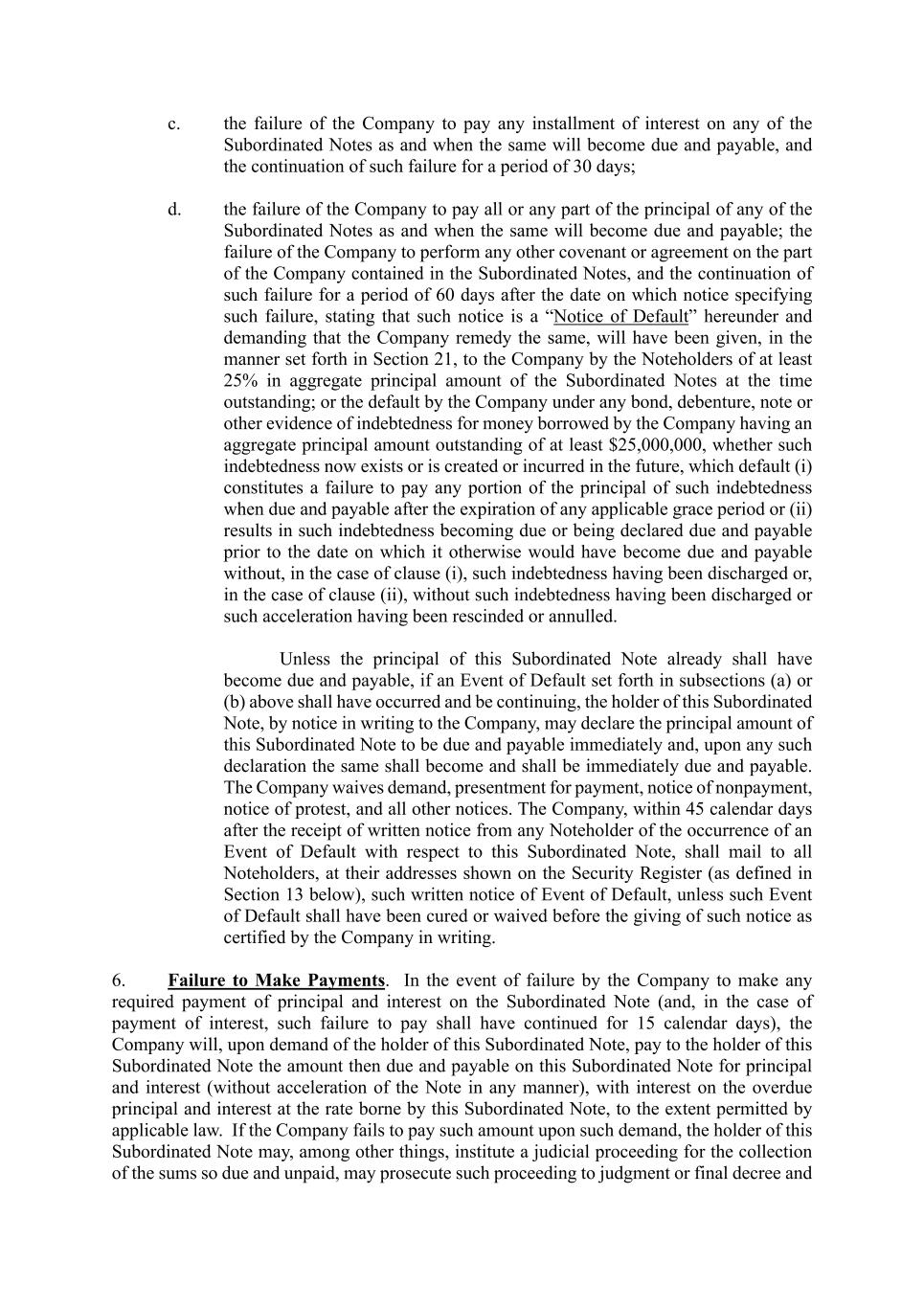 c. the failure of the Company to pay any installment of interest on any of the Subordinated Notes as and when the same will become due and payable, and the continuation of such failure for a period of 30 days; d. the failure of the Company to pay all or any part of the principal of any of the Subordinated Notes as and when the same will become due and payable; the failure of the Company to perform any other covenant or agreement on the part of the Company contained in the Subordinated Notes, and the continuation of such failure for a period of 60 days after the date on which notice specifying such failure, stating that such notice is a “Notice of Default” hereunder and demanding that the Company remedy the same, will have been given, in the manner set forth in Section 21, to the Company by the Noteholders of at least 25% in aggregate principal amount of the Subordinated Notes at the time outstanding; or the default by the Company under any bond, debenture, note or other evidence of indebtedness for money borrowed by the Company having an aggregate principal amount outstanding of at least $25,000,000, whether such indebtedness now exists or is created or incurred in the future, which default (i) constitutes a failure to pay any portion of the principal of such indebtedness when due and payable after the expiration of any applicable grace period or (ii) results in such indebtedness becoming due or being declared due and payable prior to the date on which it otherwise would have become due and payable without, in the case of clause (i), such indebtedness having been discharged or, in the case of clause (ii), without such indebtedness having been discharged or such acceleration having been rescinded or annulled. Unless the principal of this Subordinated Note already shall have become due and payable, if an Event of Default set forth in subsections (a) or (b) above shall have occurred and be continuing, the holder of this Subordinated Note, by notice in writing to the Company, may declare the principal amount of this Subordinated Note to be due and payable immediately and, upon any such declaration the same shall become and shall be immediately due and payable. The Company waives demand, presentment for payment, notice of nonpayment, notice of protest, and all other notices. The Company, within 45 calendar days after the receipt of written notice from any Noteholder of the occurrence of an Event of Default with respect to this Subordinated Note, shall mail to all Noteholders, at their addresses shown on the Security Register (as defined in Section 13 below), such written notice of Event of Default, unless such Event of Default shall have been cured or waived before the giving of such notice as certified by the Company in writing. 6. Failure to Make Payments. In the event of failure by the Company to make any required payment of principal and interest on the Subordinated Note (and, in the case of payment of interest, such failure to pay shall have continued for 15 calendar days), the Company will, upon demand of the holder of this Subordinated Note, pay to the holder of this Subordinated Note the amount then due and payable on this Subordinated Note for principal and interest (without acceleration of the Note in any manner), with interest on the overdue principal and interest at the rate borne by this Subordinated Note, to the extent permitted by applicable law. If the Company fails to pay such amount upon such demand, the holder of this Subordinated Note may, among other things, institute a judicial proceeding for the collection of the sums so due and unpaid, may prosecute such proceeding to judgment or final decree and