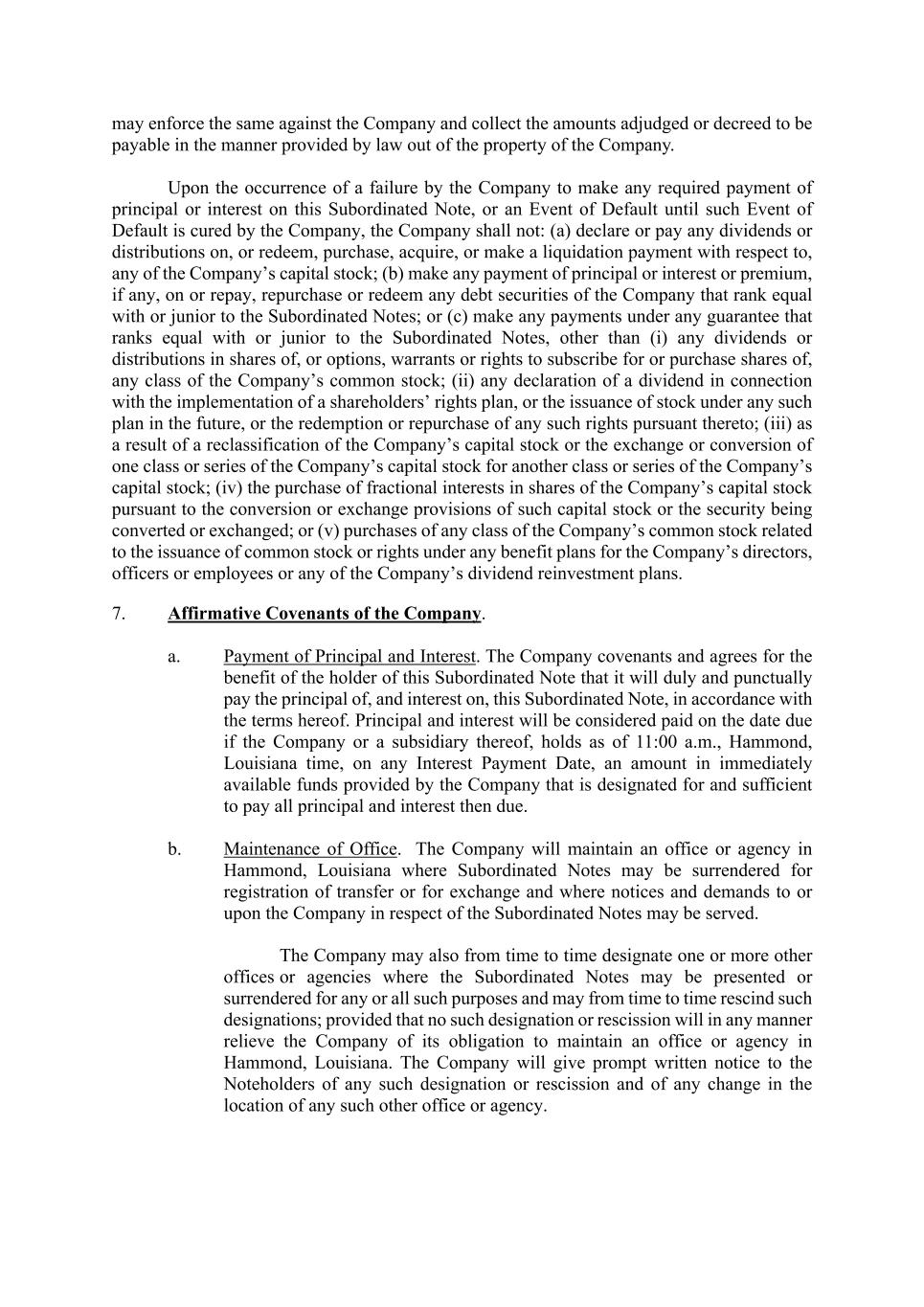 may enforce the same against the Company and collect the amounts adjudged or decreed to be payable in the manner provided by law out of the property of the Company. Upon the occurrence of a failure by the Company to make any required payment of principal or interest on this Subordinated Note, or an Event of Default until such Event of Default is cured by the Company, the Company shall not: (a) declare or pay any dividends or distributions on, or redeem, purchase, acquire, or make a liquidation payment with respect to, any of the Company’s capital stock; (b) make any payment of principal or interest or premium, if any, on or repay, repurchase or redeem any debt securities of the Company that rank equal with or junior to the Subordinated Notes; or (c) make any payments under any guarantee that ranks equal with or junior to the Subordinated Notes, other than (i) any dividends or distributions in shares of, or options, warrants or rights to subscribe for or purchase shares of, any class of the Company’s common stock; (ii) any declaration of a dividend in connection with the implementation of a shareholders’ rights plan, or the issuance of stock under any such plan in the future, or the redemption or repurchase of any such rights pursuant thereto; (iii) as a result of a reclassification of the Company’s capital stock or the exchange or conversion of one class or series of the Company’s capital stock for another class or series of the Company’s capital stock; (iv) the purchase of fractional interests in shares of the Company’s capital stock pursuant to the conversion or exchange provisions of such capital stock or the security being converted or exchanged; or (v) purchases of any class of the Company’s common stock related to the issuance of common stock or rights under any benefit plans for the Company’s directors, officers or employees or any of the Company’s dividend reinvestment plans. 7. Affirmative Covenants of the Company. a. Payment of Principal and Interest. The Company covenants and agrees for the benefit of the holder of this Subordinated Note that it will duly and punctually pay the principal of, and interest on, this Subordinated Note, in accordance with the terms hereof. Principal and interest will be considered paid on the date due if the Company or a subsidiary thereof, holds as of 11:00 a.m., Hammond, Louisiana time, on any Interest Payment Date, an amount in immediately available funds provided by the Company that is designated for and sufficient to pay all principal and interest then due. b. Maintenance of Office. The Company will maintain an office or agency in Hammond, Louisiana where Subordinated Notes may be surrendered for registration of transfer or for exchange and where notices and demands to or upon the Company in respect of the Subordinated Notes may be served. The Company may also from time to time designate one or more other offices or agencies where the Subordinated Notes may be presented or surrendered for any or all such purposes and may from time to time rescind such designations; provided that no such designation or rescission will in any manner relieve the Company of its obligation to maintain an office or agency in Hammond, Louisiana. The Company will give prompt written notice to the Noteholders of any such designation or rescission and of any change in the location of any such other office or agency.