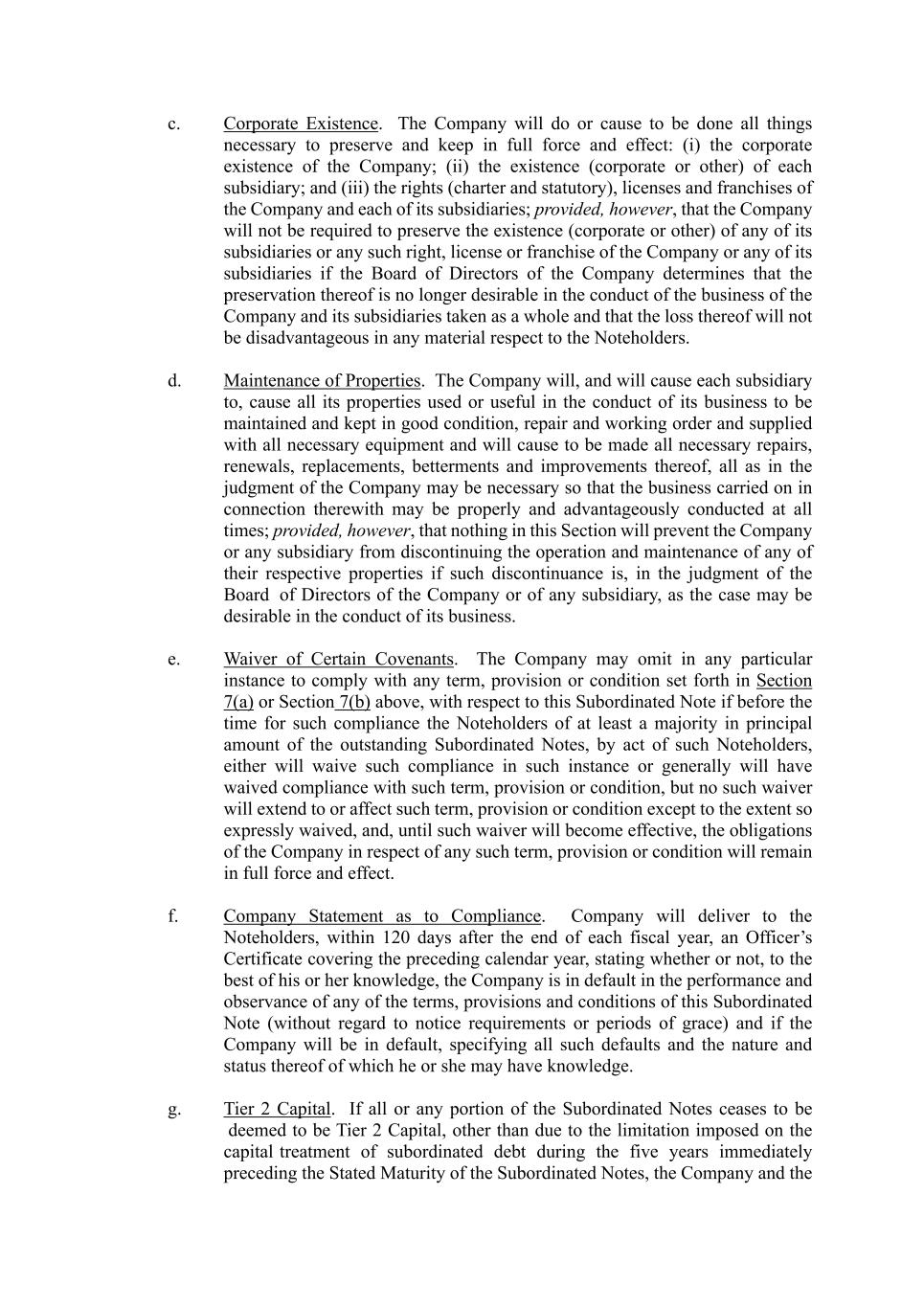 c. Corporate Existence. The Company will do or cause to be done all things necessary to preserve and keep in full force and effect: (i) the corporate existence of the Company; (ii) the existence (corporate or other) of each subsidiary; and (iii) the rights (charter and statutory), licenses and franchises of the Company and each of its subsidiaries; provided, however, that the Company will not be required to preserve the existence (corporate or other) of any of its subsidiaries or any such right, license or franchise of the Company or any of its subsidiaries if the Board of Directors of the Company determines that the preservation thereof is no longer desirable in the conduct of the business of the Company and its subsidiaries taken as a whole and that the loss thereof will not be disadvantageous in any material respect to the Noteholders. d. Maintenance of Properties. The Company will, and will cause each subsidiary to, cause all its properties used or useful in the conduct of its business to be maintained and kept in good condition, repair and working order and supplied with all necessary equipment and will cause to be made all necessary repairs, renewals, replacements, betterments and improvements thereof, all as in the judgment of the Company may be necessary so that the business carried on in connection therewith may be properly and advantageously conducted at all times; provided, however, that nothing in this Section will prevent the Company or any subsidiary from discontinuing the operation and maintenance of any of their respective properties if such discontinuance is, in the judgment of the Board of Directors of the Company or of any subsidiary, as the case may be desirable in the conduct of its business. e. Waiver of Certain Covenants. The Company may omit in any particular instance to comply with any term, provision or condition set forth in Section 7(a) or Section 7(b) above, with respect to this Subordinated Note if before the time for such compliance the Noteholders of at least a majority in principal amount of the outstanding Subordinated Notes, by act of such Noteholders, either will waive such compliance in such instance or generally will have waived compliance with such term, provision or condition, but no such waiver will extend to or affect such term, provision or condition except to the extent so expressly waived, and, until such waiver will become effective, the obligations of the Company in respect of any such term, provision or condition will remain in full force and effect. f. Company Statement as to Compliance. Company will deliver to the Noteholders, within 120 days after the end of each fiscal year, an Officer’s Certificate covering the preceding calendar year, stating whether or not, to the best of his or her knowledge, the Company is in default in the performance and observance of any of the terms, provisions and conditions of this Subordinated Note (without regard to notice requirements or periods of grace) and if the Company will be in default, specifying all such defaults and the nature and status thereof of which he or she may have knowledge. g. Tier 2 Capital. If all or any portion of the Subordinated Notes ceases to be deemed to be Tier 2 Capital, other than due to the limitation imposed on the capital treatment of subordinated debt during the five years immediately preceding the Stated Maturity of the Subordinated Notes, the Company and the
