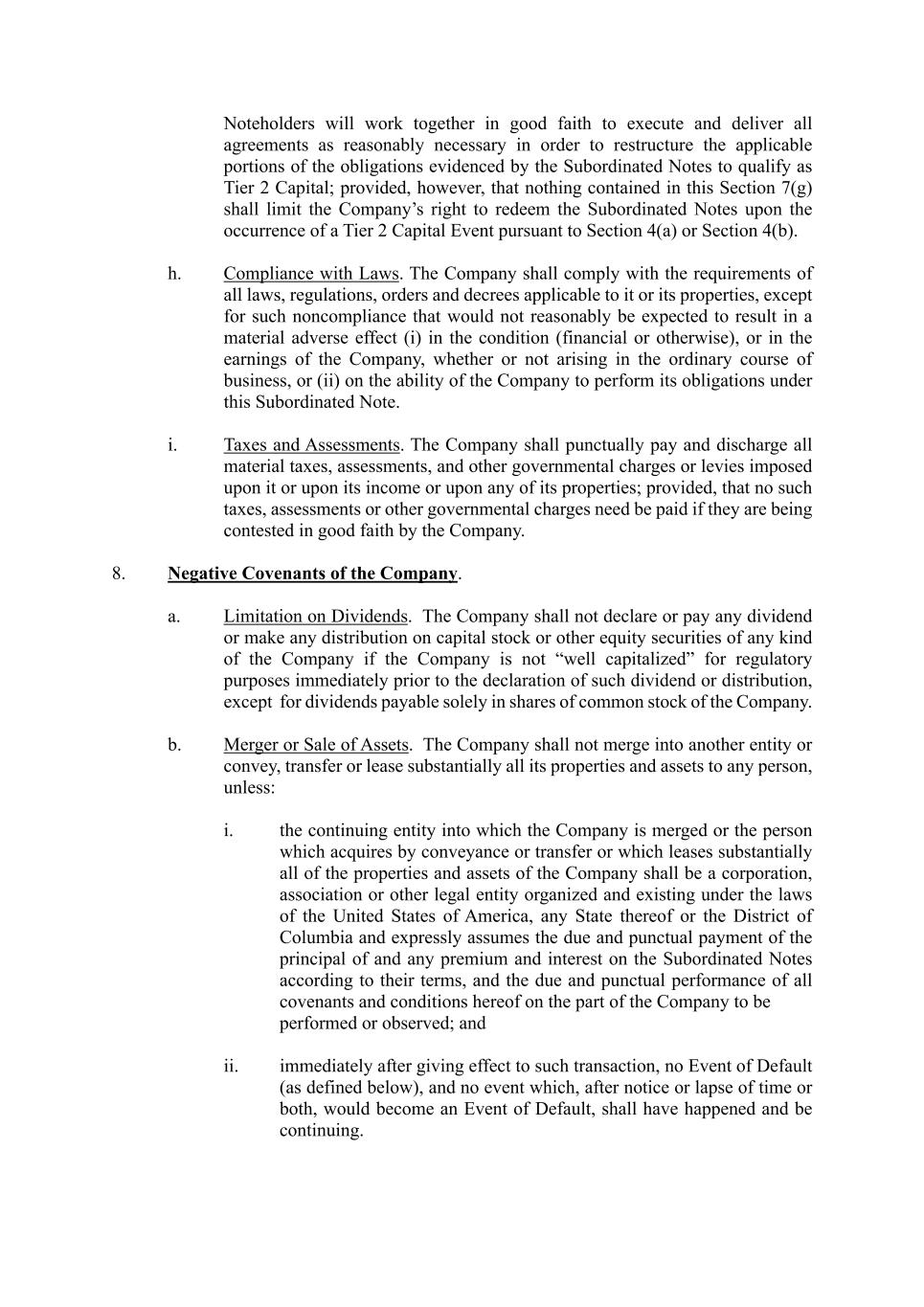 Noteholders will work together in good faith to execute and deliver all agreements as reasonably necessary in order to restructure the applicable portions of the obligations evidenced by the Subordinated Notes to qualify as Tier 2 Capital; provided, however, that nothing contained in this Section 7(g) shall limit the Company’s right to redeem the Subordinated Notes upon the occurrence of a Tier 2 Capital Event pursuant to Section 4(a) or Section 4(b). h. Compliance with Laws. The Company shall comply with the requirements of all laws, regulations, orders and decrees applicable to it or its properties, except for such noncompliance that would not reasonably be expected to result in a material adverse effect (i) in the condition (financial or otherwise), or in the earnings of the Company, whether or not arising in the ordinary course of business, or (ii) on the ability of the Company to perform its obligations under this Subordinated Note. i. Taxes and Assessments. The Company shall punctually pay and discharge all material taxes, assessments, and other governmental charges or levies imposed upon it or upon its income or upon any of its properties; provided, that no such taxes, assessments or other governmental charges need be paid if they are being contested in good faith by the Company. 8. Negative Covenants of the Company. a. Limitation on Dividends. The Company shall not declare or pay any dividend or make any distribution on capital stock or other equity securities of any kind of the Company if the Company is not “well capitalized” for regulatory purposes immediately prior to the declaration of such dividend or distribution, except for dividends payable solely in shares of common stock of the Company. b. Merger or Sale of Assets. The Company shall not merge into another entity or convey, transfer or lease substantially all its properties and assets to any person, unless: i. the continuing entity into which the Company is merged or the person which acquires by conveyance or transfer or which leases substantially all of the properties and assets of the Company shall be a corporation, association or other legal entity organized and existing under the laws of the United States of America, any State thereof or the District of Columbia and expressly assumes the due and punctual payment of the principal of and any premium and interest on the Subordinated Notes according to their terms, and the due and punctual performance of all covenants and conditions hereof on the part of the Company to be performed or observed; and ii. immediately after giving effect to such transaction, no Event of Default (as defined below), and no event which, after notice or lapse of time or both, would become an Event of Default, shall have happened and be continuing.