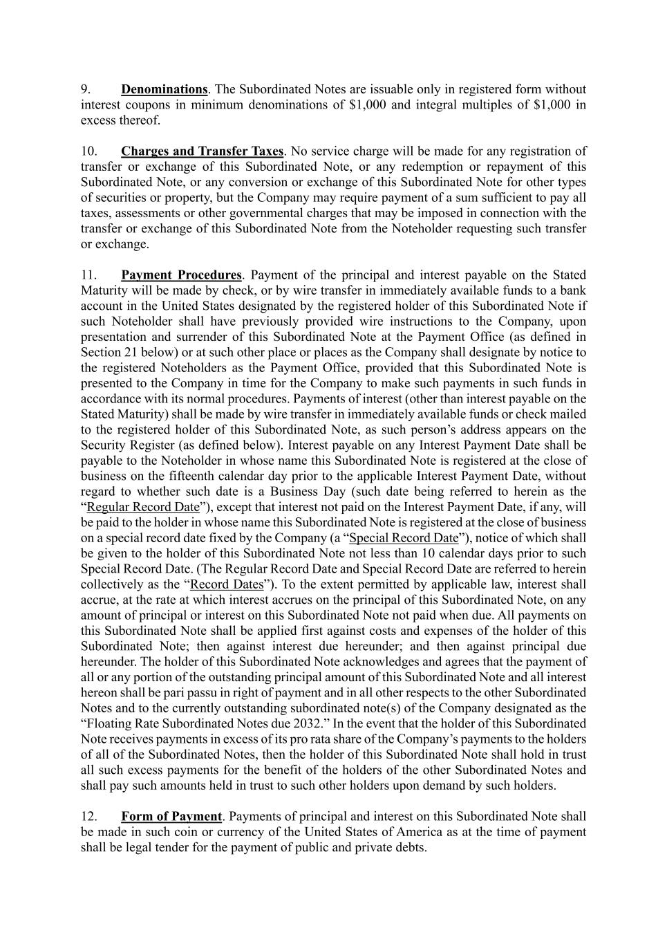9. Denominations. The Subordinated Notes are issuable only in registered form without interest coupons in minimum denominations of $1,000 and integral multiples of $1,000 in excess thereof. 10. Charges and Transfer Taxes. No service charge will be made for any registration of transfer or exchange of this Subordinated Note, or any redemption or repayment of this Subordinated Note, or any conversion or exchange of this Subordinated Note for other types of securities or property, but the Company may require payment of a sum sufficient to pay all taxes, assessments or other governmental charges that may be imposed in connection with the transfer or exchange of this Subordinated Note from the Noteholder requesting such transfer or exchange. 11. Payment Procedures. Payment of the principal and interest payable on the Stated Maturity will be made by check, or by wire transfer in immediately available funds to a bank account in the United States designated by the registered holder of this Subordinated Note if such Noteholder shall have previously provided wire instructions to the Company, upon presentation and surrender of this Subordinated Note at the Payment Office (as defined in Section 21 below) or at such other place or places as the Company shall designate by notice to the registered Noteholders as the Payment Office, provided that this Subordinated Note is presented to the Company in time for the Company to make such payments in such funds in accordance with its normal procedures. Payments of interest (other than interest payable on the Stated Maturity) shall be made by wire transfer in immediately available funds or check mailed to the registered holder of this Subordinated Note, as such person’s address appears on the Security Register (as defined below). Interest payable on any Interest Payment Date shall be payable to the Noteholder in whose name this Subordinated Note is registered at the close of business on the fifteenth calendar day prior to the applicable Interest Payment Date, without regard to whether such date is a Business Day (such date being referred to herein as the “Regular Record Date”), except that interest not paid on the Interest Payment Date, if any, will be paid to the holder in whose name this Subordinated Note is registered at the close of business on a special record date fixed by the Company (a “Special Record Date”), notice of which shall be given to the holder of this Subordinated Note not less than 10 calendar days prior to such Special Record Date. (The Regular Record Date and Special Record Date are referred to herein collectively as the “Record Dates”). To the extent permitted by applicable law, interest shall accrue, at the rate at which interest accrues on the principal of this Subordinated Note, on any amount of principal or interest on this Subordinated Note not paid when due. All payments on this Subordinated Note shall be applied first against costs and expenses of the holder of this Subordinated Note; then against interest due hereunder; and then against principal due hereunder. The holder of this Subordinated Note acknowledges and agrees that the payment of all or any portion of the outstanding principal amount of this Subordinated Note and all interest hereon shall be pari passu in right of payment and in all other respects to the other Subordinated Notes and to the currently outstanding subordinated note(s) of the Company designated as the “Floating Rate Subordinated Notes due 2032.” In the event that the holder of this Subordinated Note receives payments in excess of its pro rata share of the Company’s payments to the holders of all of the Subordinated Notes, then the holder of this Subordinated Note shall hold in trust all such excess payments for the benefit of the holders of the other Subordinated Notes and shall pay such amounts held in trust to such other holders upon demand by such holders. 12. Form of Payment. Payments of principal and interest on this Subordinated Note shall be made in such coin or currency of the United States of America as at the time of payment shall be legal tender for the payment of public and private debts.